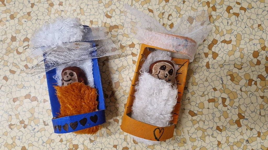 Kaštanovým miminkům jsme z roličky postavili kolébky a vystlali je polštářky a peřinkami.