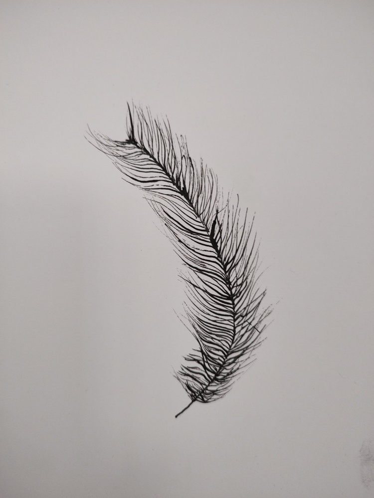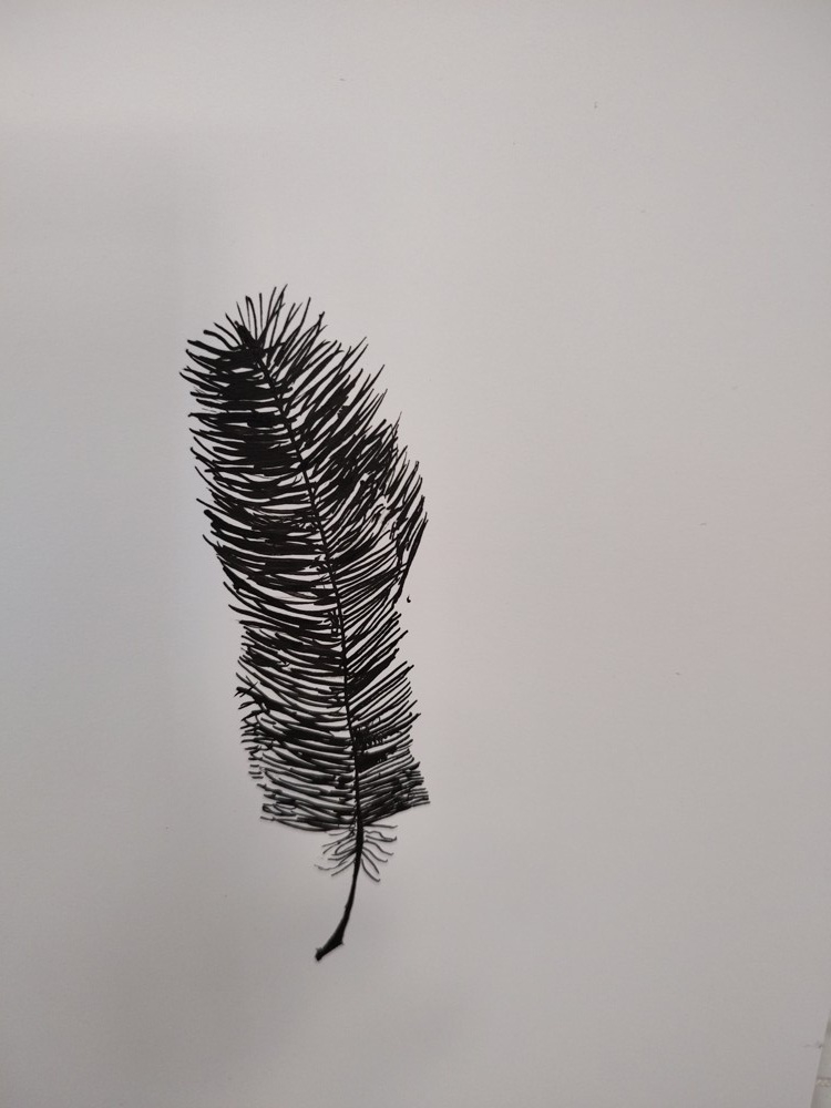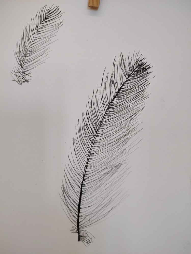 Podle kresby zkusili vytvořit linie a tvar peříčka technikou linorytu. Ten potom otiskovali v různě uspořádaných kompozicích a v různých barevných variantách.