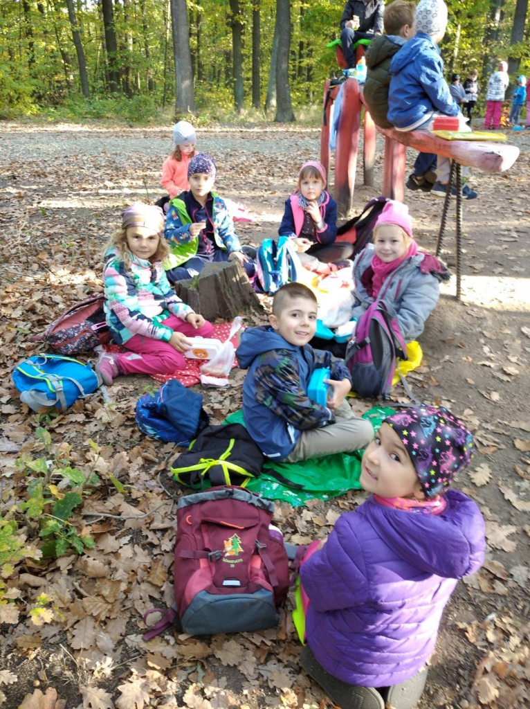 My jsem stromy sice nesázeli, to si necháme na jaro, ale vydali jsem se do lesa za panem hajným = lesníkem, abychom se seznámili s názvy stromů, které rostou v našem lese na Réně a dozvěděli se, jak  o ně pečovat. Náš cíl bylo zastavení U Lišky, tam jsme se nasvačili, opekli špekáčky a zahráli hru “ Poraď se a řekni odpověď“.