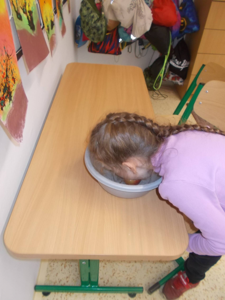 Ten, kdo byl v hodině nejpozornější, dostal příležitost si vyzkoušet i APPLE BOBBING. Lovení jablek na vodní hladině je oblíbenou hrou v době HALLOWEENU. Ovšem vylovit jablko ústy bez pomoci rukou nebylo vůbec snadné.
