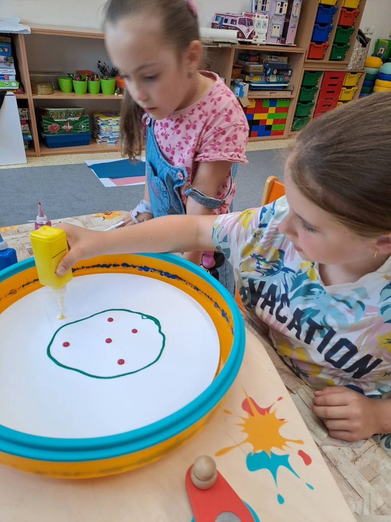 Po roztočení kruhu přišla na řadu finální úprava obrázků. S špachtlí v ruce děti obrázky doladily, přidávaly detaily a vylepšovaly tak své výtvarné nápady. Každý obrázek se tak stal originálním uměleckým dílem.