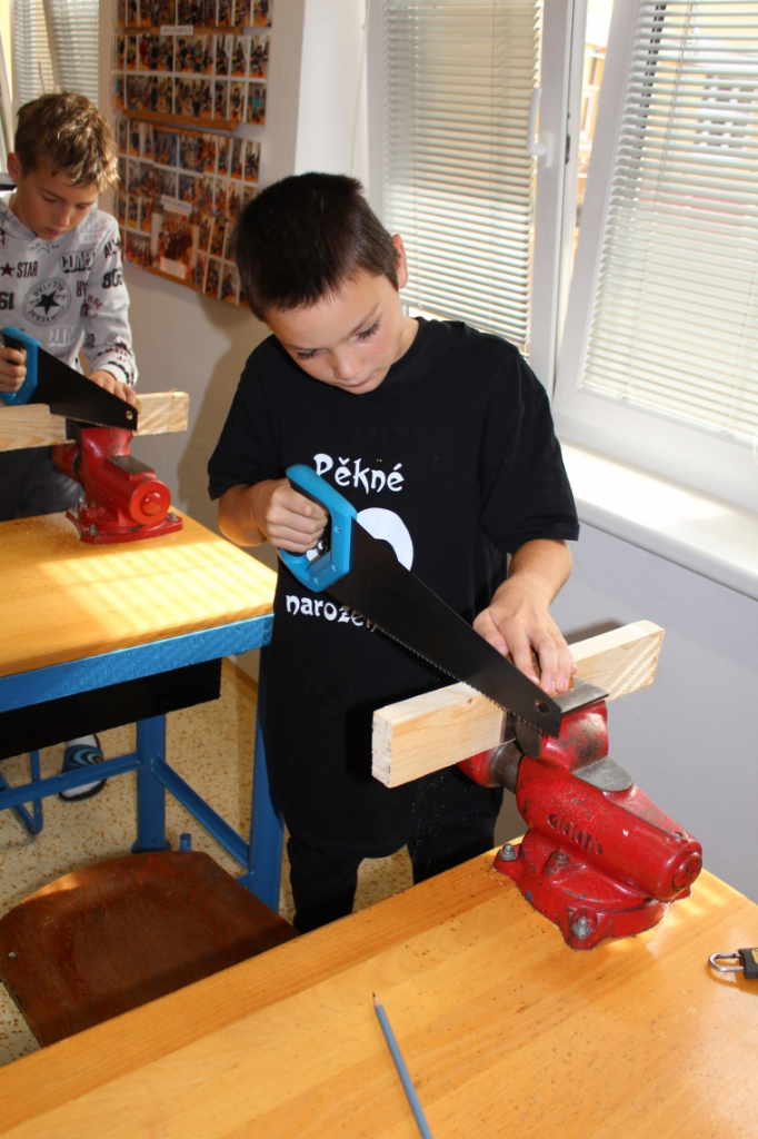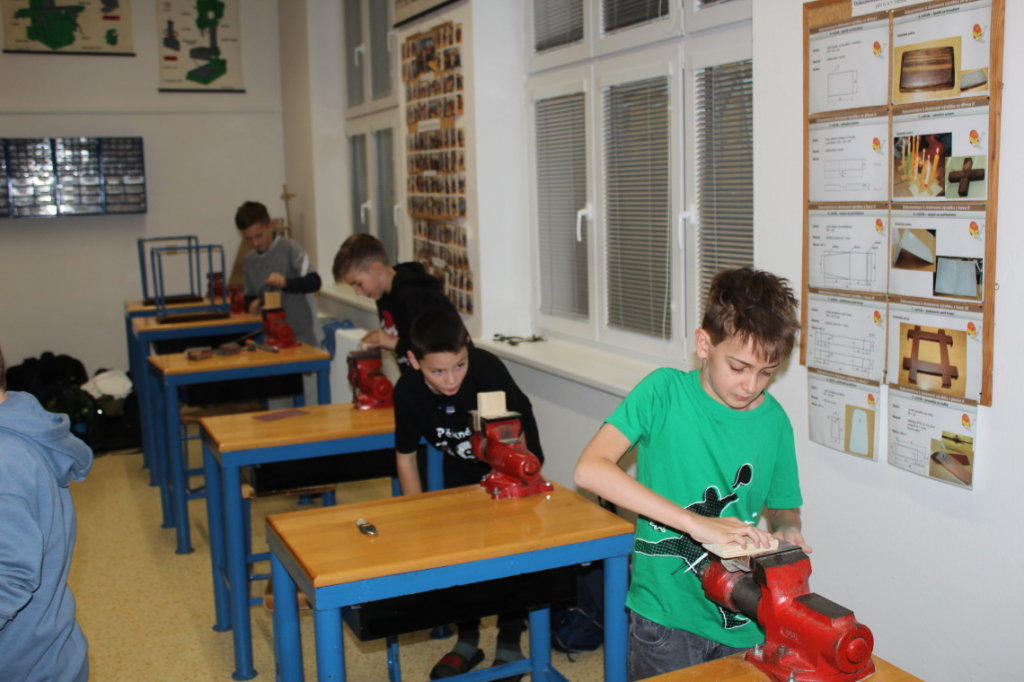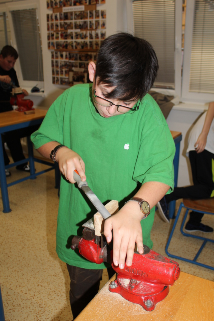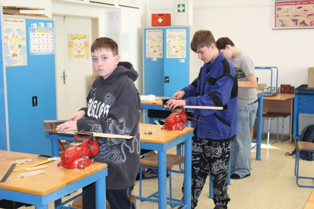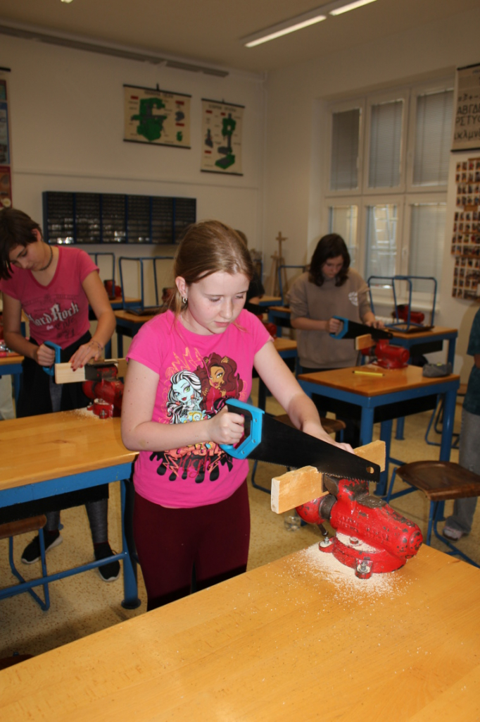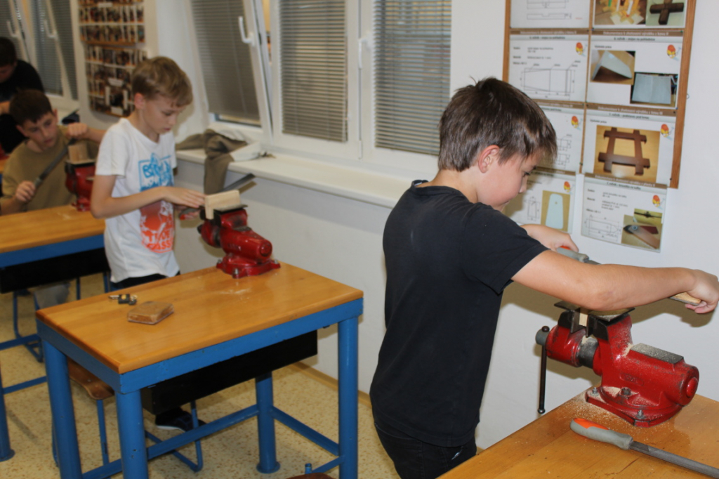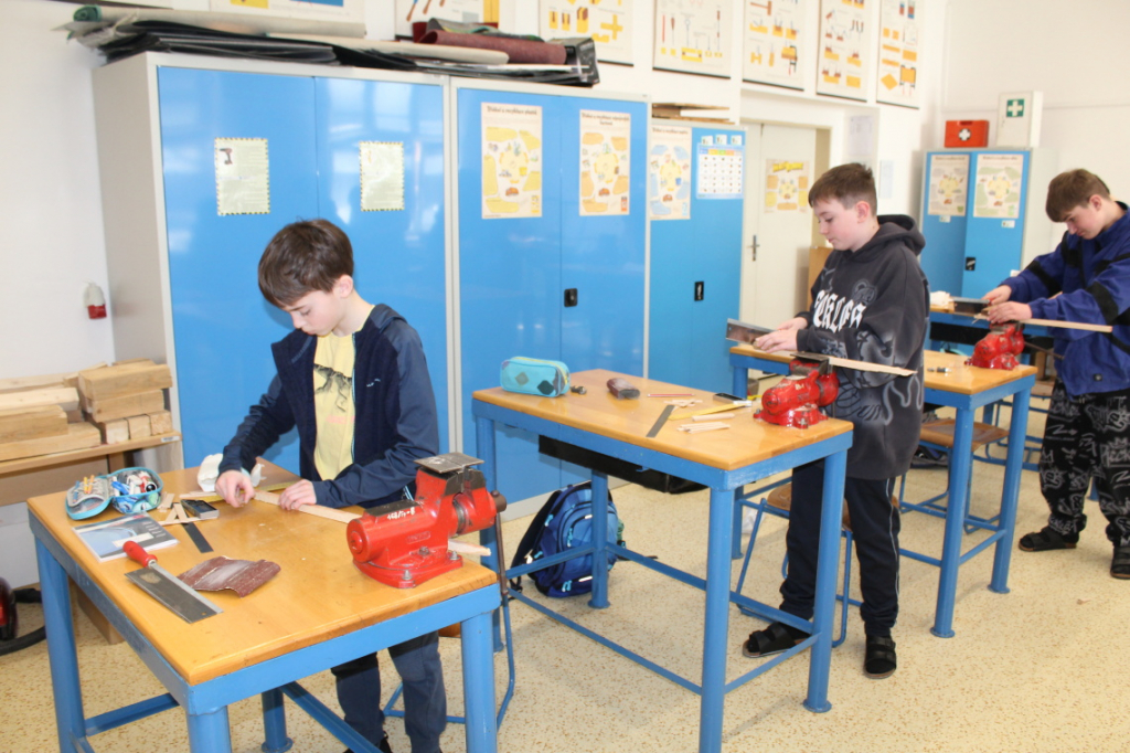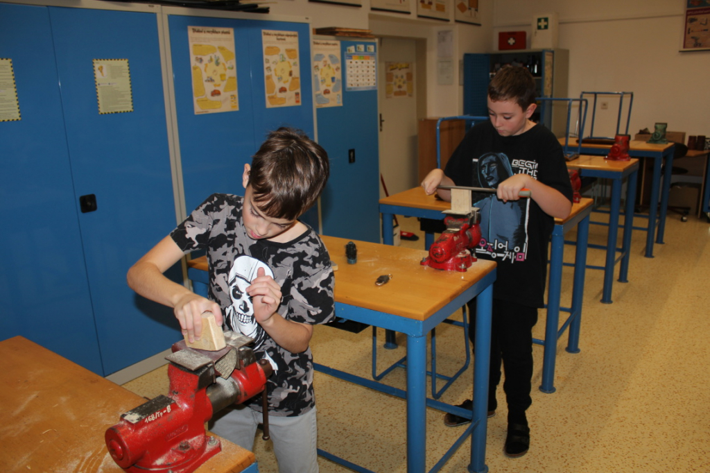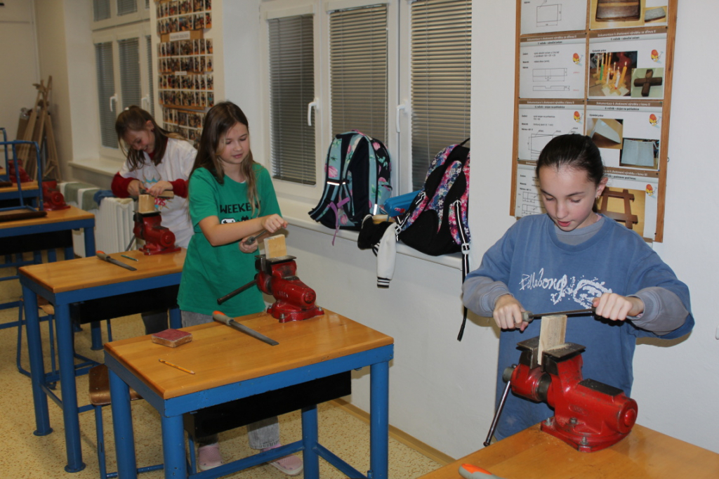 V předmětu Praktické činnosti – dílny pracovali žáci 6. ročníku se dřevem. Ze smrkového dřeva vyráběli pro své tatínky, dědečky nebo strýčky praktickou pomůcku do dílny – špalík na broušení. Na tomto výrobku si vyzkoušeli většinu základních dovedností potřebných pro práci se dřevem: řezání, rašplování, pilování, broušení, moření i lakování. Součástí práce bylo také zatloukání hřebíků, které využili při připevňování koberce ke špalíku.