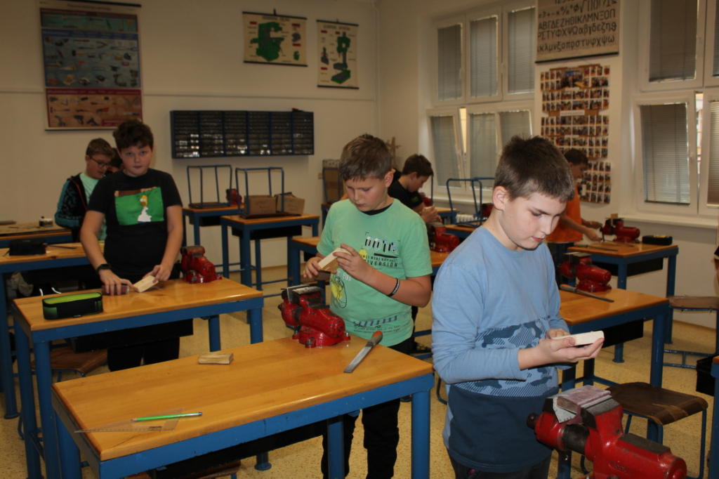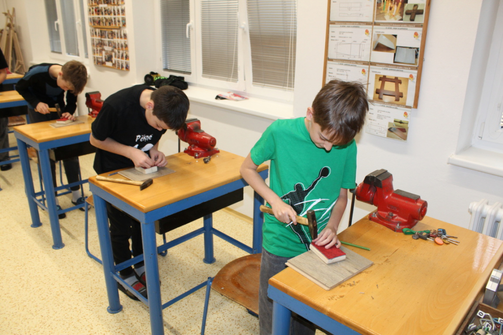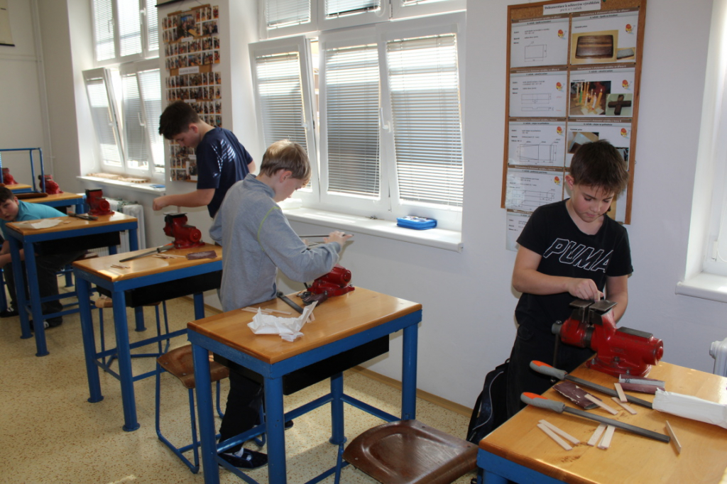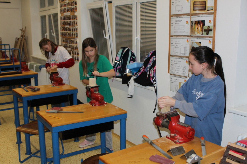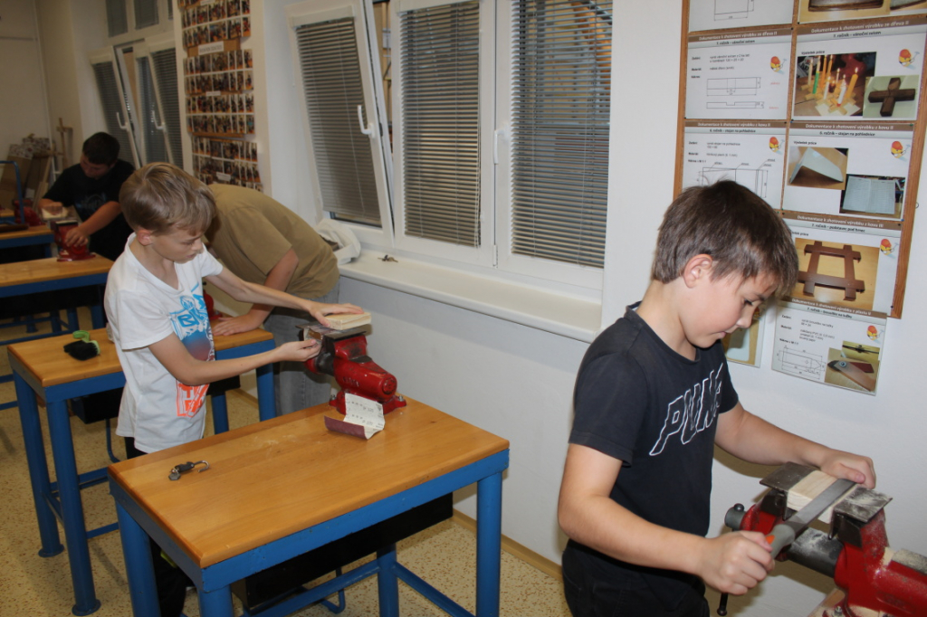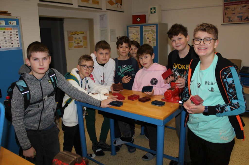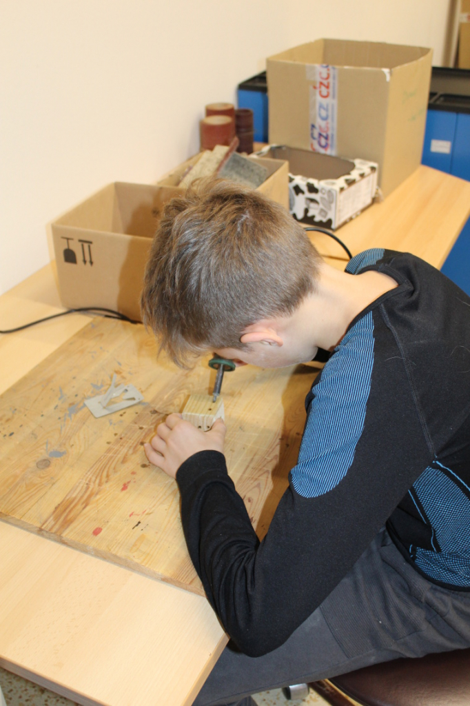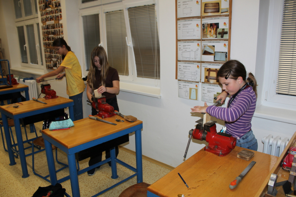 V předmětu Praktické činnosti – dílny pracovali žáci 6. ročníku se dřevem. Ze smrkového dřeva vyráběli pro své tatínky, dědečky nebo strýčky praktickou pomůcku do dílny – špalík na broušení. Na tomto výrobku si vyzkoušeli většinu základních dovedností potřebných pro práci se dřevem: řezání, rašplování, pilování, broušení, moření i lakování. Součástí práce bylo také zatloukání hřebíků, které využili při připevňování koberce ke špalíku.