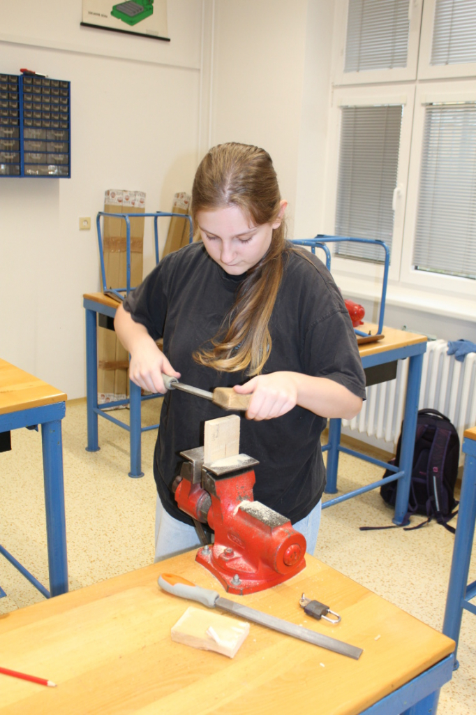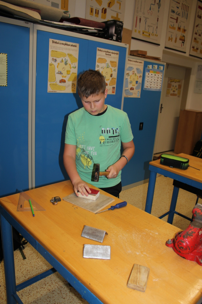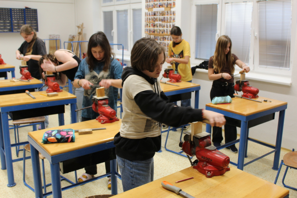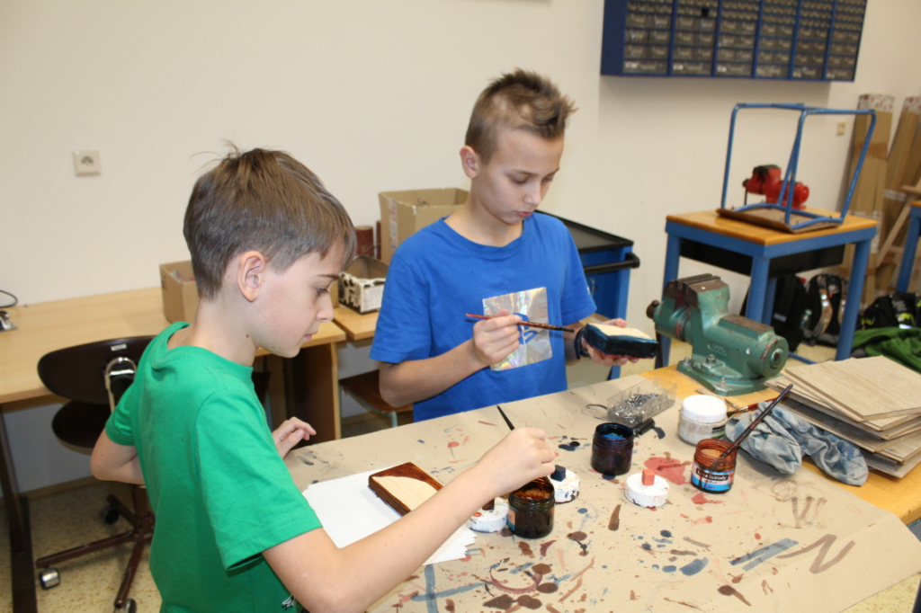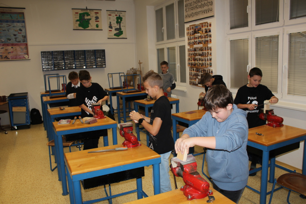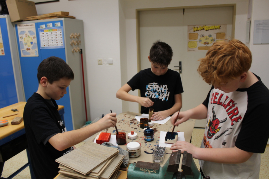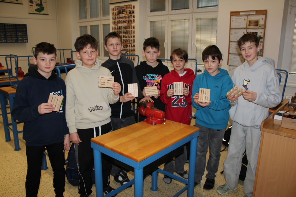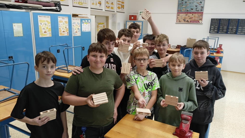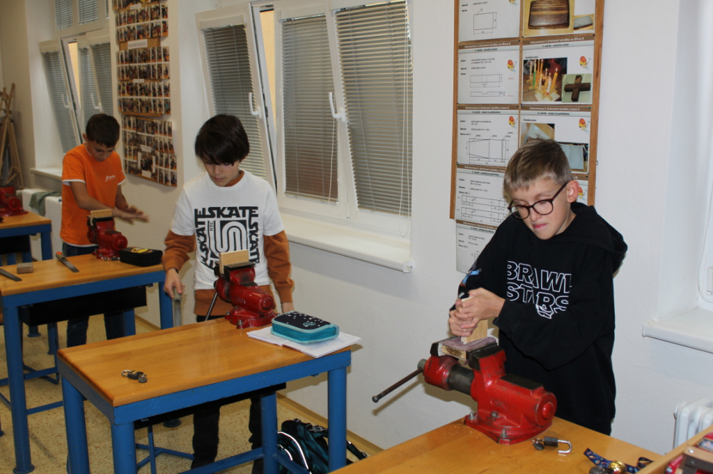 V předmětu Praktické činnosti – dílny pracovali žáci 6. ročníku se dřevem. Ze smrkového dřeva vyráběli pro své tatínky, dědečky nebo strýčky praktickou pomůcku do dílny – špalík na broušení. Na tomto výrobku si vyzkoušeli většinu základních dovedností potřebných pro práci se dřevem: řezání, rašplování, pilování, broušení, moření i lakování. Součástí práce bylo také zatloukání hřebíků, které využili při připevňování koberce ke špalíku.
