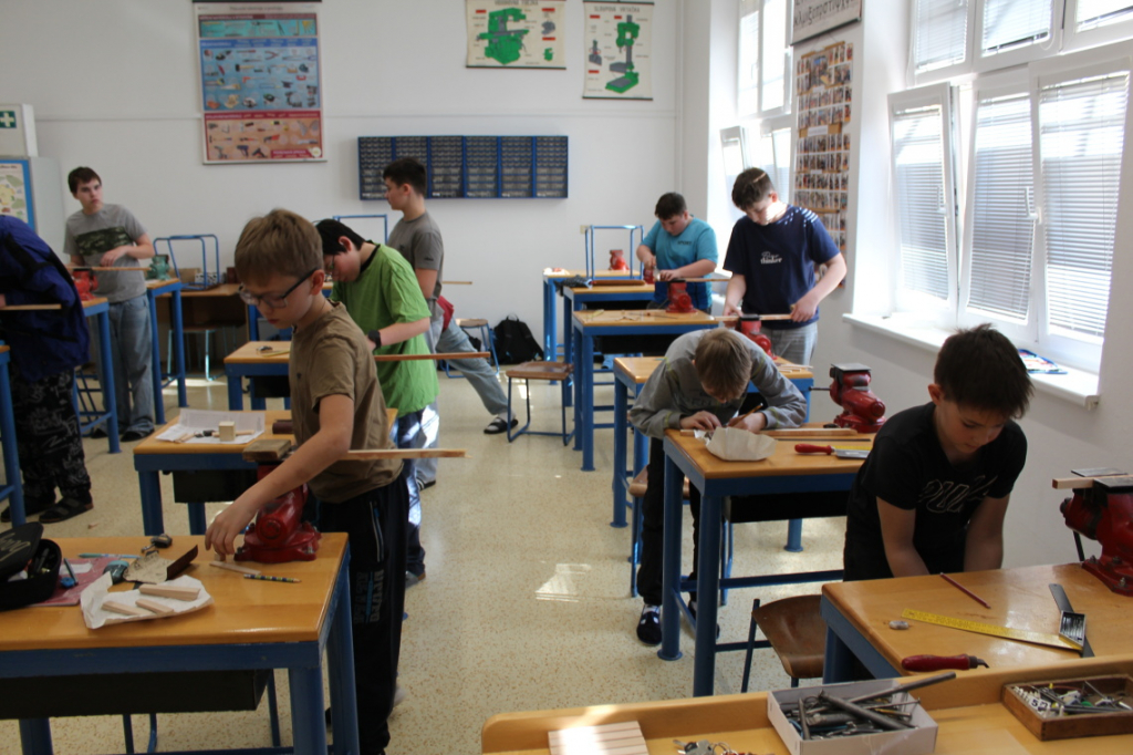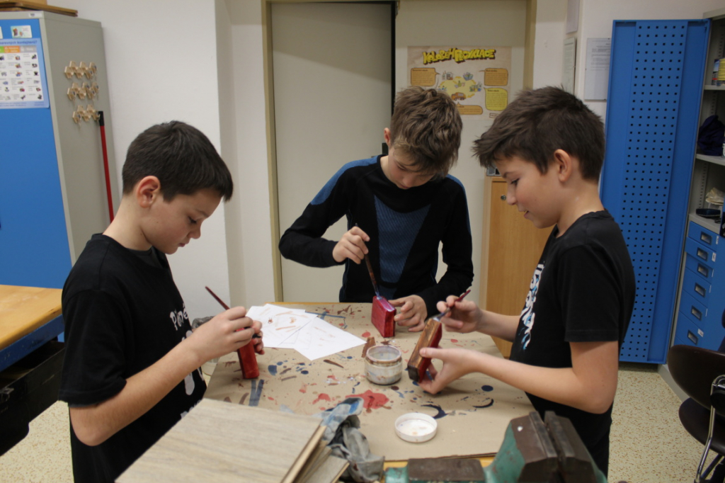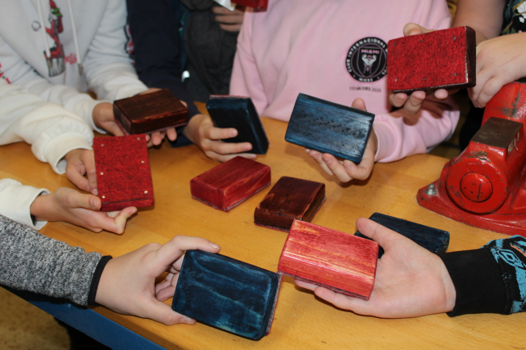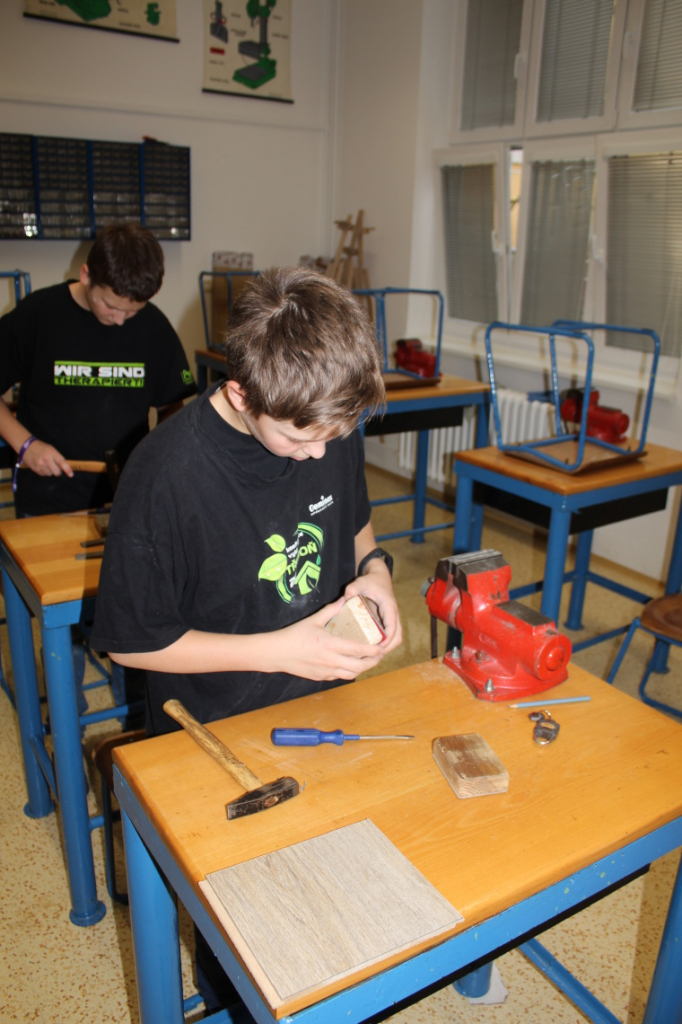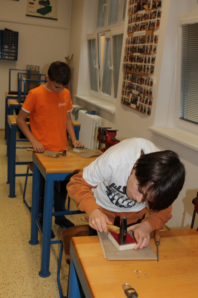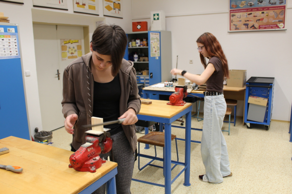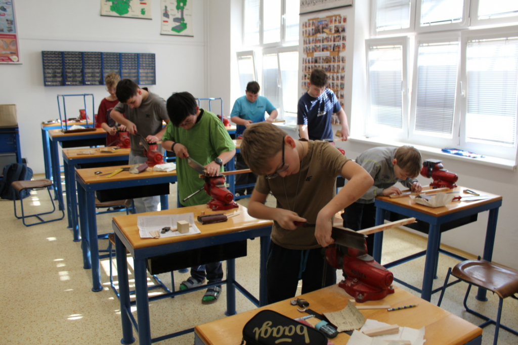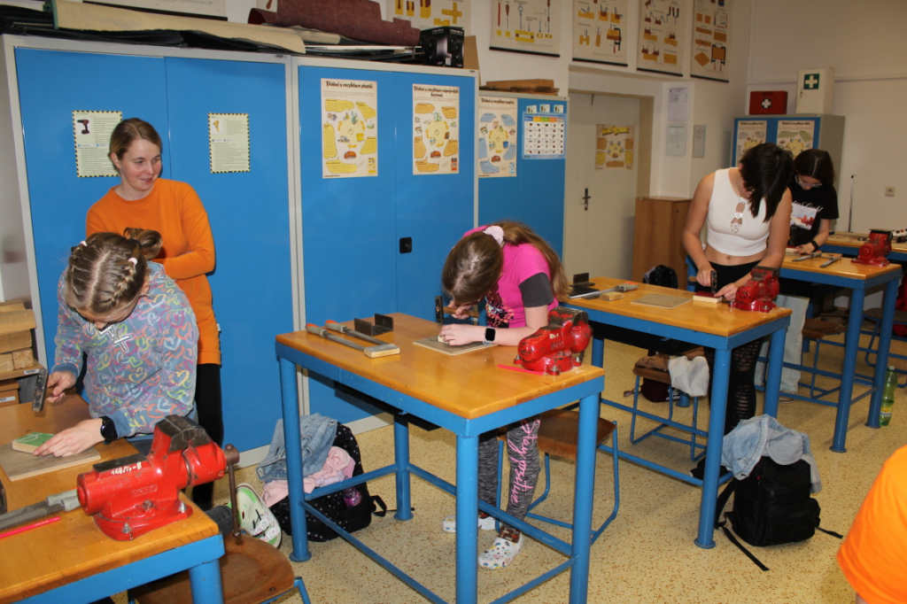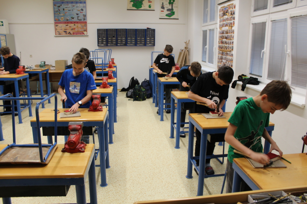 V předmětu Praktické činnosti – dílny pracovali žáci 6. ročníku se dřevem. Ze smrkového dřeva vyráběli pro své tatínky, dědečky nebo strýčky praktickou pomůcku do dílny – špalík na broušení. Na tomto výrobku si vyzkoušeli většinu základních dovedností potřebných pro práci se dřevem: řezání, rašplování, pilování, broušení, moření i lakování. Součástí práce bylo také zatloukání hřebíků, které využili při připevňování koberce ke špalíku.