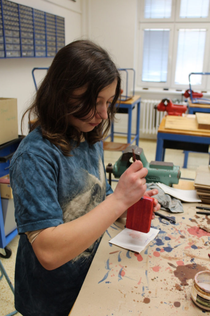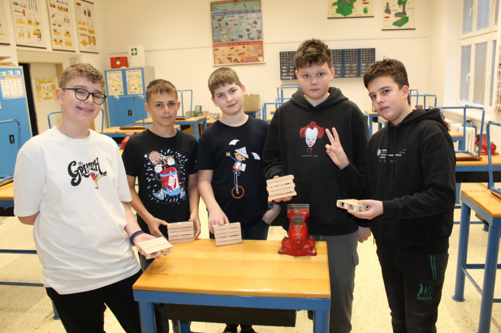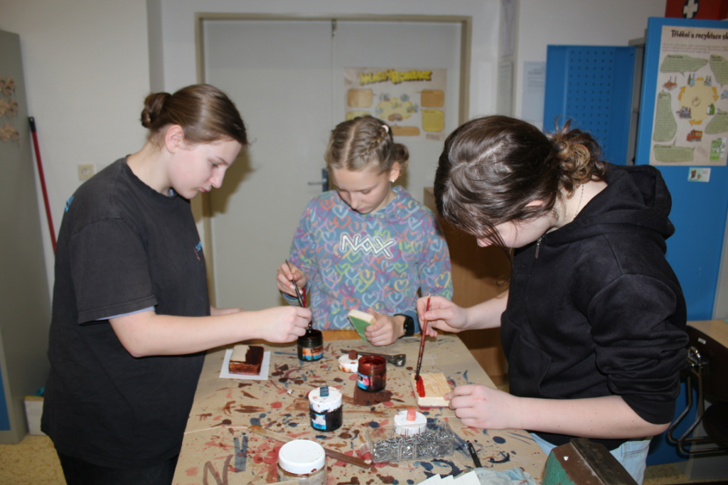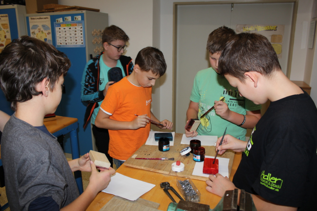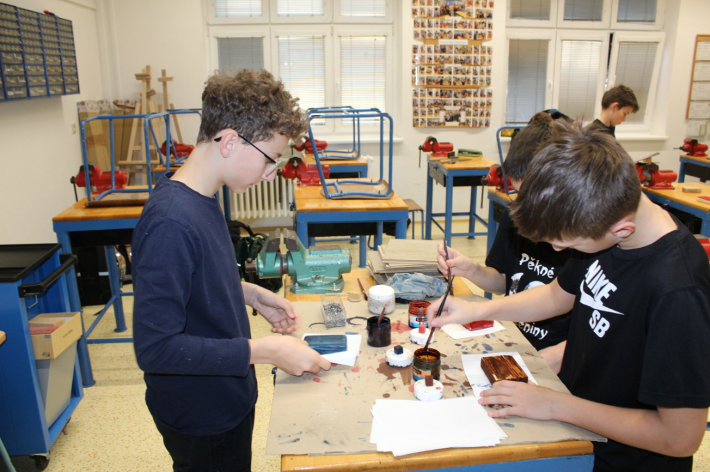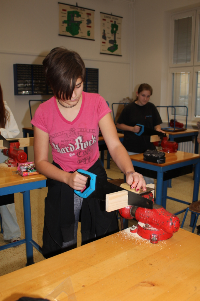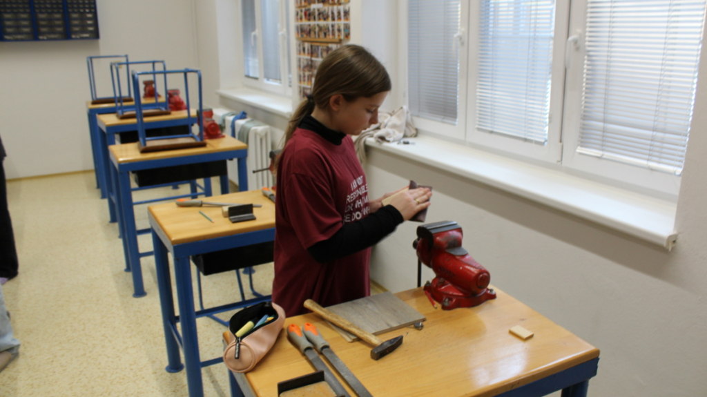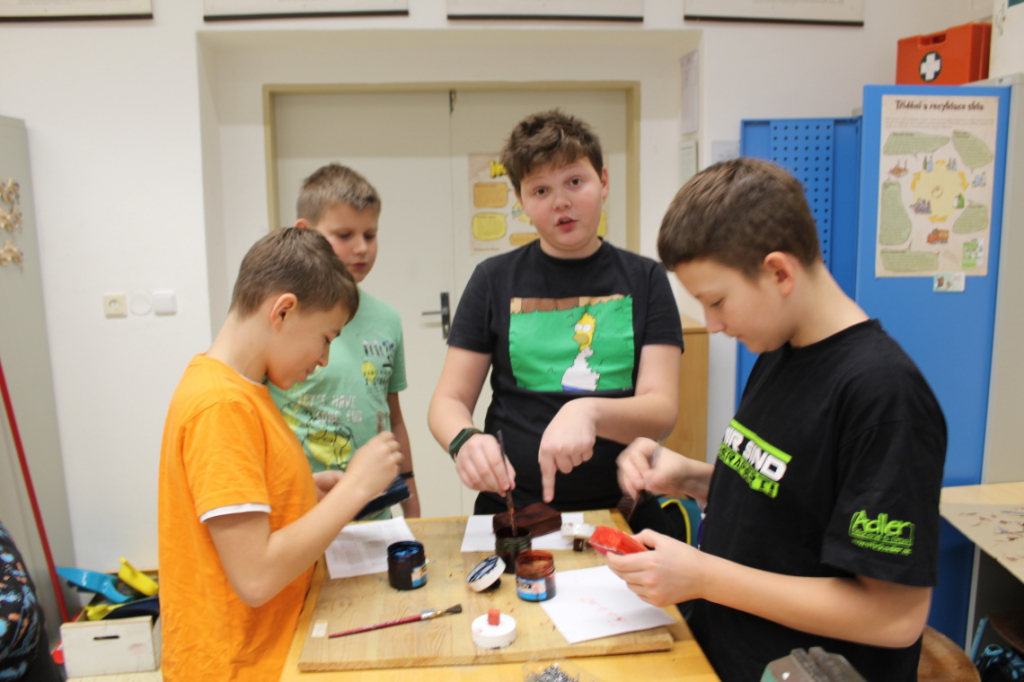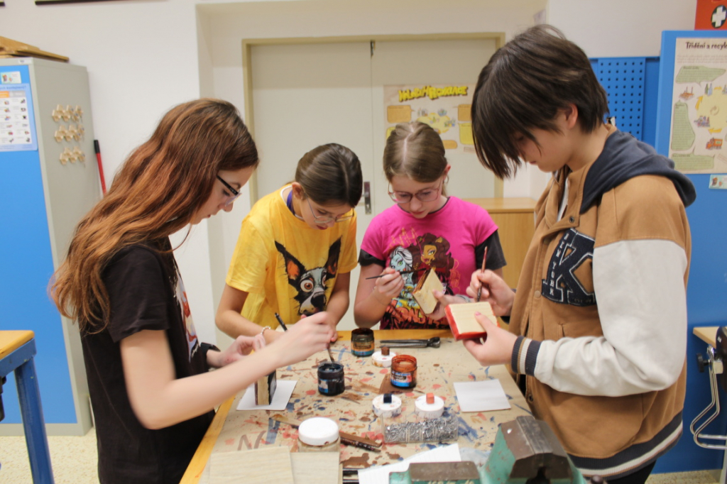 V předmětu Praktické činnosti – dílny pracovali žáci 6. ročníku se dřevem. Ze smrkového dřeva vyráběli pro své tatínky, dědečky nebo strýčky praktickou pomůcku do dílny – špalík na broušení. Na tomto výrobku si vyzkoušeli většinu základních dovedností potřebných pro práci se dřevem: řezání, rašplování, pilování, broušení, moření i lakování. Součástí práce bylo také zatloukání hřebíků, které využili při připevňování koberce ke špalíku.