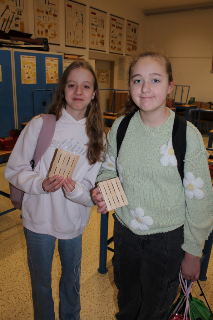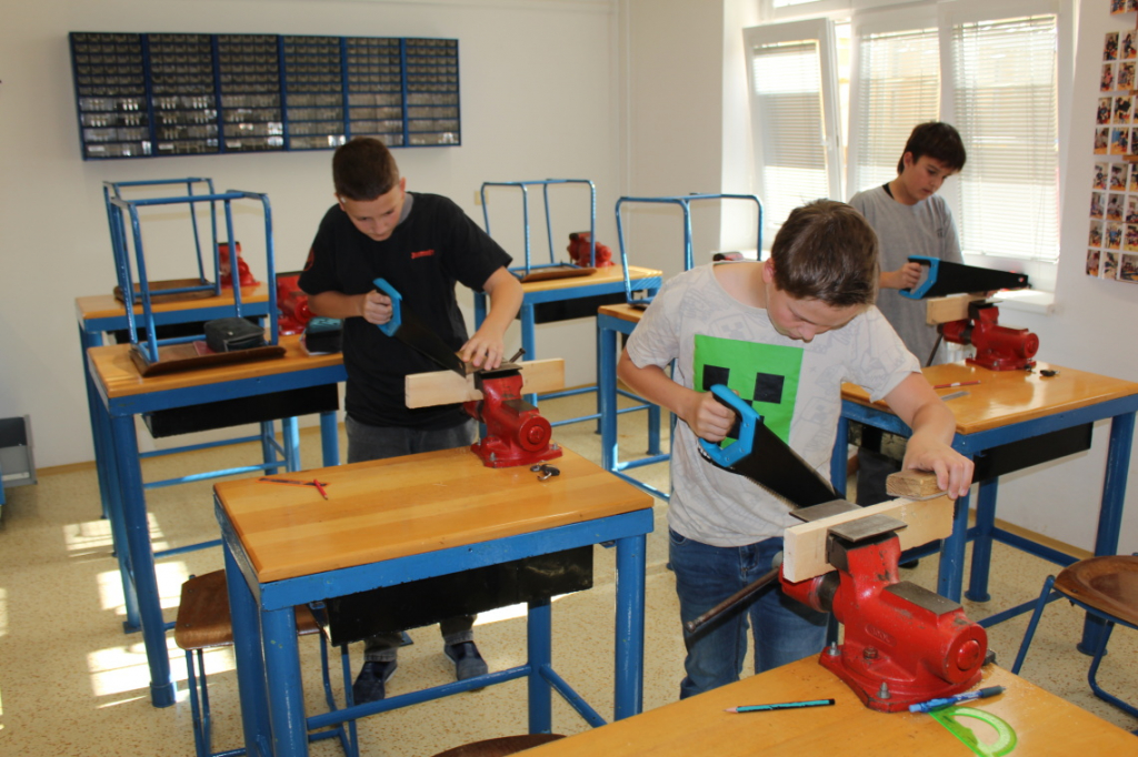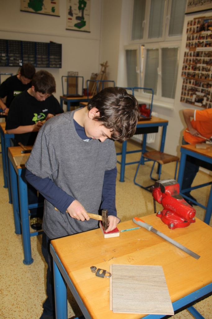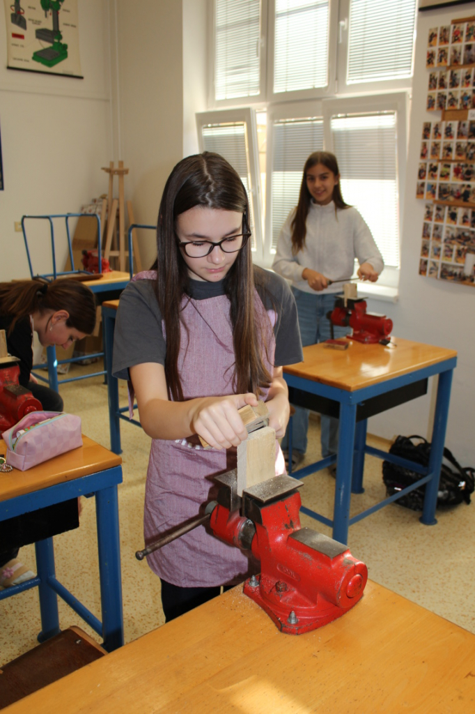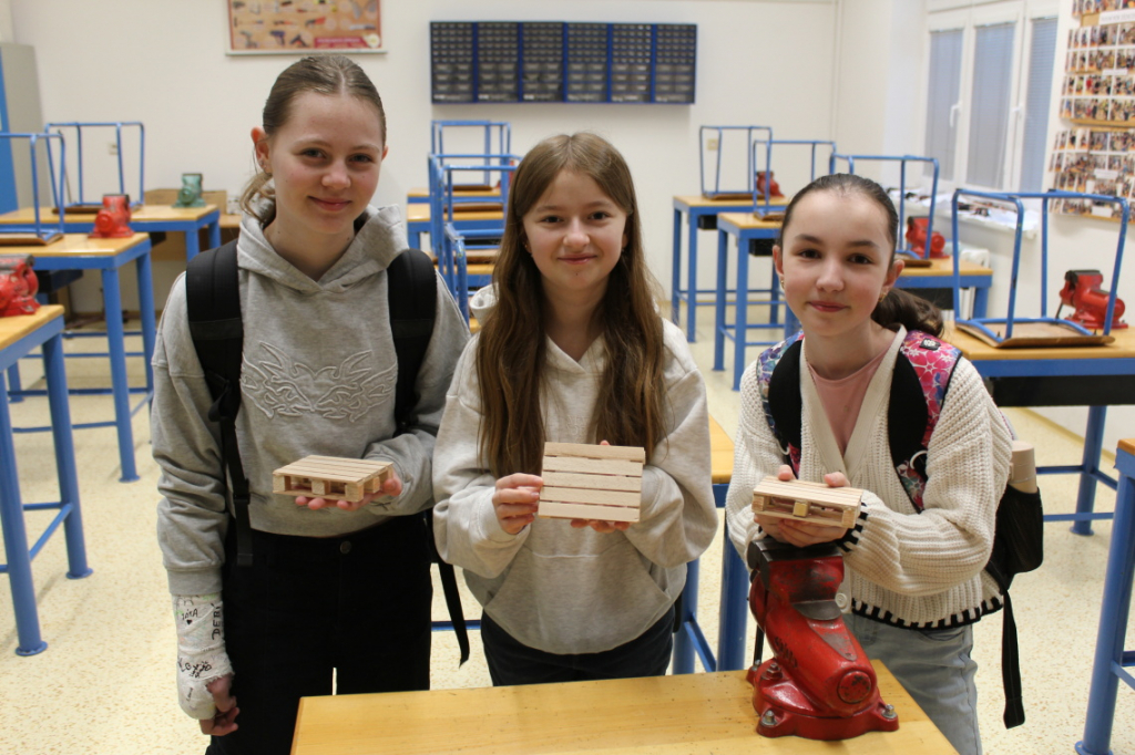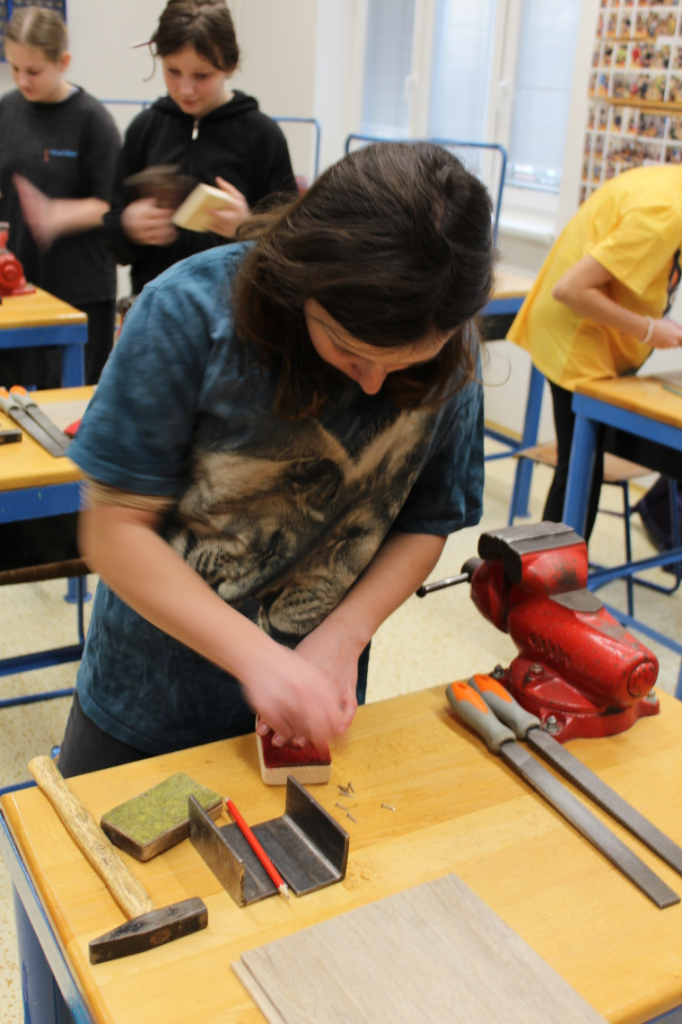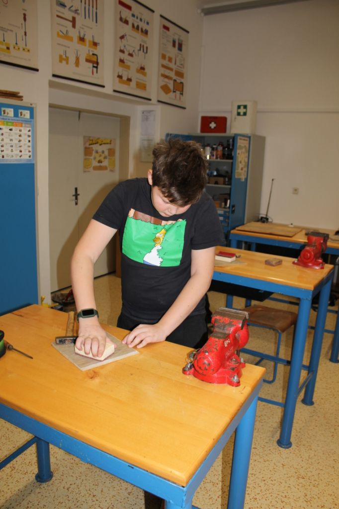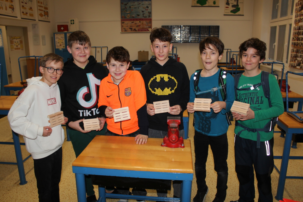V předmětu Praktické činnosti – dílny pracovali žáci 6. ročníku se dřevem. Ze smrkového dřeva vyráběli pro své tatínky, dědečky nebo strýčky praktickou pomůcku do dílny – špalík na broušení. Na tomto výrobku si vyzkoušeli většinu základních dovedností potřebných pro práci se dřevem: řezání, rašplování, pilování, broušení, moření i lakování. Součástí práce bylo také zatloukání hřebíků, které využili při připevňování koberce ke špalíku.