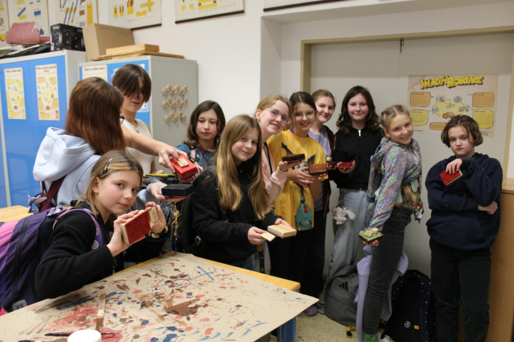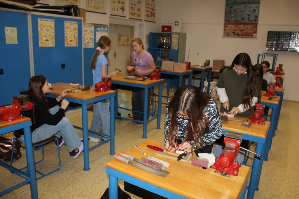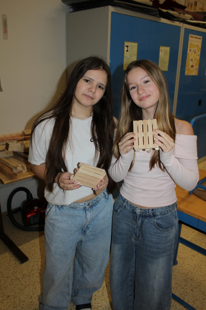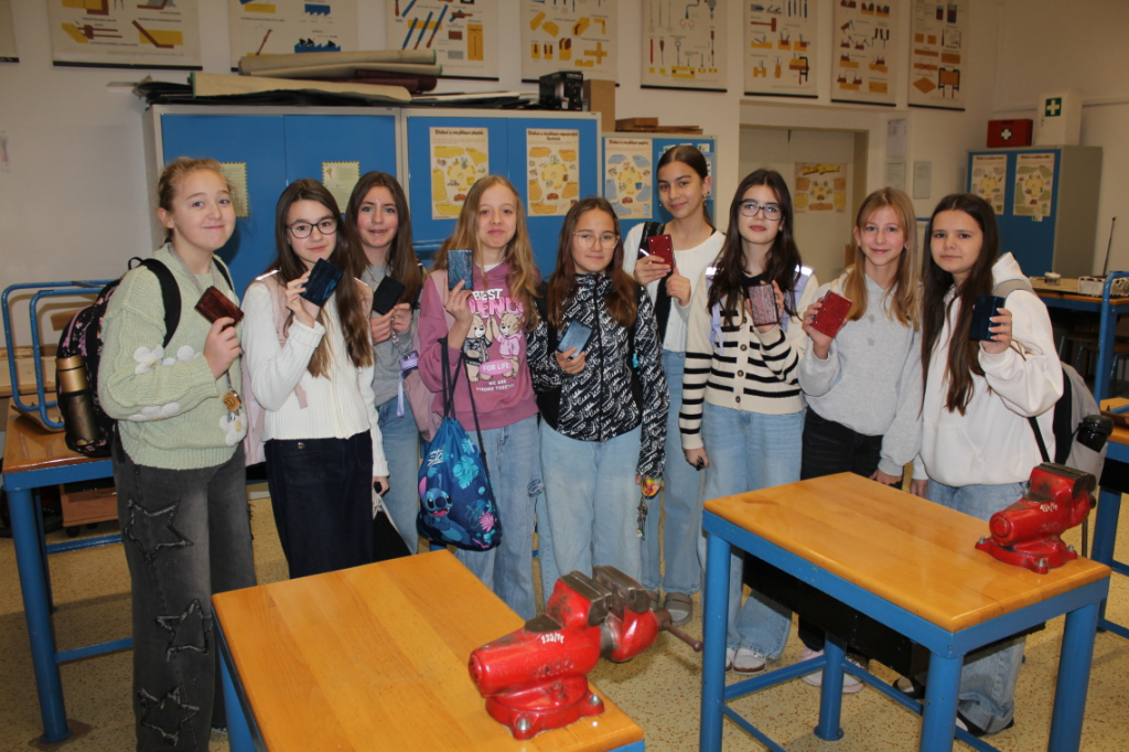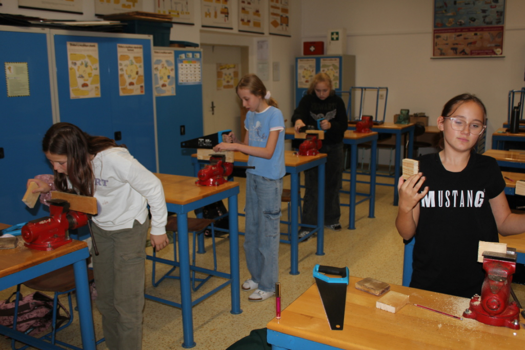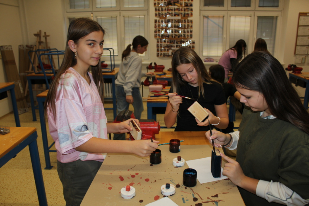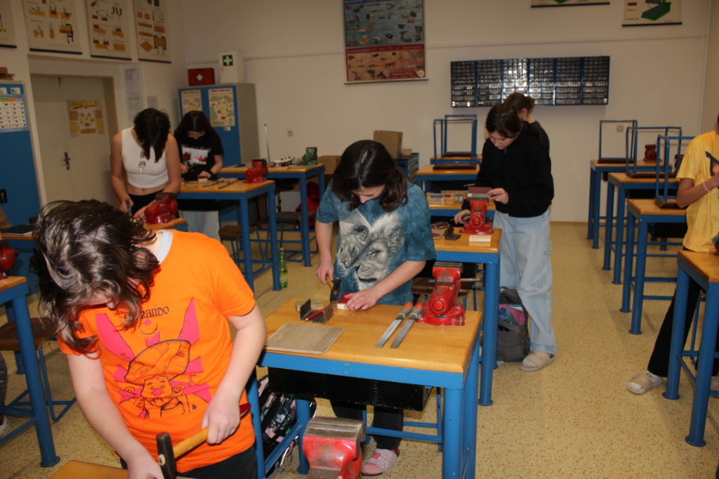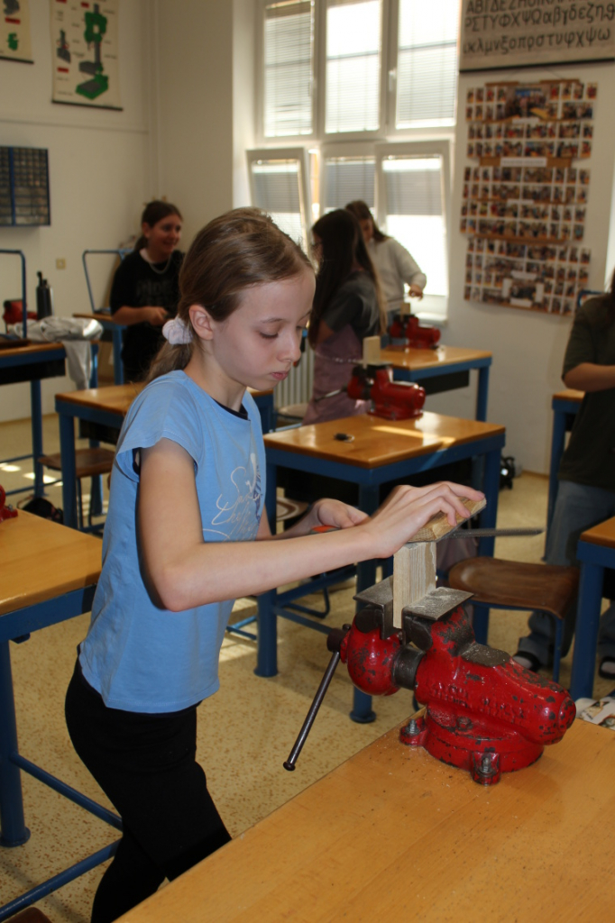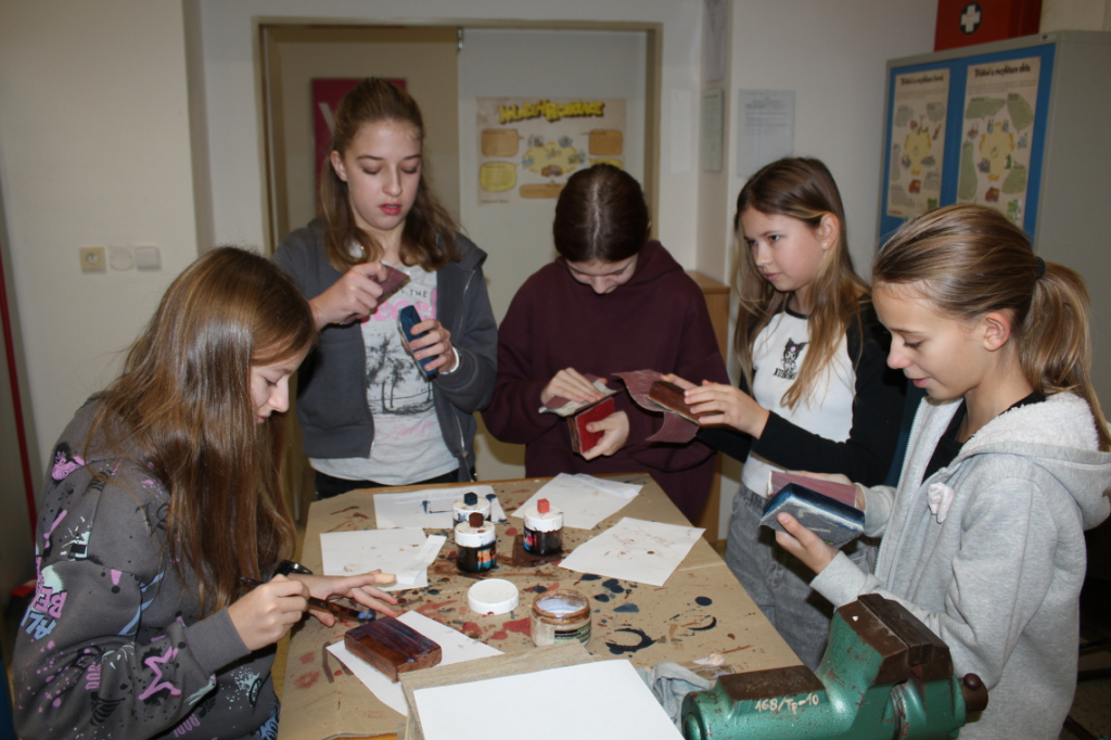 V předmětu Praktické činnosti – dílny pracovali žáci 6. ročníku se dřevem. Ze smrkového dřeva vyráběli pro své tatínky, dědečky nebo strýčky praktickou pomůcku do dílny – špalík na broušení. Na tomto výrobku si vyzkoušeli většinu základních dovedností potřebných pro práci se dřevem: řezání, rašplování, pilování, broušení, moření i lakování. Součástí práce bylo také zatloukání hřebíků, které využili při připevňování koberce ke špalíku.