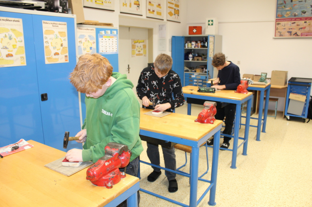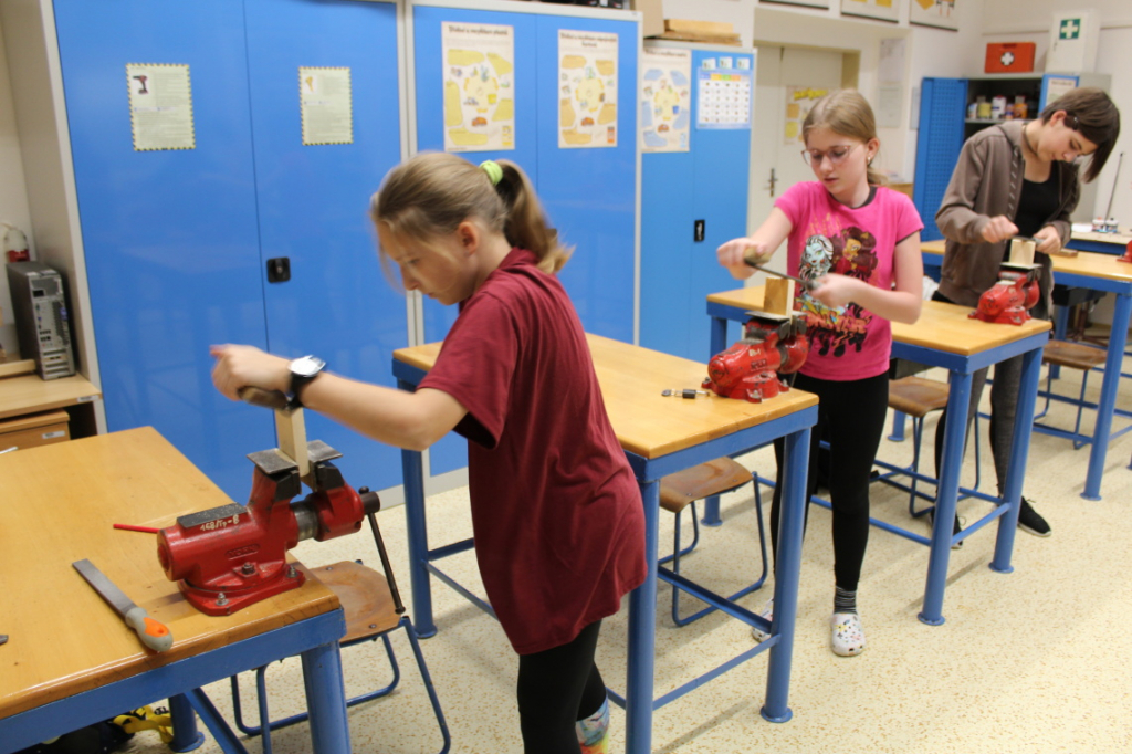 Od konce března se žáci věnují práci s kovem... zpracování tenkého drátu a plechu, ze kterých vytvářejí háček a stojan na mobil.