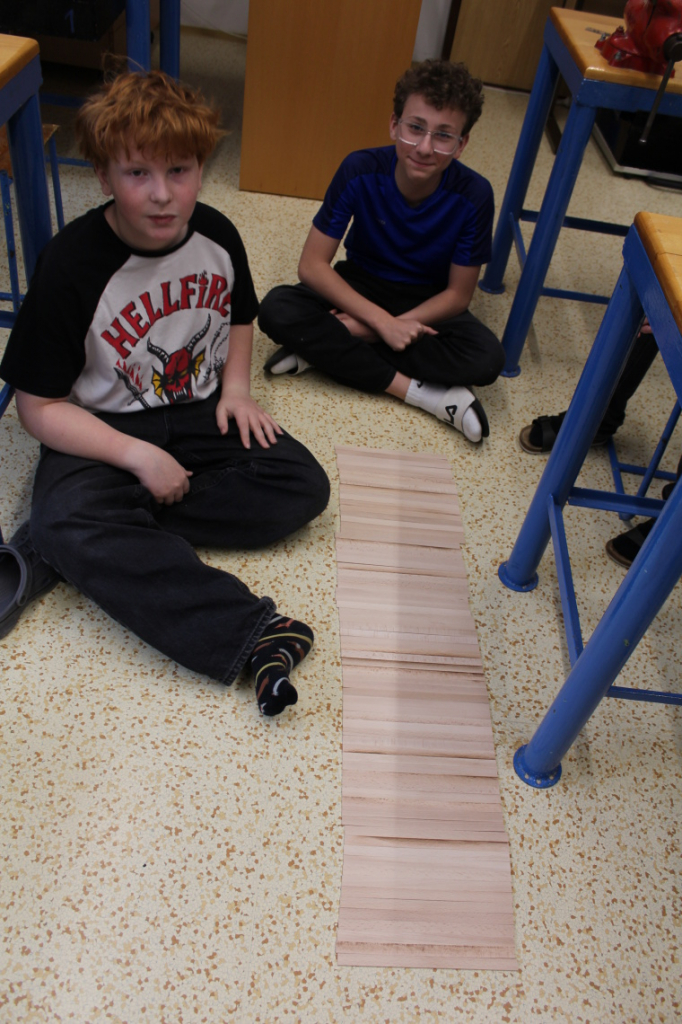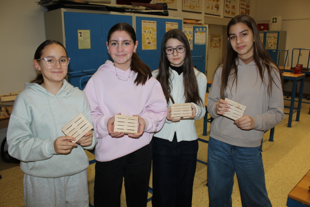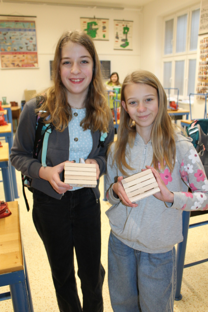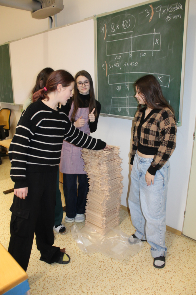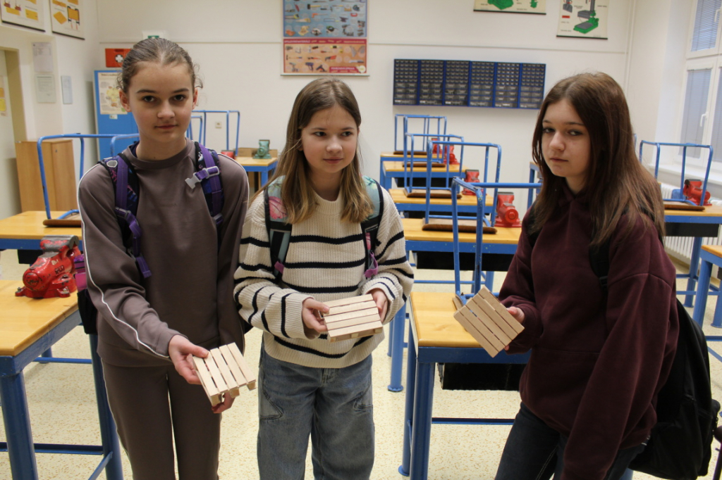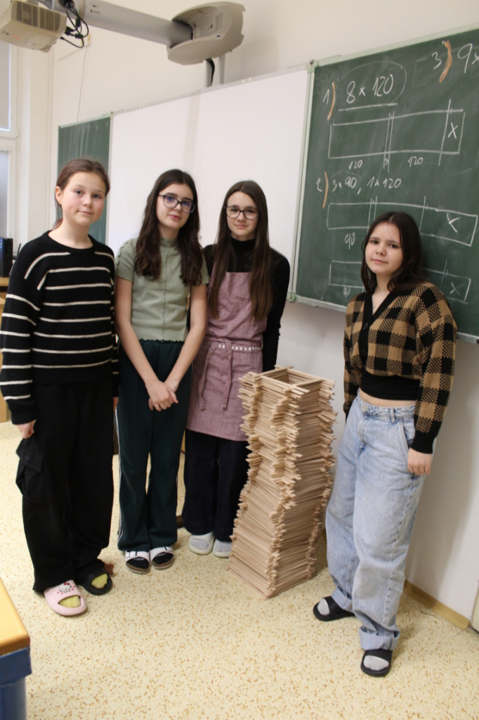 Nové pololetí jsme zahájili výrobou dřevěné paletky, tedy podtácku pod hrnek. Bukové destičky, ze kterých je paletka vytvořena, využívají někteří žáci o přestávkách na skládání různých ornamentů či pyramid.