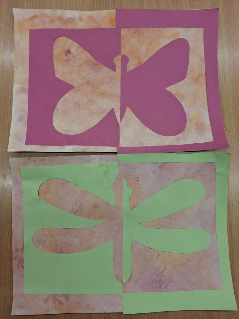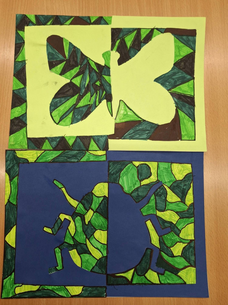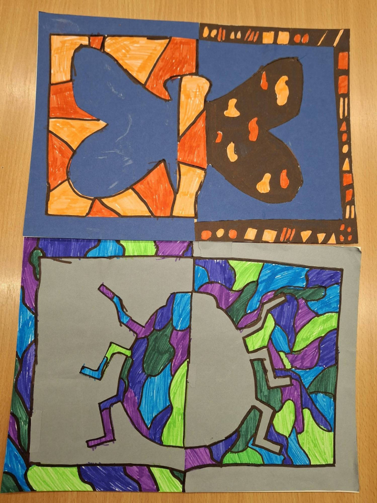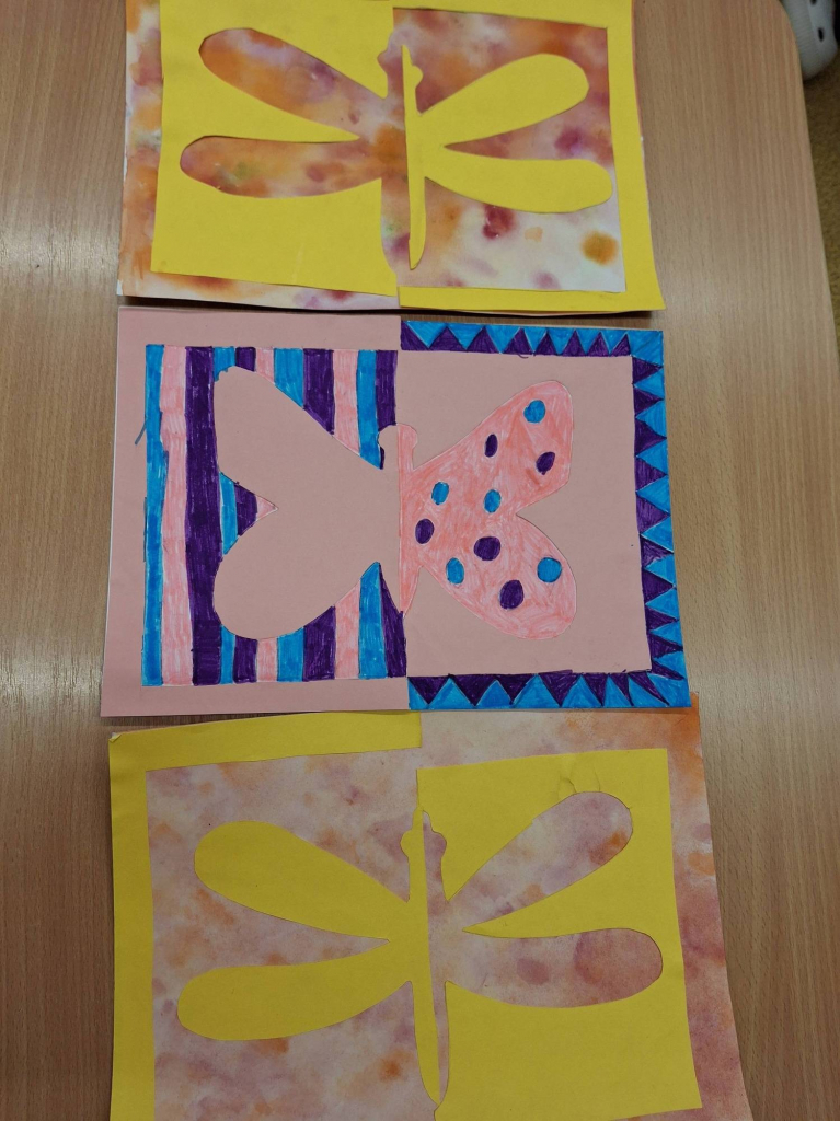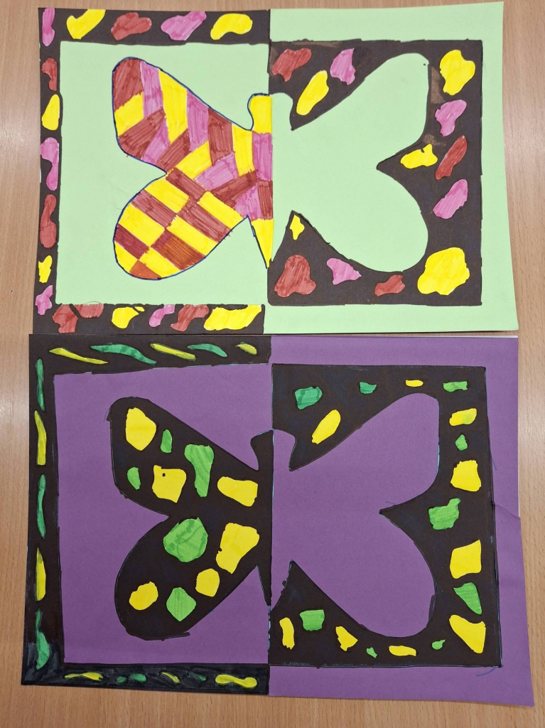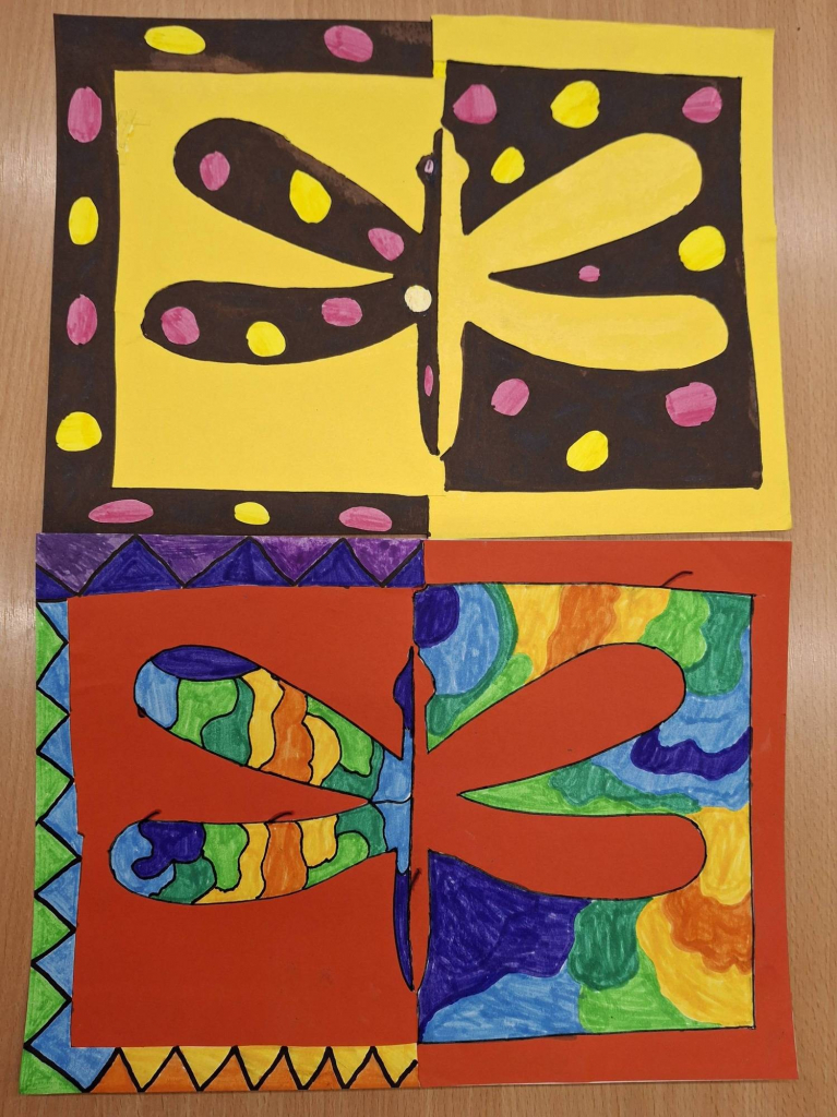 Výsledkem první techniky byly výrazné, hravé kompozice, které pracovaly s optickými efekty a symetrií. Žáci si během práce uvědomovali, jak důležité je přesné vystřižení tvaru i promyšlení barevného ladění. Obrázky působí velmi moderně, připomínají styl pop-artu a krásně oživily výzdobu před třídou.