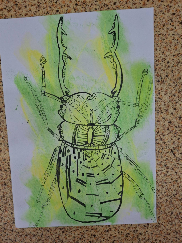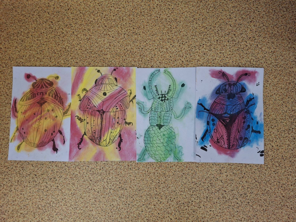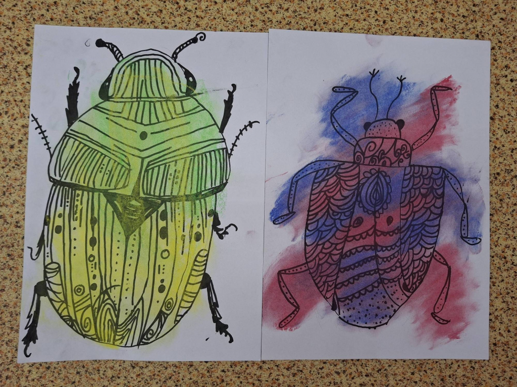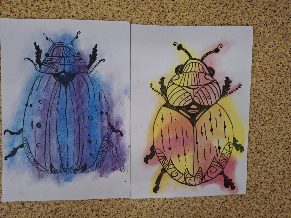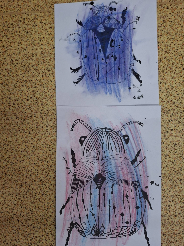 Druhá část projektu byla zaměřená na detail, strukturu a realistické ztvárnění hmyzu. Žáci kreslili tuší zvoleného brouka dle předlohy. V závěru děti použily suché pastely ke stínování okrajů a částí těla hmyzu. Díky tomu obrázky získaly prostorovost a jemný výtvarný charakter.