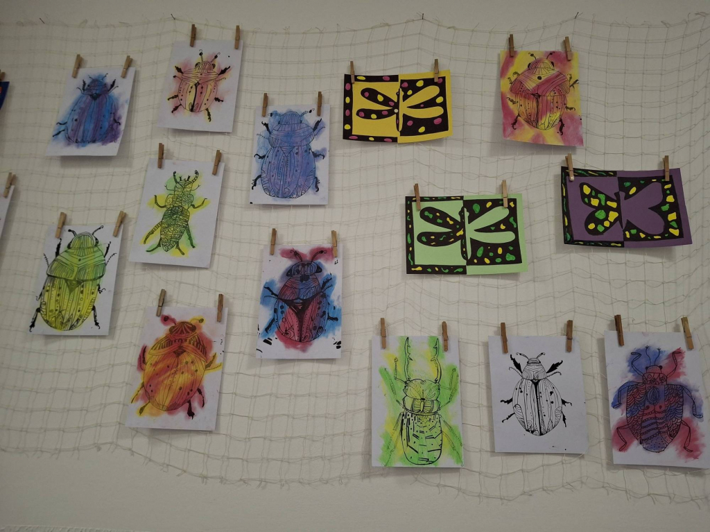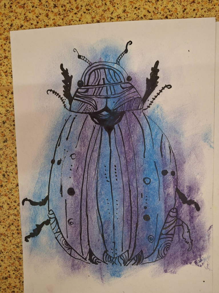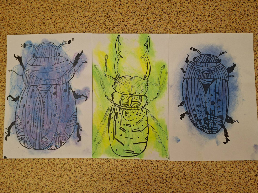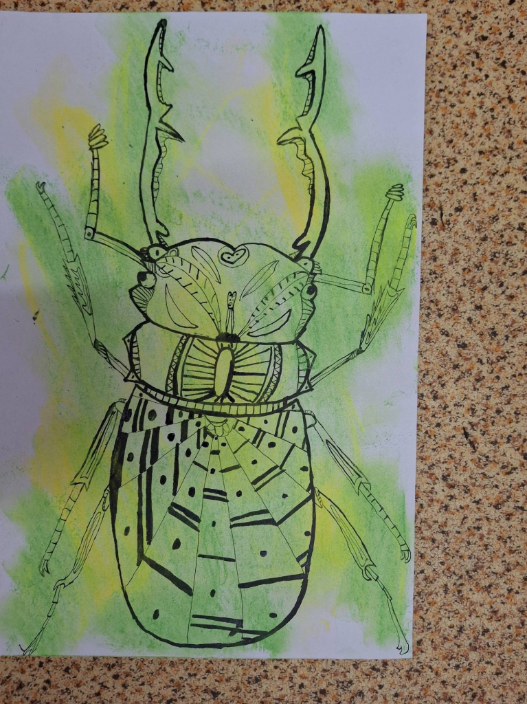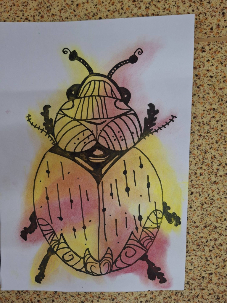 Druhá část projektu byla zaměřená na detail, strukturu a realistické ztvárnění hmyzu. Žáci kreslili tuší zvoleného brouka dle předlohy. V závěru děti použily suché pastely ke stínování okrajů a částí těla hmyzu. Díky tomu obrázky získaly prostorovost a jemný výtvarný charakter.