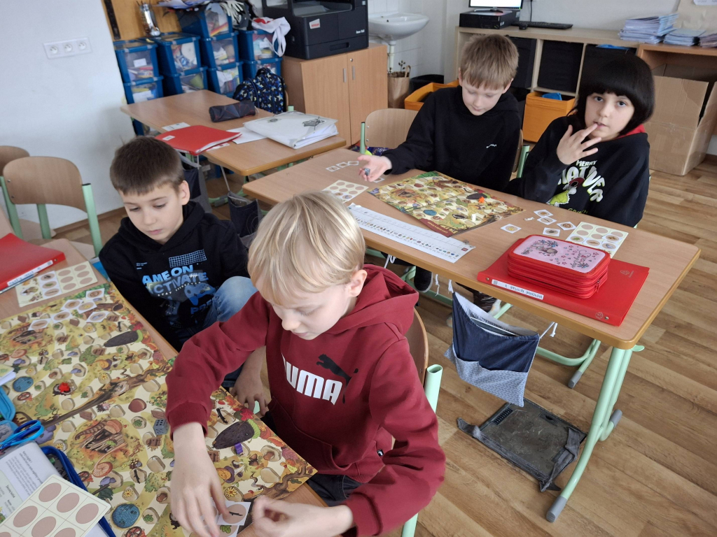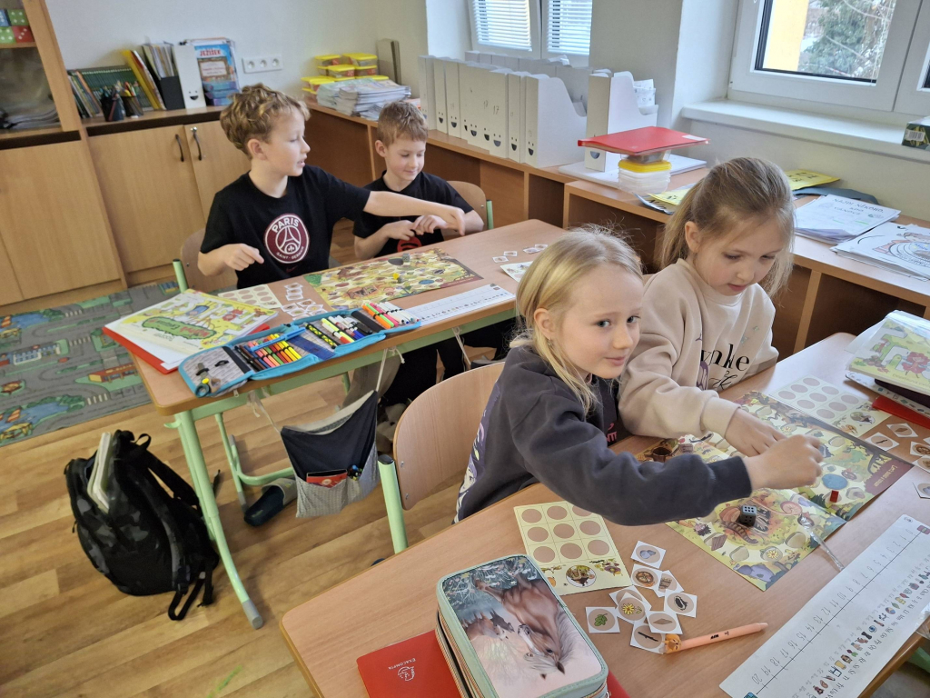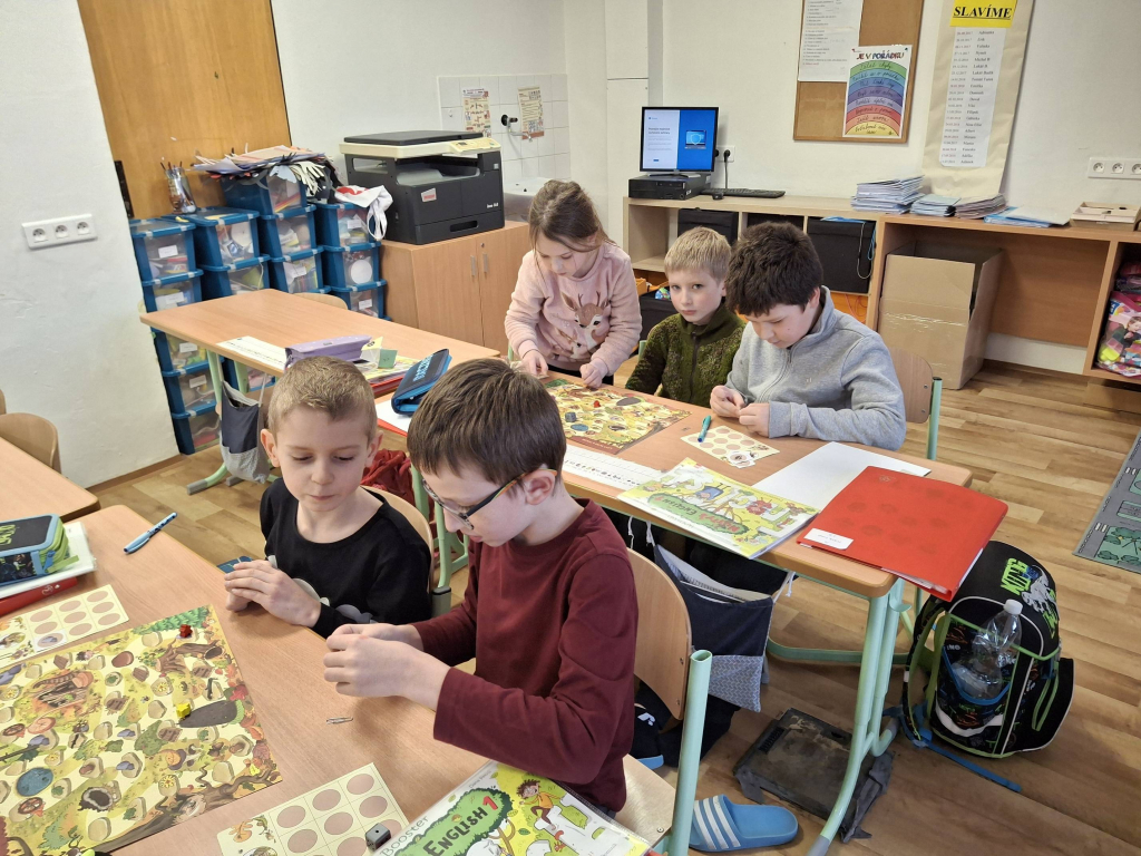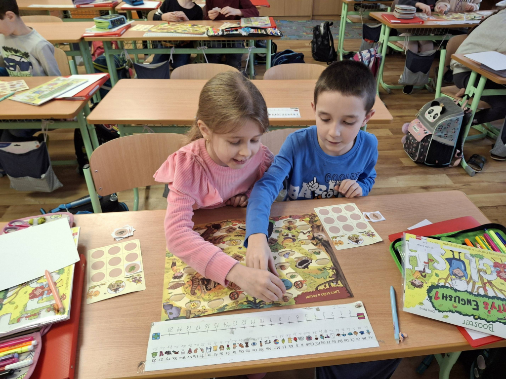 Velkou oblibu v hodinách mají deskové hry. Při hře "Let’s build a house" si žáci postupně „stavěli“ dům pomocí kartiček s obrázky a anglickými názvy jednotlivých částí domu či vybavení. Aby mohli pokračovat, museli správně pojmenovat daný prvek nebo jeho umístění. Děti si tak nenásilnou formou upevňovaly slovní zásobu a zároveň si trénovaly schopnost domluvit se a pomoci si.