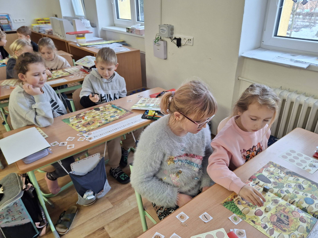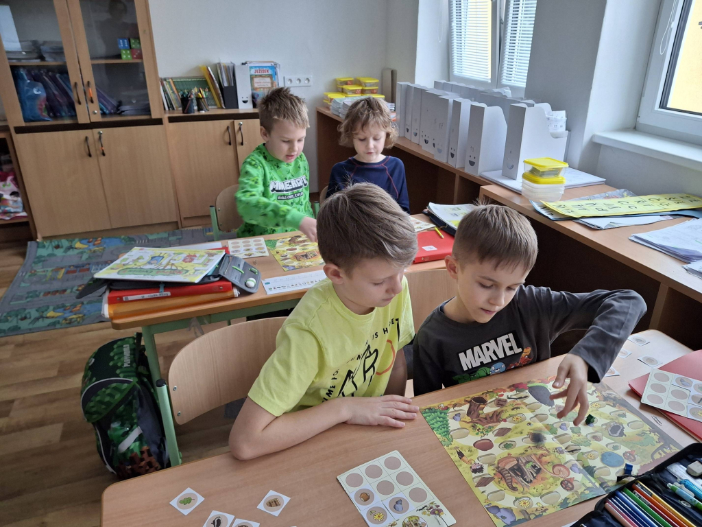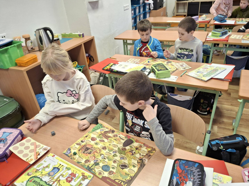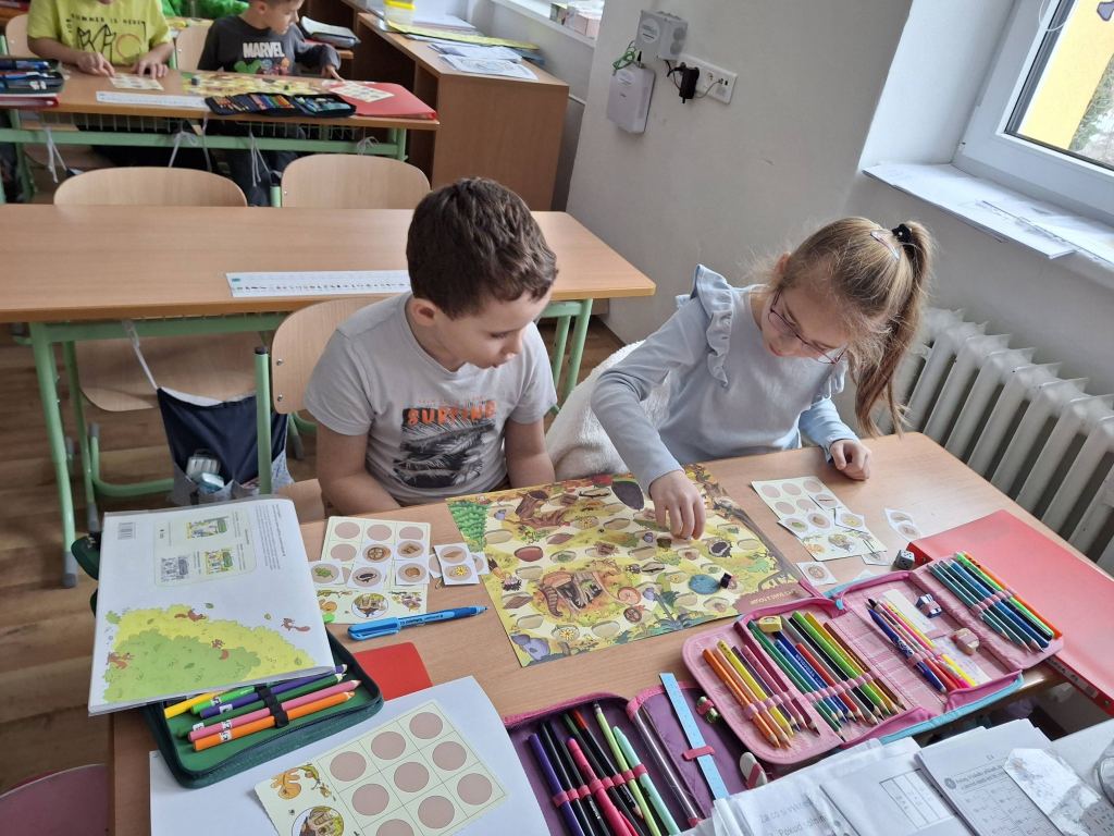 Velkou oblibu v hodinách mají deskové hry. Při hře "Let’s build a house" si žáci postupně „stavěli“ dům pomocí kartiček s obrázky a anglickými názvy jednotlivých částí domu či vybavení. Aby mohli pokračovat, museli správně pojmenovat daný prvek nebo jeho umístění. Děti si tak nenásilnou formou upevňovaly slovní zásobu a zároveň si trénovaly schopnost domluvit se a pomoci si.