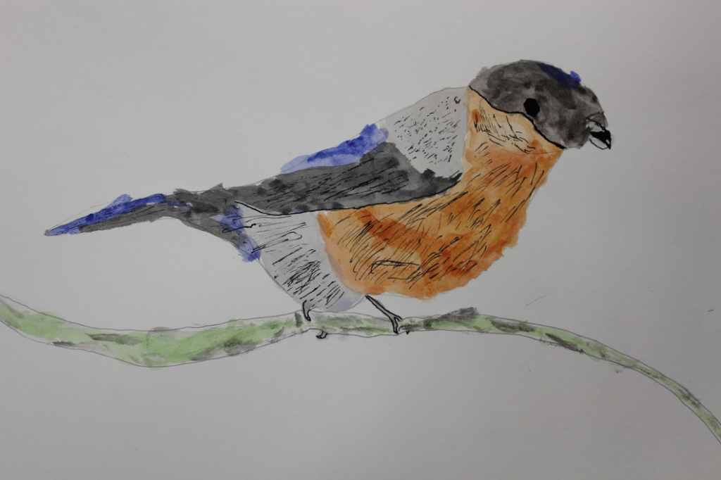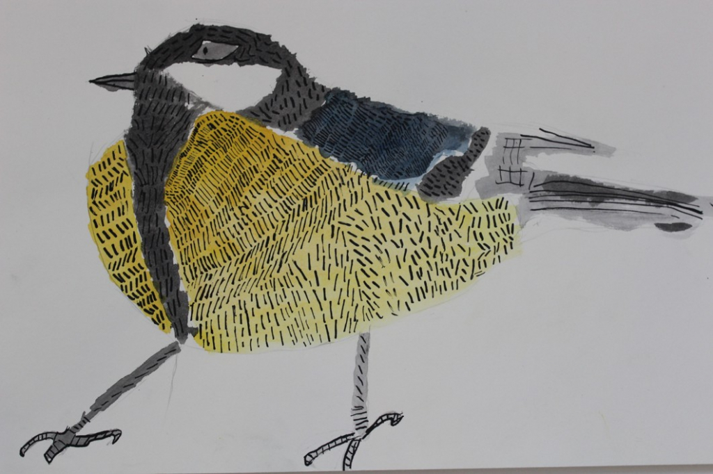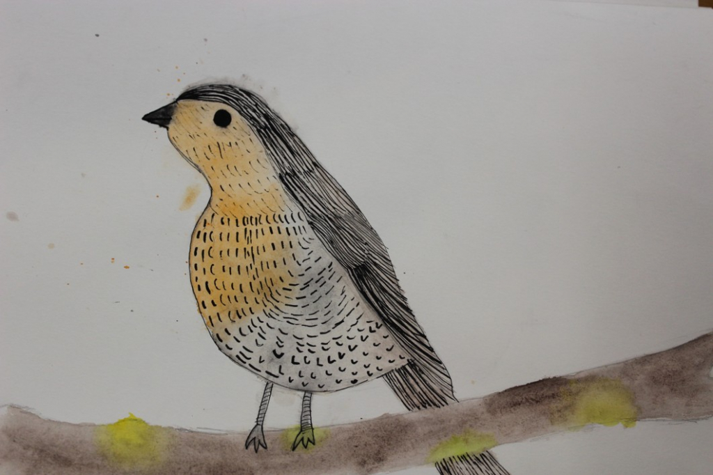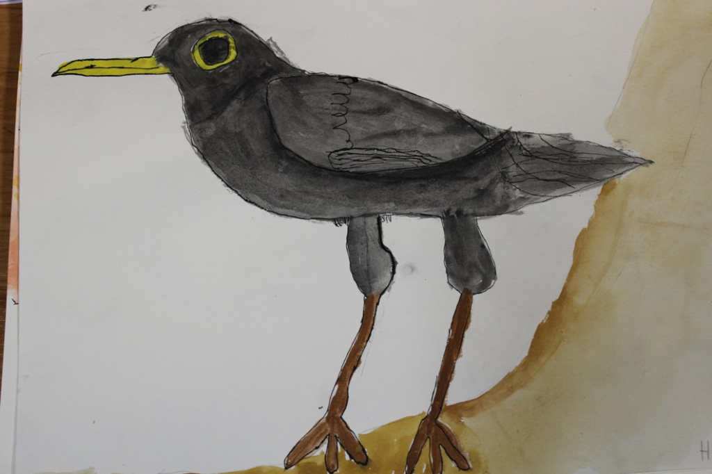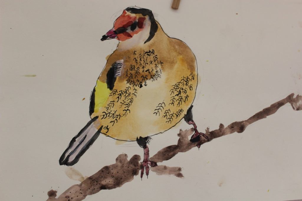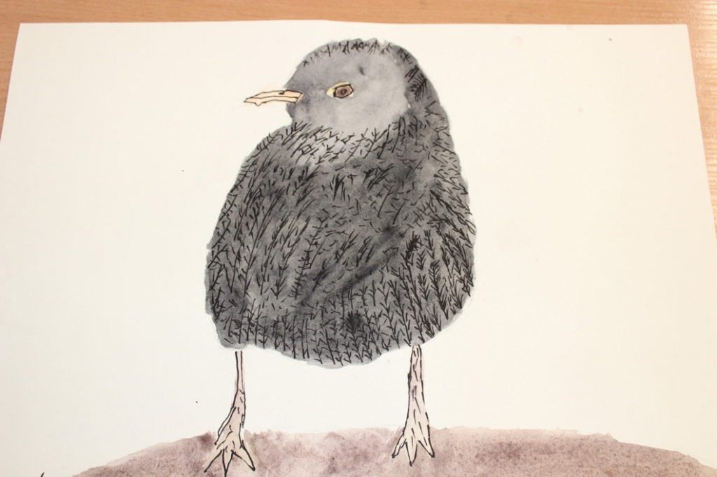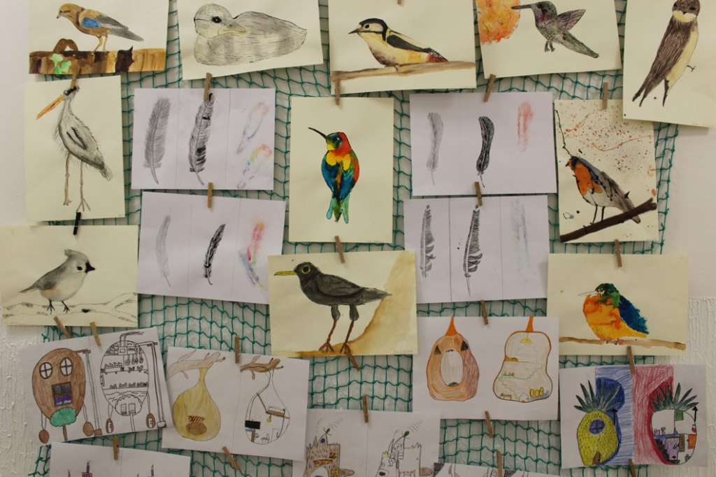 V dalším kroku jsme zkusili pracovat podle malých fotografií různých druhů ptáků, zejména ale těch, které najdeme v naší krajině, ať už migrují nebo zůstávají na zimu u nás. Žáci se seznámili s technikou akvarelu a pomocí této výtvarné techniky a dodatečné kresby perem a tuší tyto fotografie zvětšovali.
