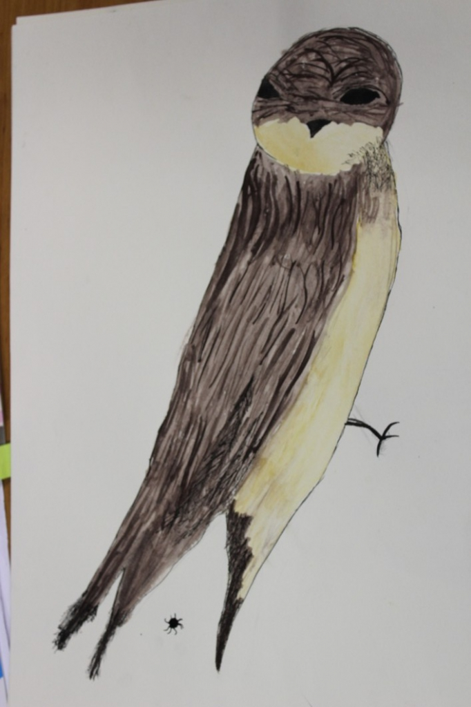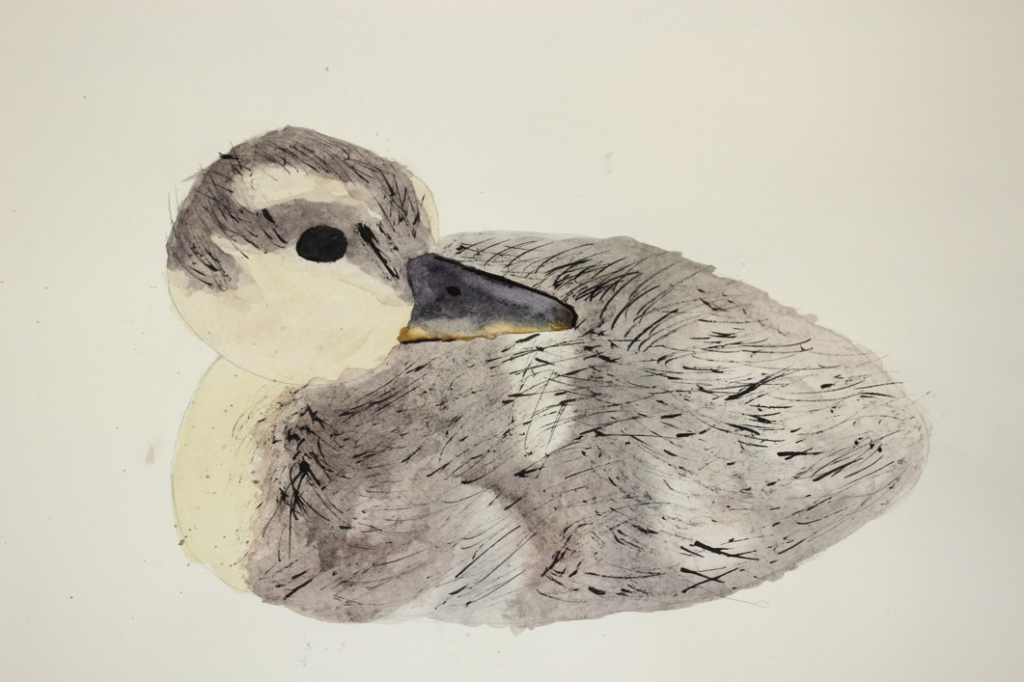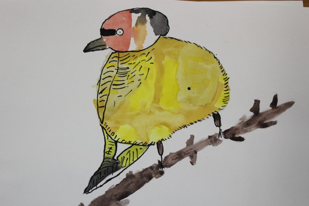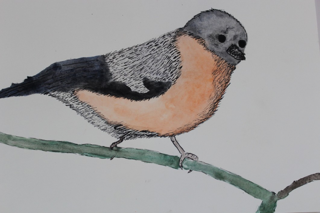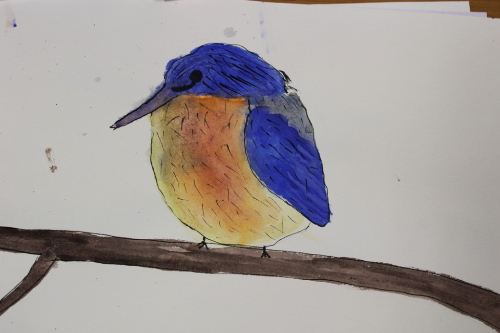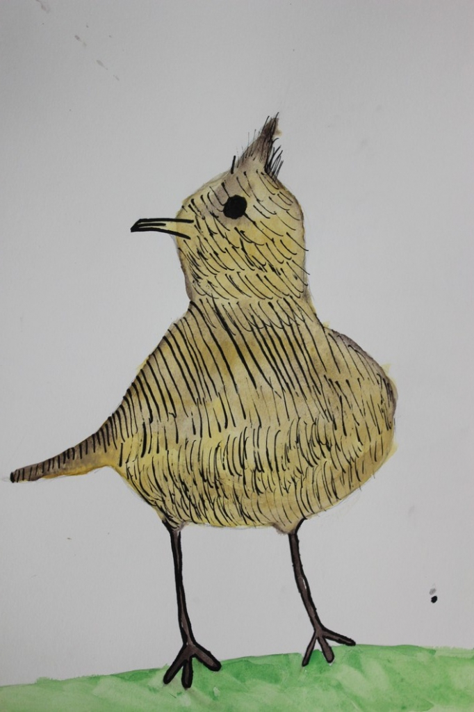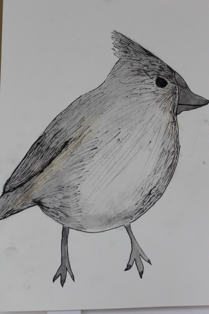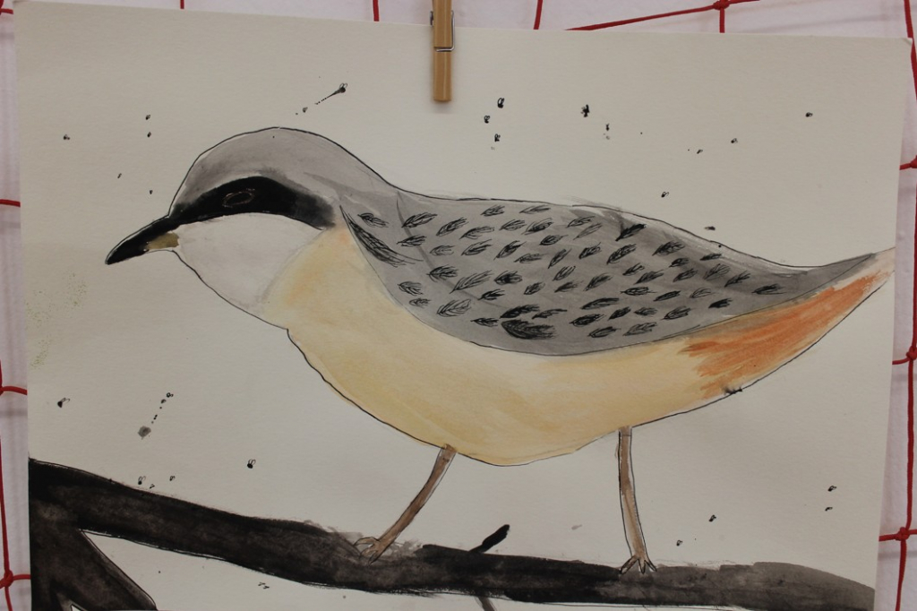 V dalším kroku jsme zkusili pracovat podle malých fotografií různých druhů ptáků, zejména ale těch, které najdeme v naší krajině, ať už migrují nebo zůstávají na zimu u nás. Žáci se seznámili s technikou akvarelu a pomocí této výtvarné techniky a dodatečné kresby perem a tuší tyto fotografie zvětšovali.