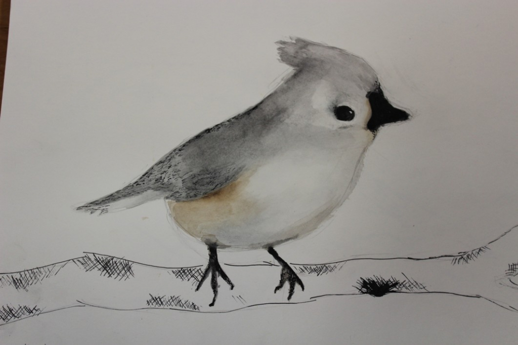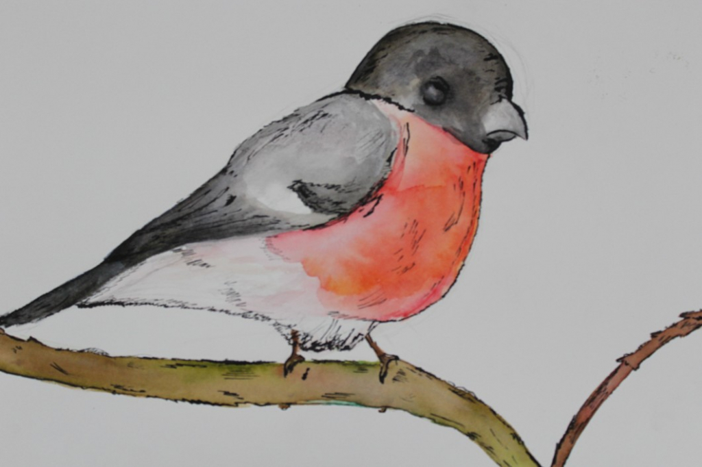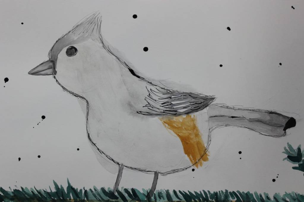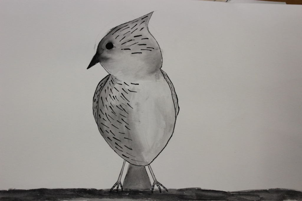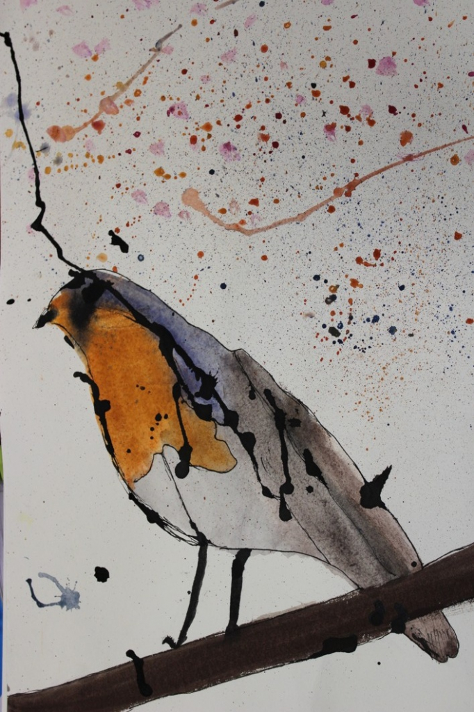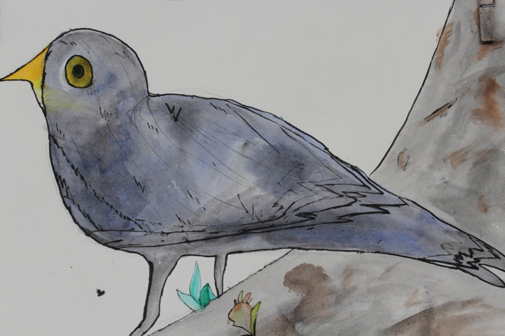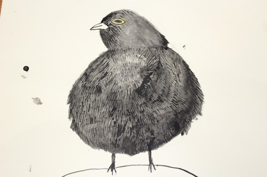 V dalším kroku jsme zkusili pracovat podle malých fotografií různých druhů ptáků, zejména ale těch, které najdeme v naší krajině, ať už migrují nebo zůstávají na zimu u nás. Žáci se seznámili s technikou akvarelu a pomocí této výtvarné techniky a dodatečné kresby perem a tuší tyto fotografie zvětšovali.