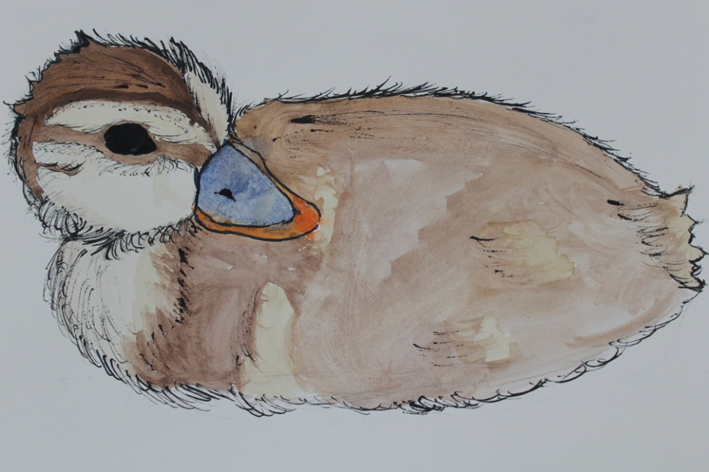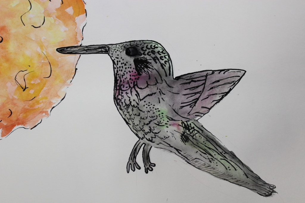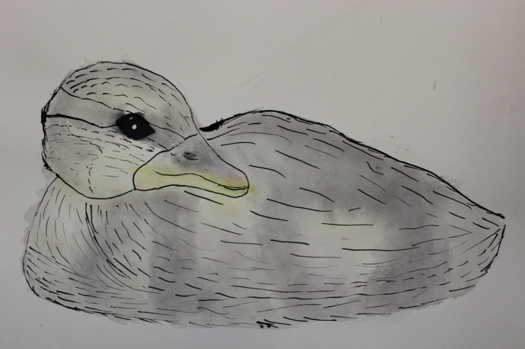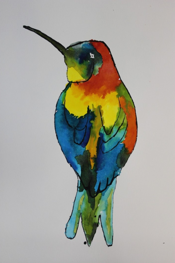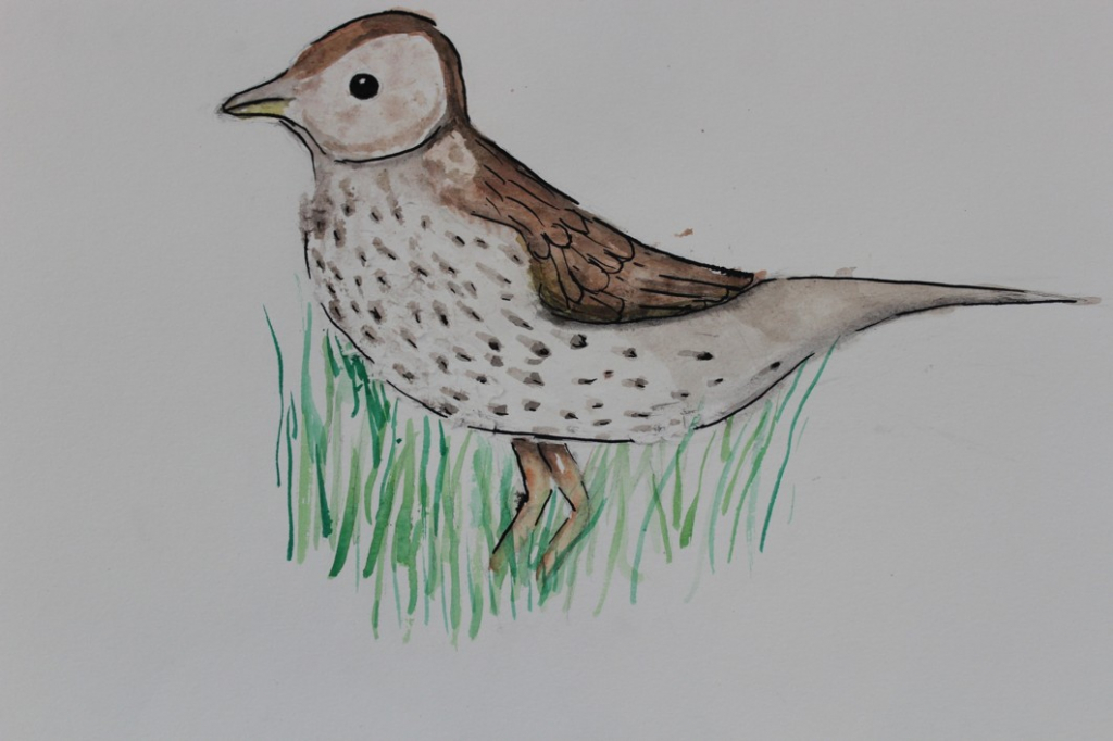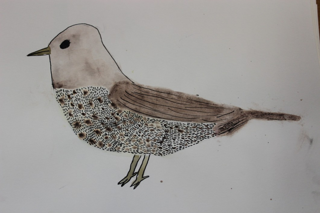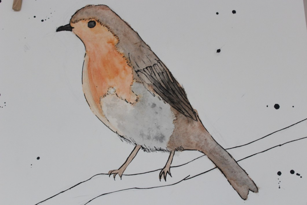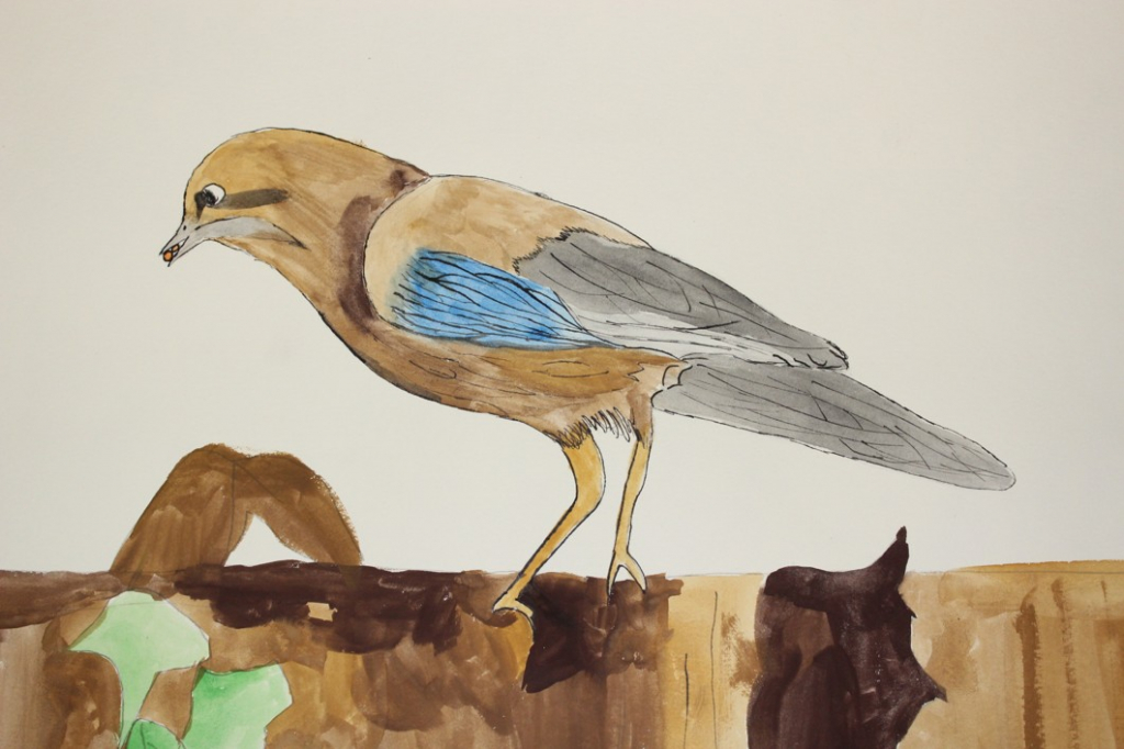 V dalším kroku jsme zkusili pracovat podle malých fotografií různých druhů ptáků, zejména ale těch, které najdeme v naší krajině, ať už migrují nebo zůstávají na zimu u nás. Žáci se seznámili s technikou akvarelu a pomocí této výtvarné techniky a dodatečné kresby perem a tuší tyto fotografie zvětšovali.