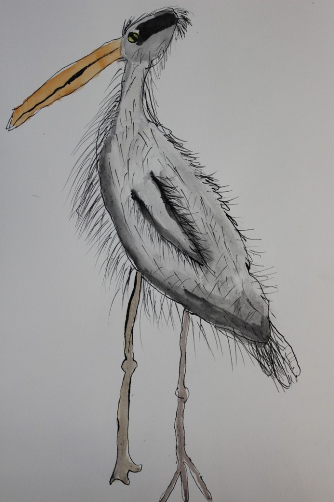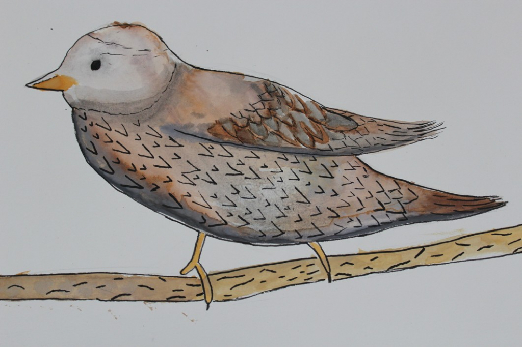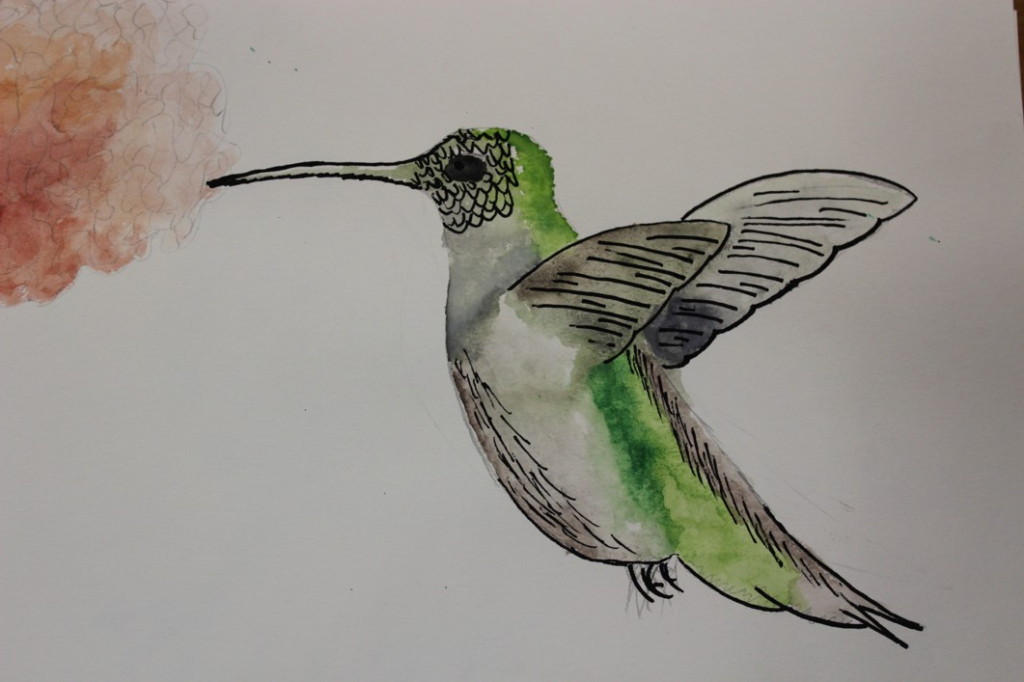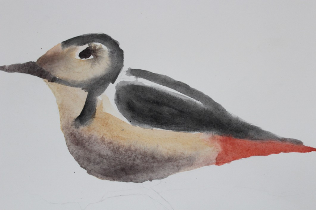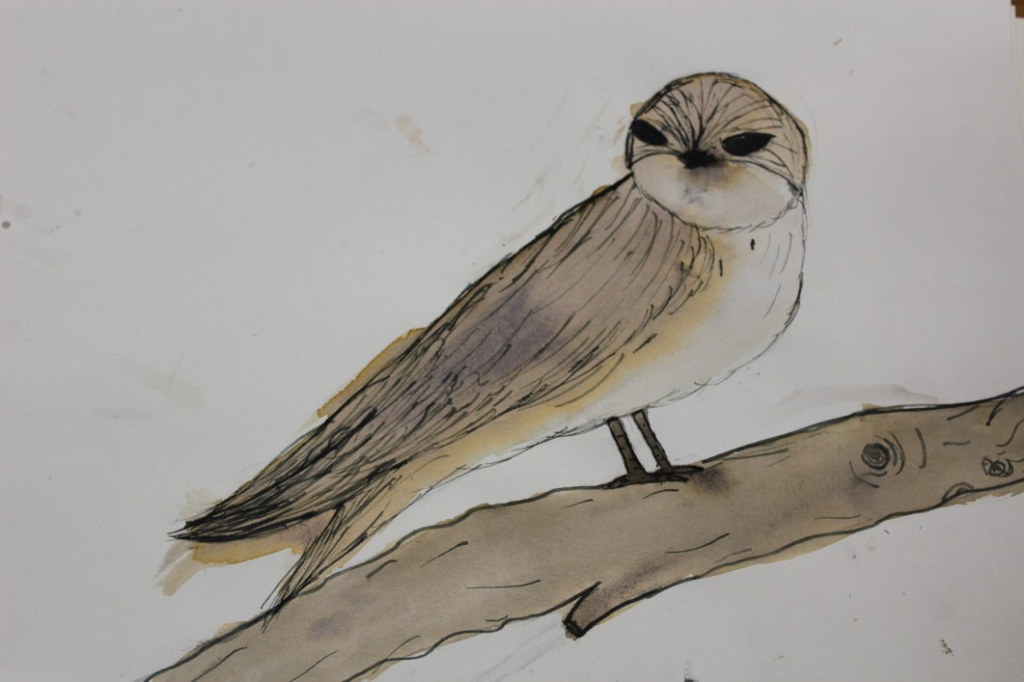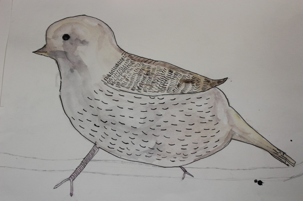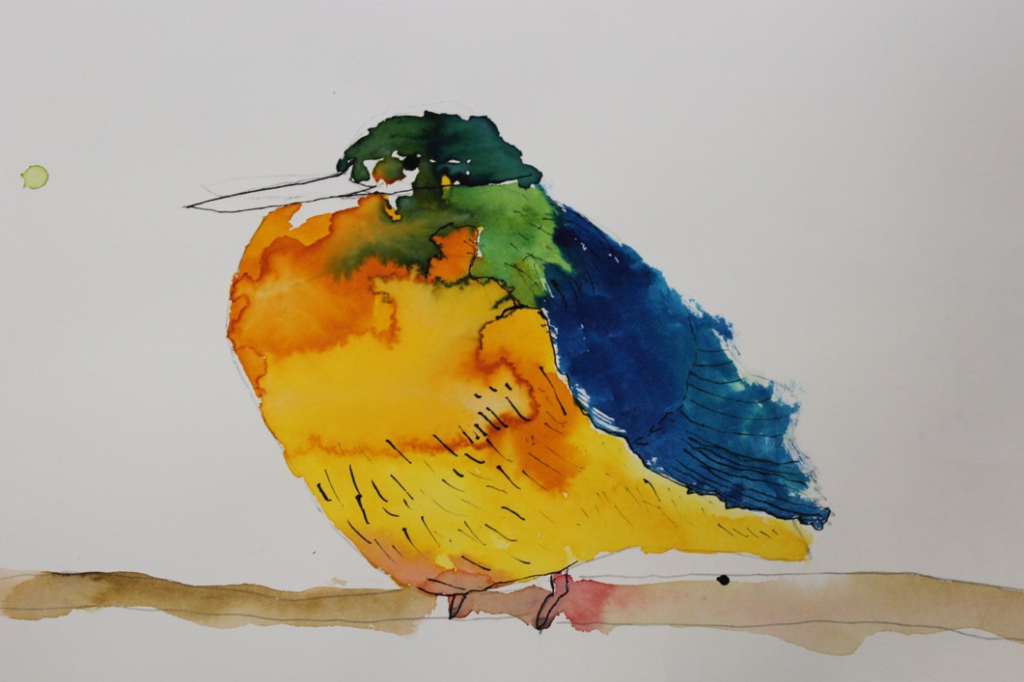V dalším kroku jsme zkusili pracovat podle malých fotografií různých druhů ptáků, zejména ale těch, které najdeme v naší krajině, ať už migrují nebo zůstávají na zimu u nás. Žáci se seznámili s technikou akvarelu a pomocí této výtvarné techniky a dodatečné kresby perem a tuší tyto fotografie zvětšovali.