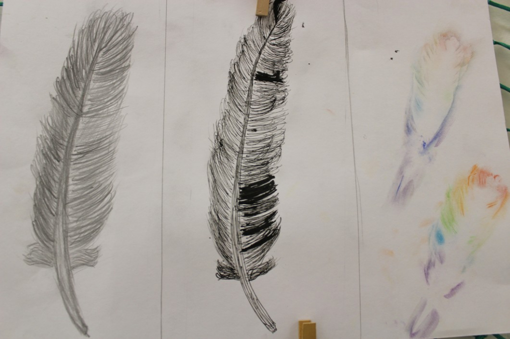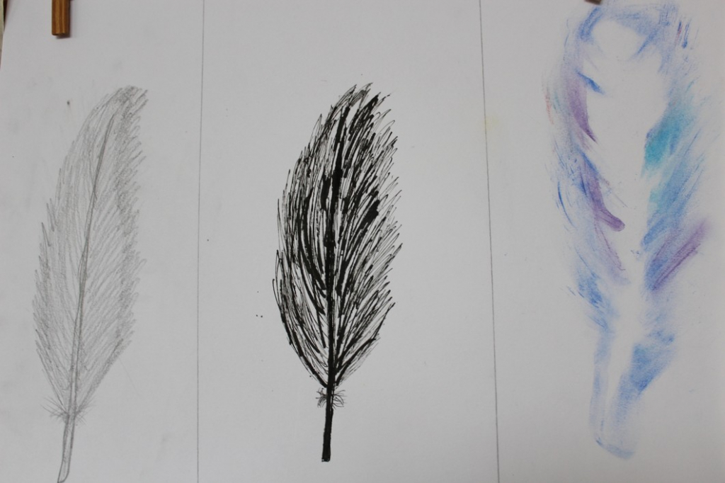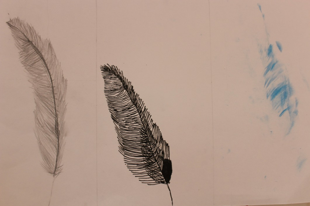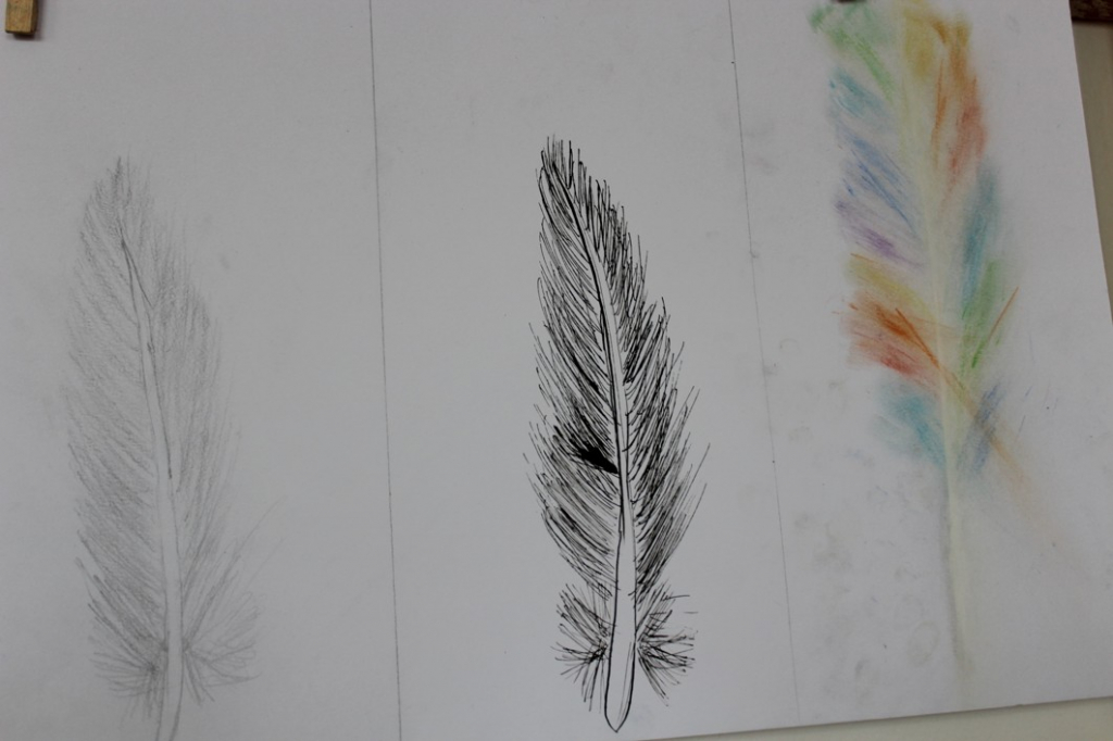 Jak je možné, že ptáci létají? Čím to je? No přece mají křídla, a na nich peří... V další hodině jsme se tedy pustili do pozorování jednotlivých peříček - žáci se "popasovali" s kresbou tužkou a následnou perokresbou a zachytili pírko v jeho detailech.