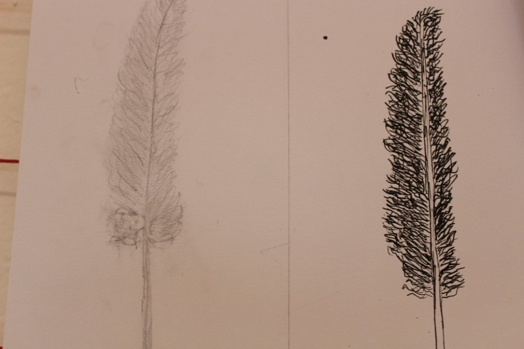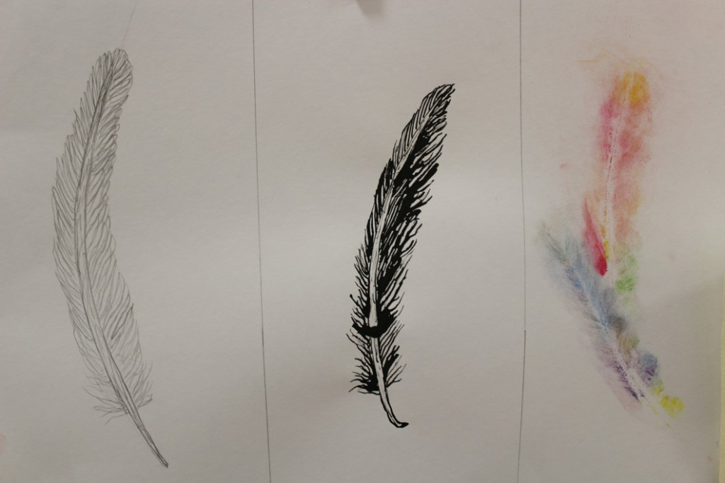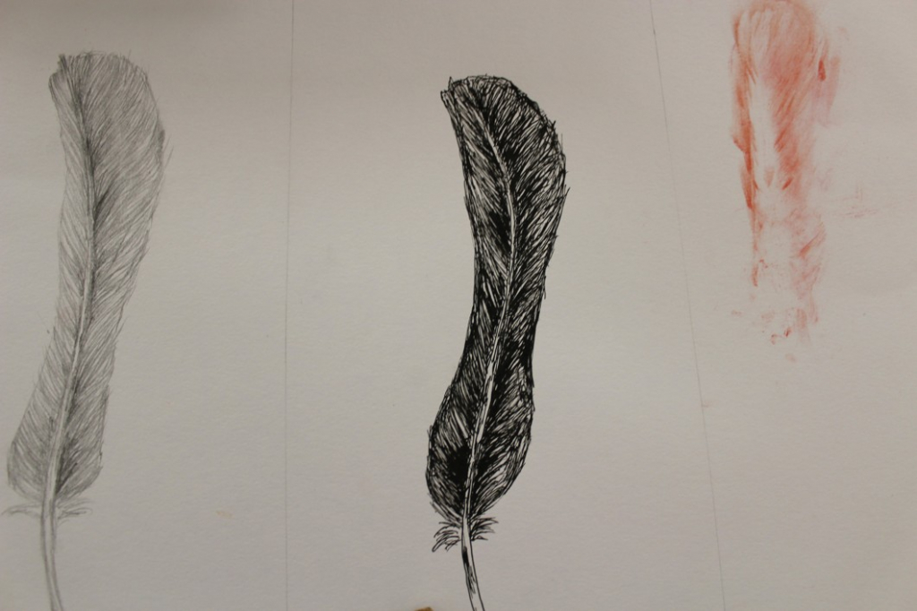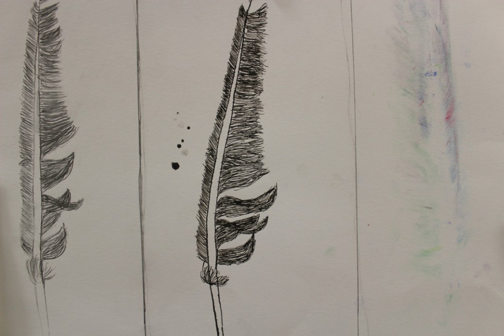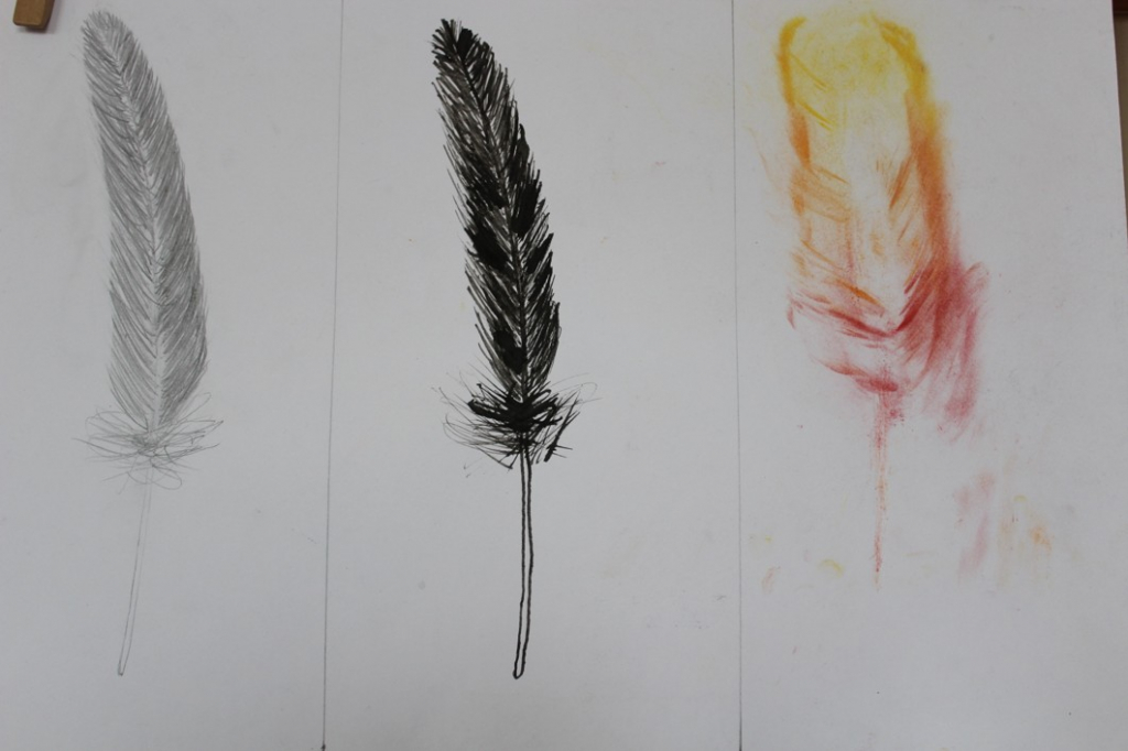 Jak je možné, že ptáci létají? Čím to je? No přece mají křídla, a na nich peří... V další hodině jsme se tedy pustili do pozorování jednotlivých peříček - žáci se "popasovali" s kresbou tužkou a následnou perokresbou a zachytili pírko v jeho detailech.