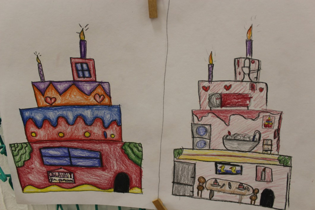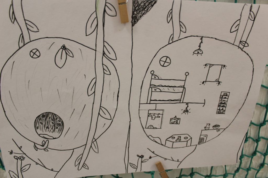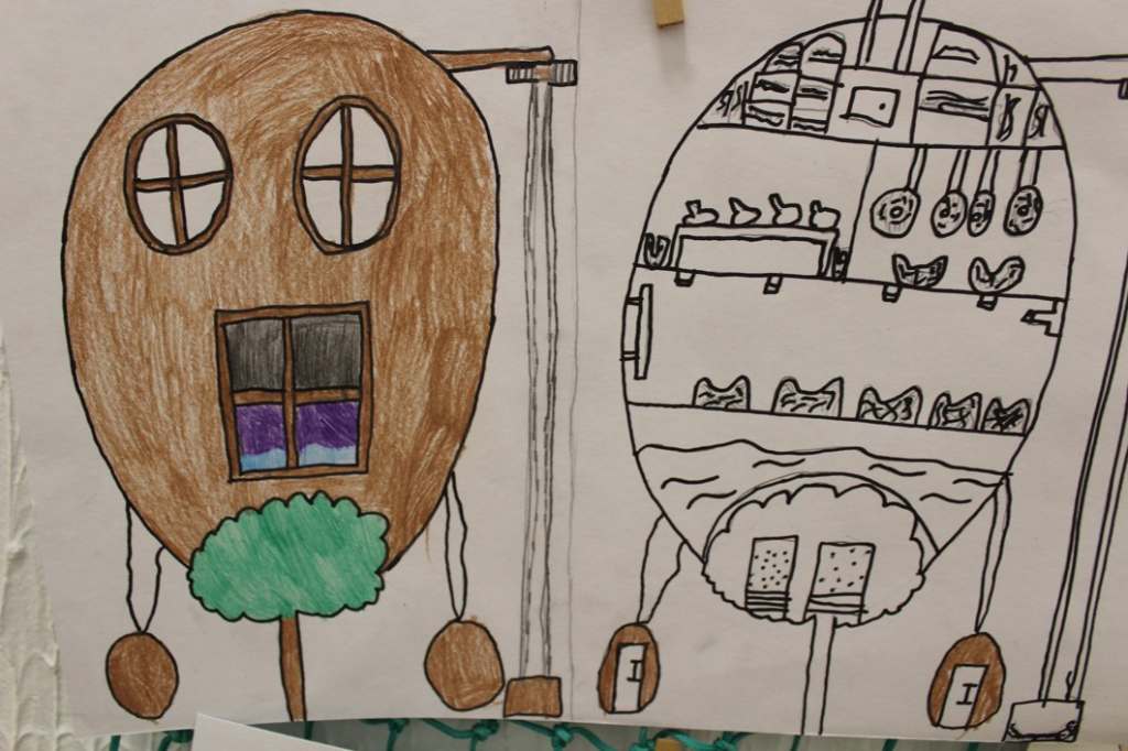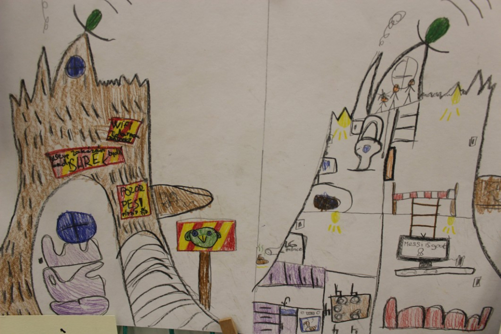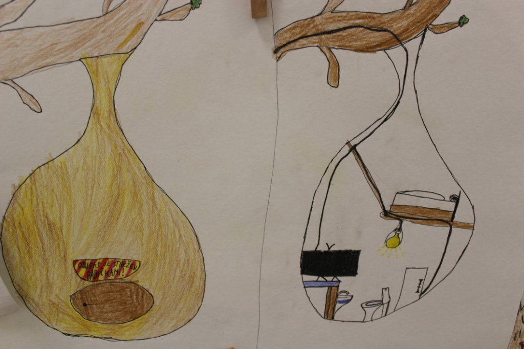 Nakonec jsme pro ptáky vymýšleli "dobré bydlo" - malí architekti z šestých tříd navrhovali obydlí kombinující prvky ptačího hnízda a lidského bydlení.