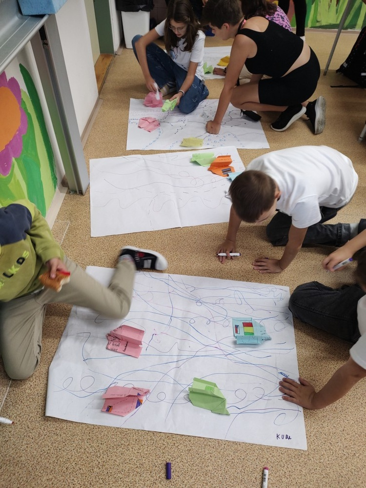 Nejprve jsme se bavili skládáním origami, konkrétně vlaštovky z papíru. Předtím, než jsme ji poskládali,napsali žáci na papír dopis - vzkaz, který vlaštovka na svých zádech ponese svým kamarádům v teplých krajích v Africe: každá vlaštovka "si vybrala" jednu africkou zemi, zjistila, kde země leží a kudy tam poletí, a taky vzala s sebou nějaký dárek z Česka. Potom z dopisu každý žák poskládal svou vlaštovku a "vypustil" po větru do vzduchu, sledoval její dráhu letu a vše zaznamenal na velký arch papíru.