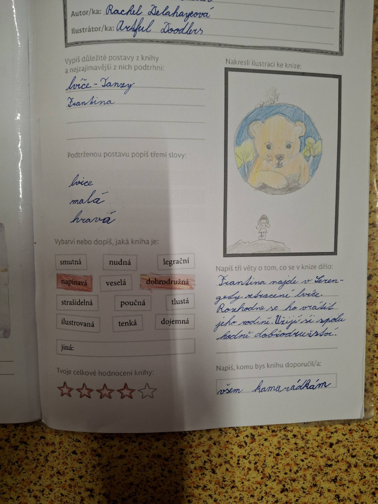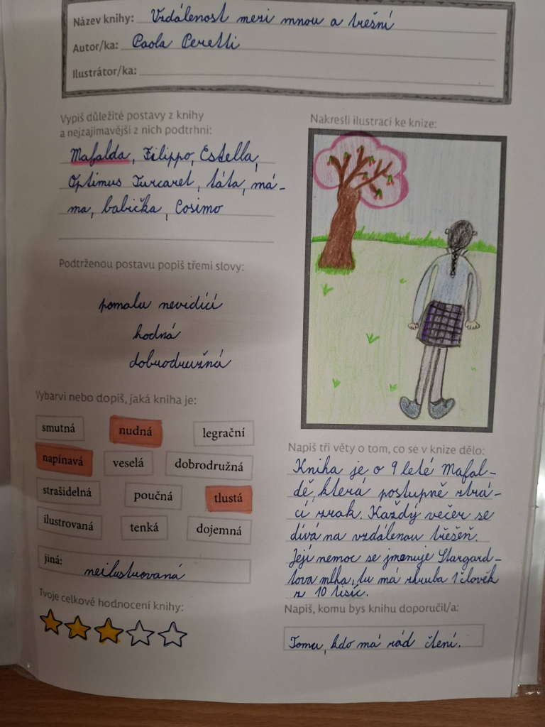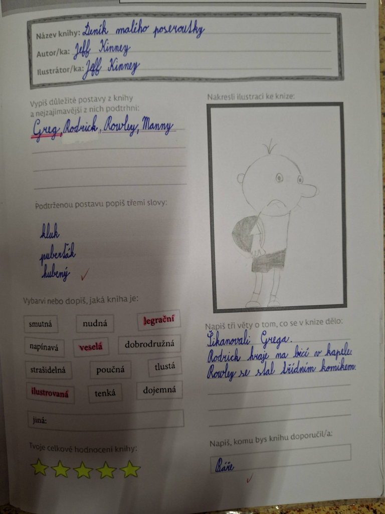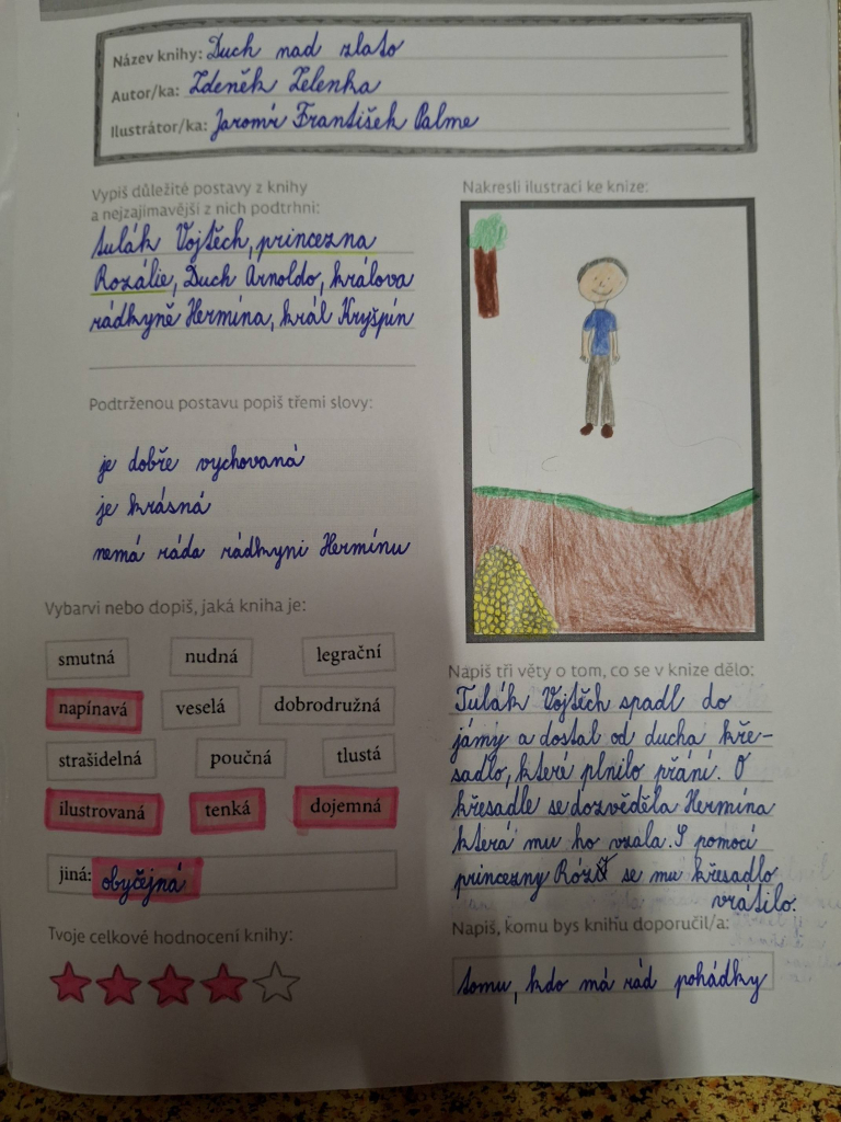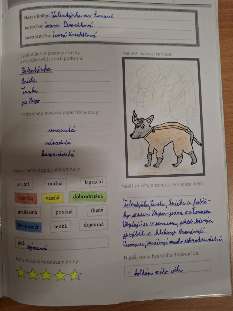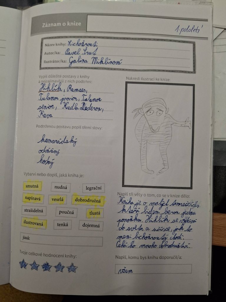 Dopřáli jsme si ve čtení příjemné chvíle s knihami. Žáci si je sami vybrali a přinesli. Každý z nich měl možnost svou knihu stručně představit spolužákům. Je pro nás vždy inspirativní dozvědět se, proč si ji někdo vybral, co ho zaujalo nebo proč by si ji měli přečíst i ostatní. Prezentace byly krátké, ale splnily hlavní cíl. Staly se pro mnohé motivací k jejich další četbě. Během setkání měli spolužáci možnost do knih nahlédnout, prolistovat je, prozkoumat si jejich ilustrace, případně se do nich i začíst. Atmosféra ve třídě se tak na chvíli proměnila v malé čtenářské setkání, kde se sdílely tipy, dojmy a radost z příběhů.