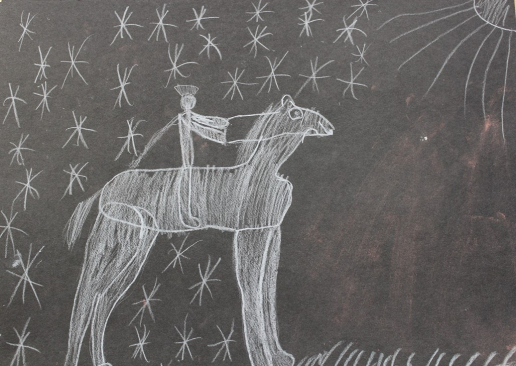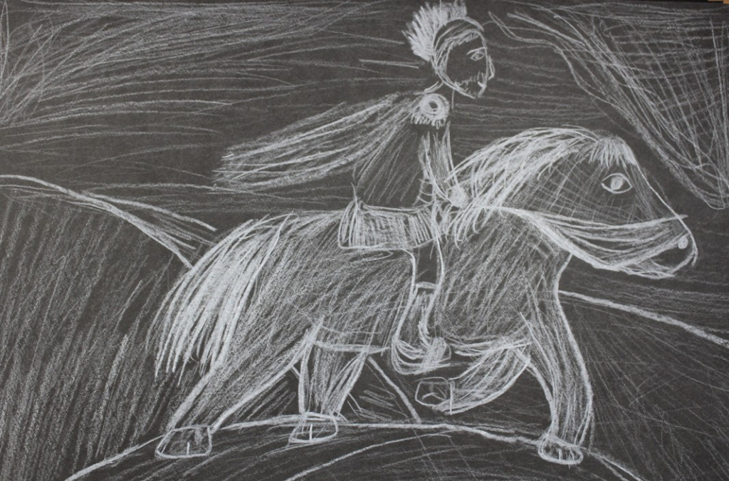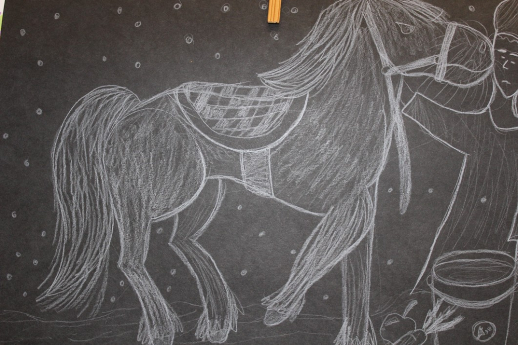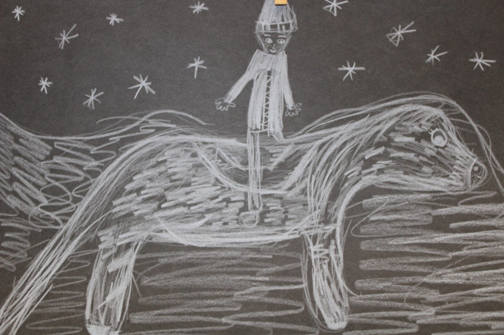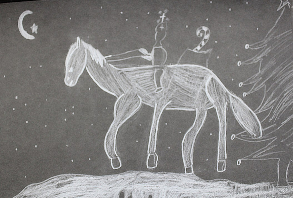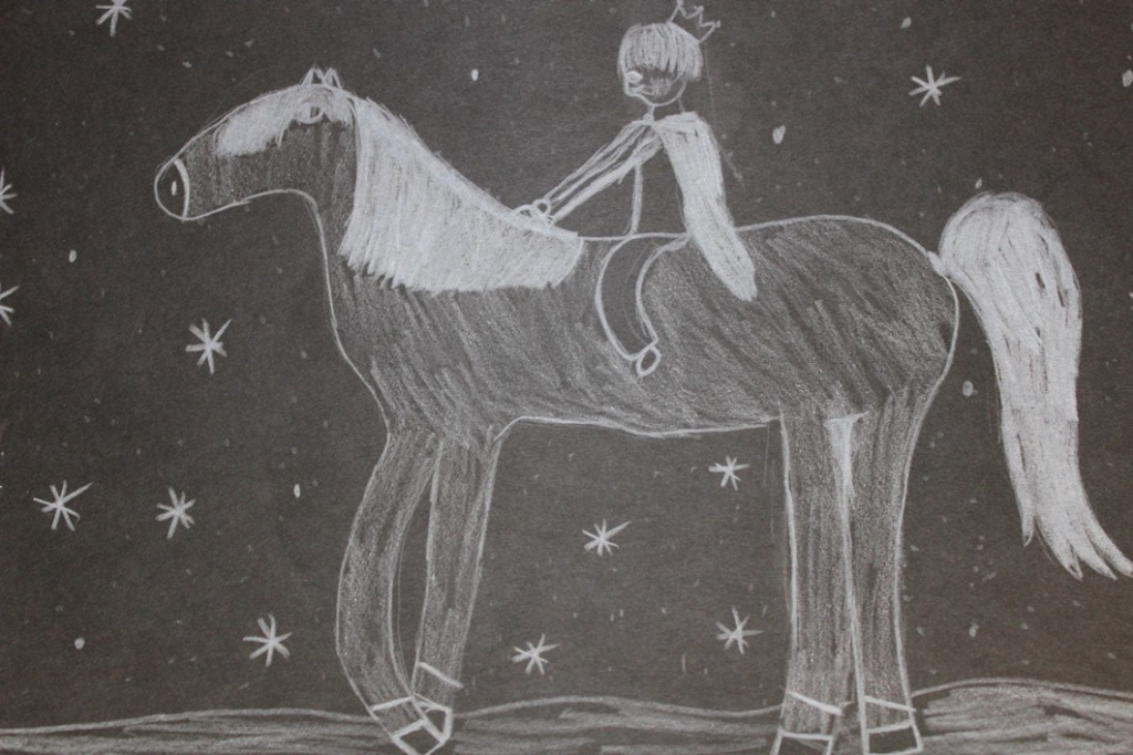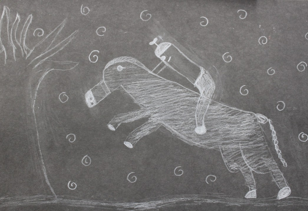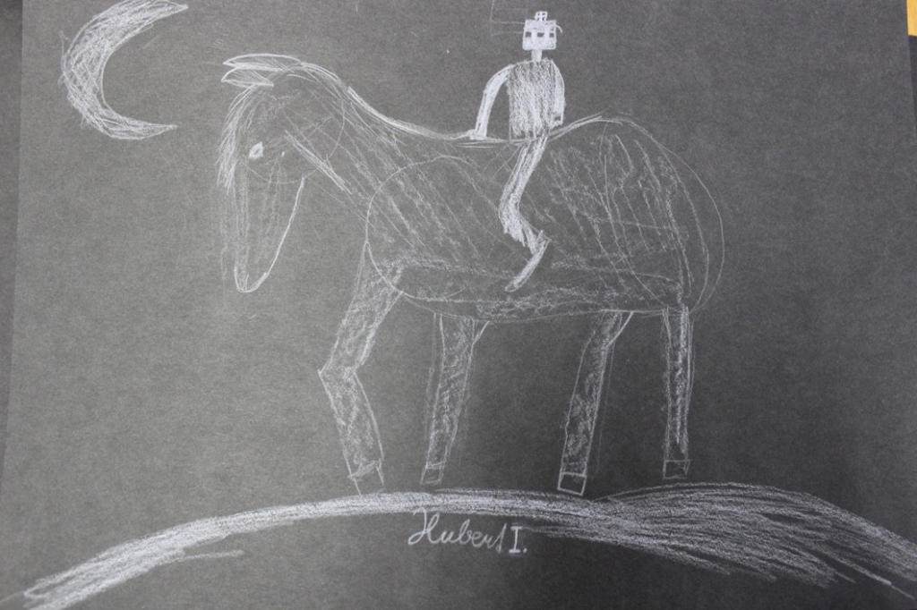 S žáky v 6. ročníku jsme tento přírodní jev znázornili kresbou bílou pastelkou na černý podklad. Bez předlohy, bez předkreslení. Nebyl to snadný úkol - ruku na srdce: kdo z nás dokáže nakreslit koně a na něm sedící postavu? Výsledkem jsou spontánní práce, kdy každá je jedinečným originálem či vtipnou ilustrací.