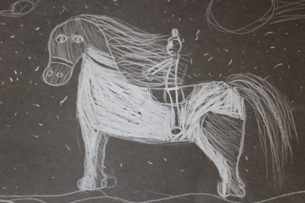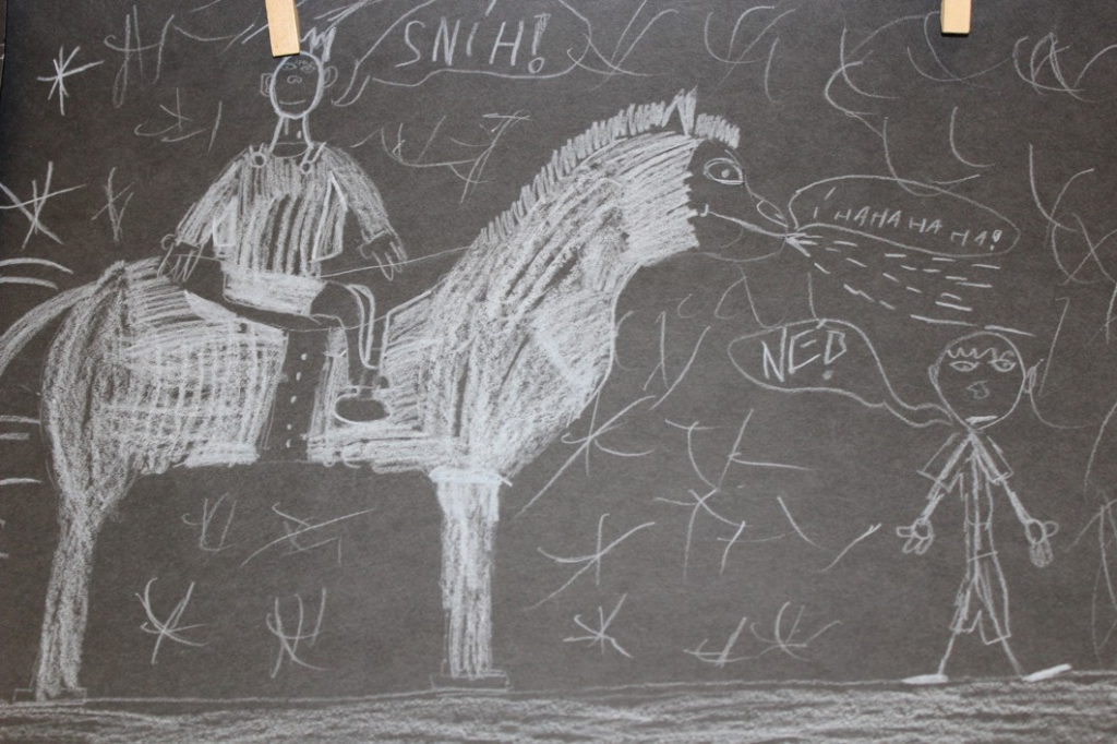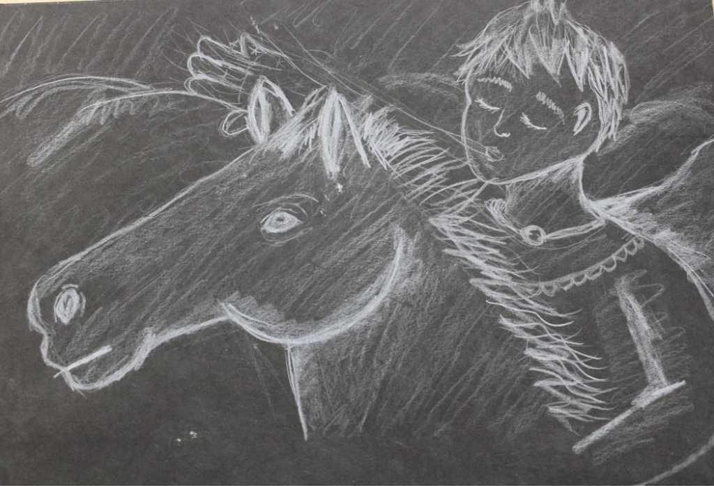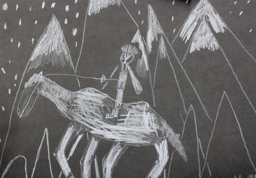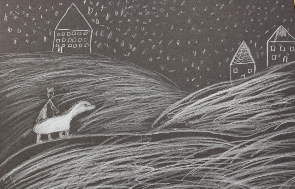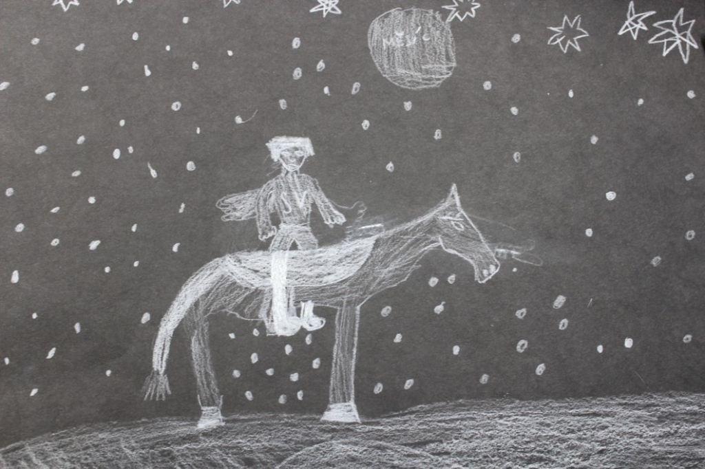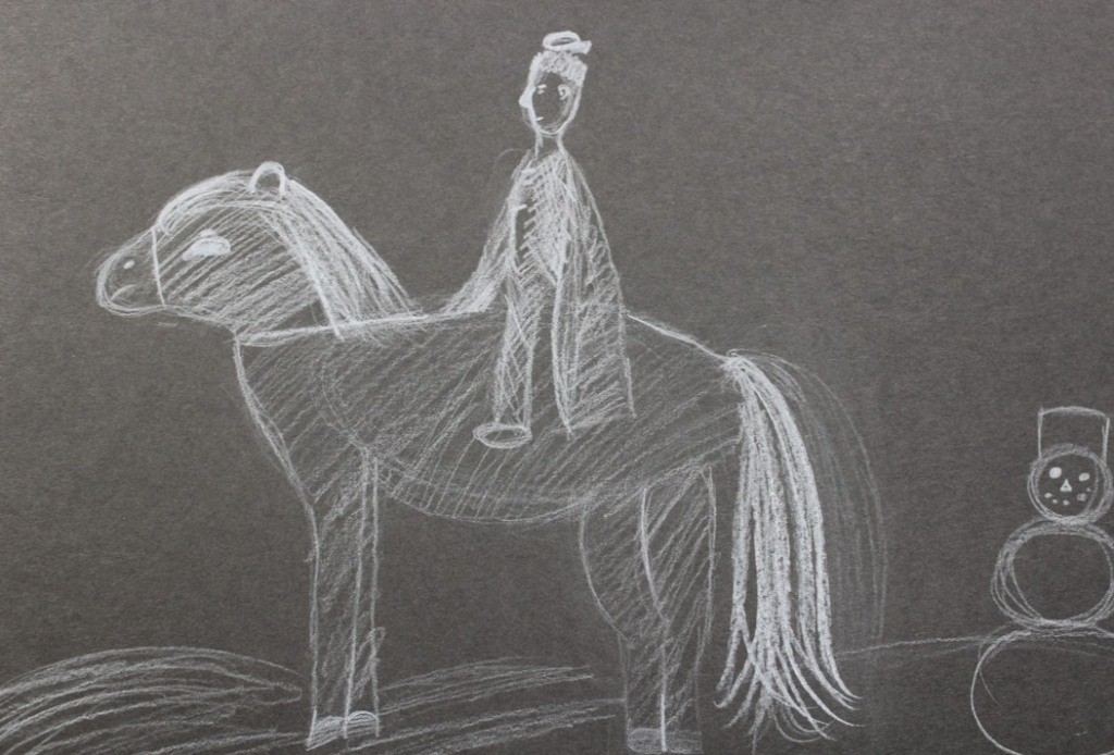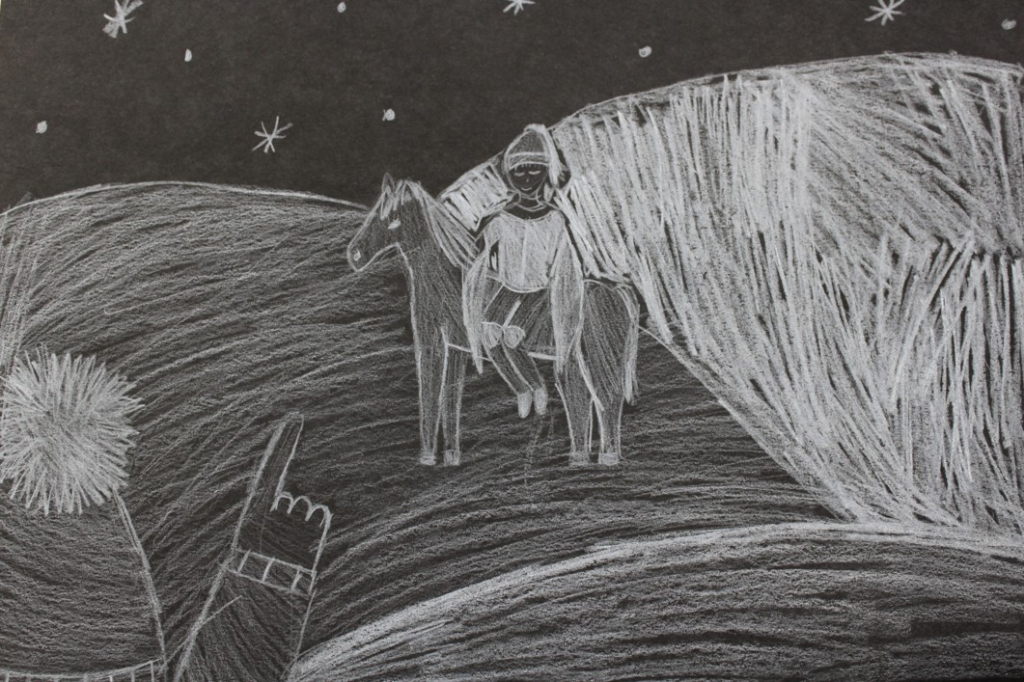 S žáky v 6. ročníku jsme tento přírodní jev znázornili kresbou bílou pastelkou na černý podklad. Bez předlohy, bez předkreslení. Nebyl to snadný úkol - ruku na srdce: kdo z nás dokáže nakreslit koně a na něm sedící postavu? Výsledkem jsou spontánní práce, kdy každá je jedinečným originálem či vtipnou ilustrací.
