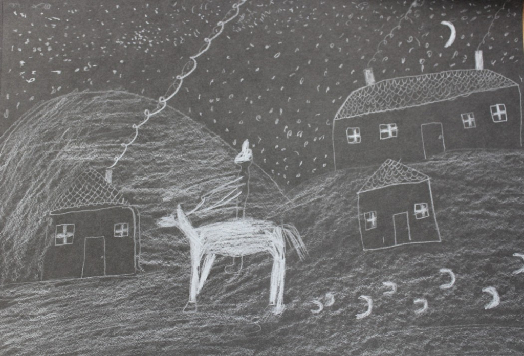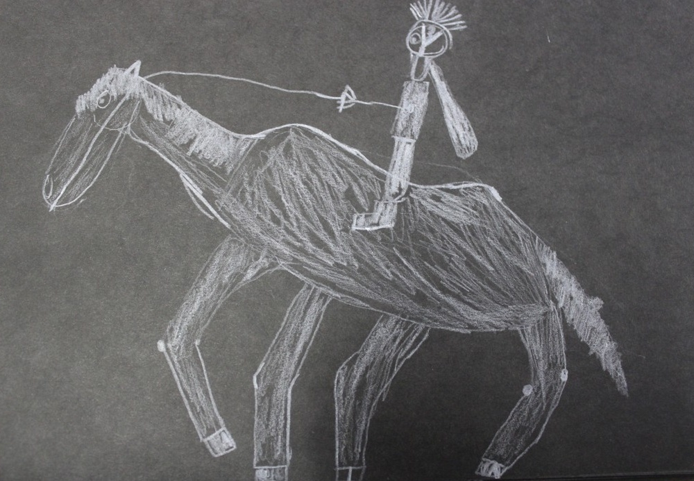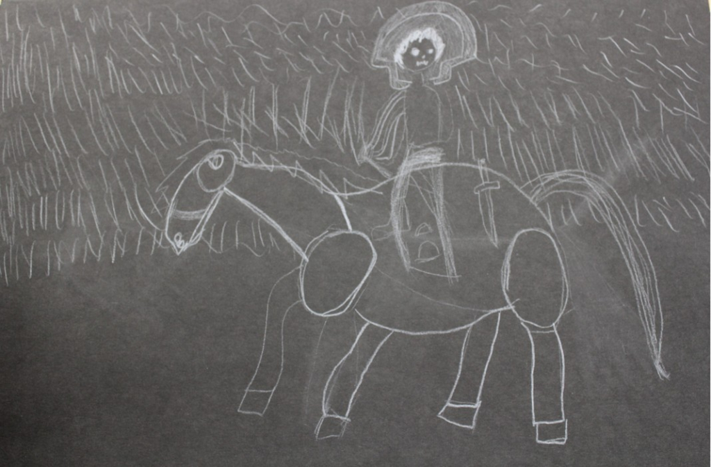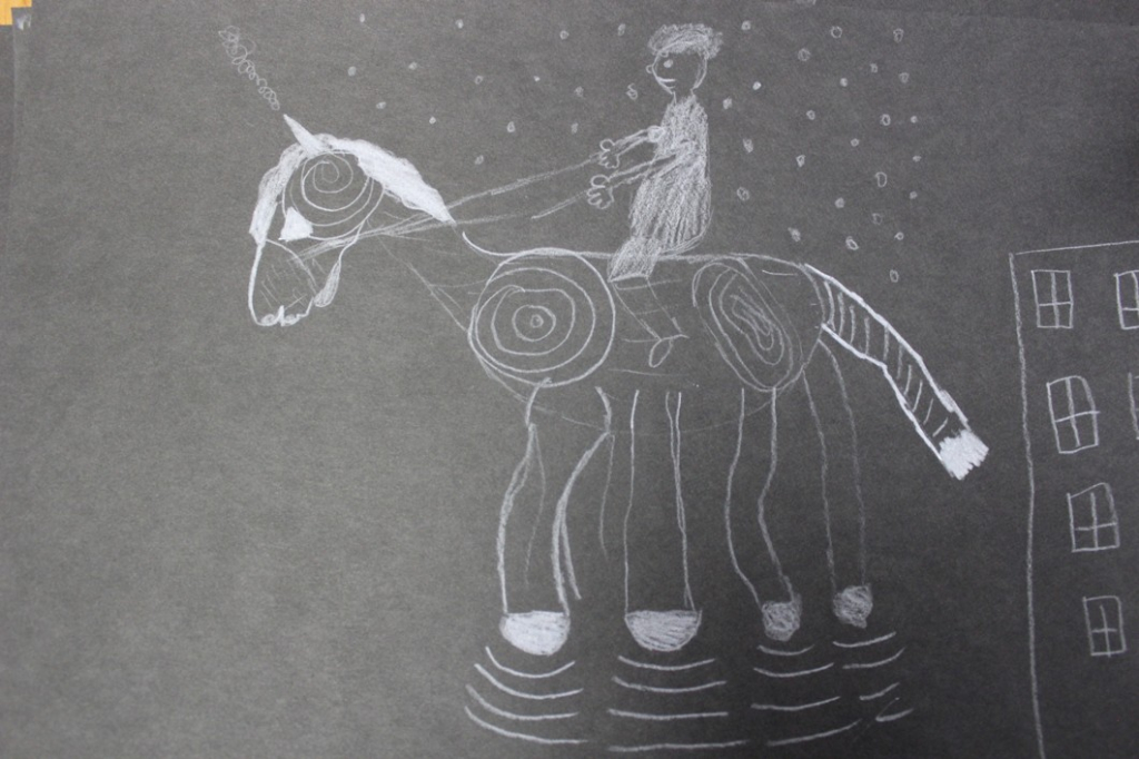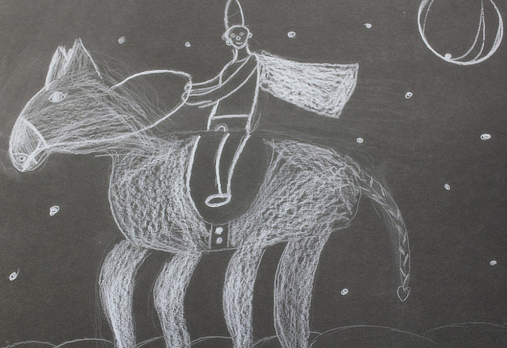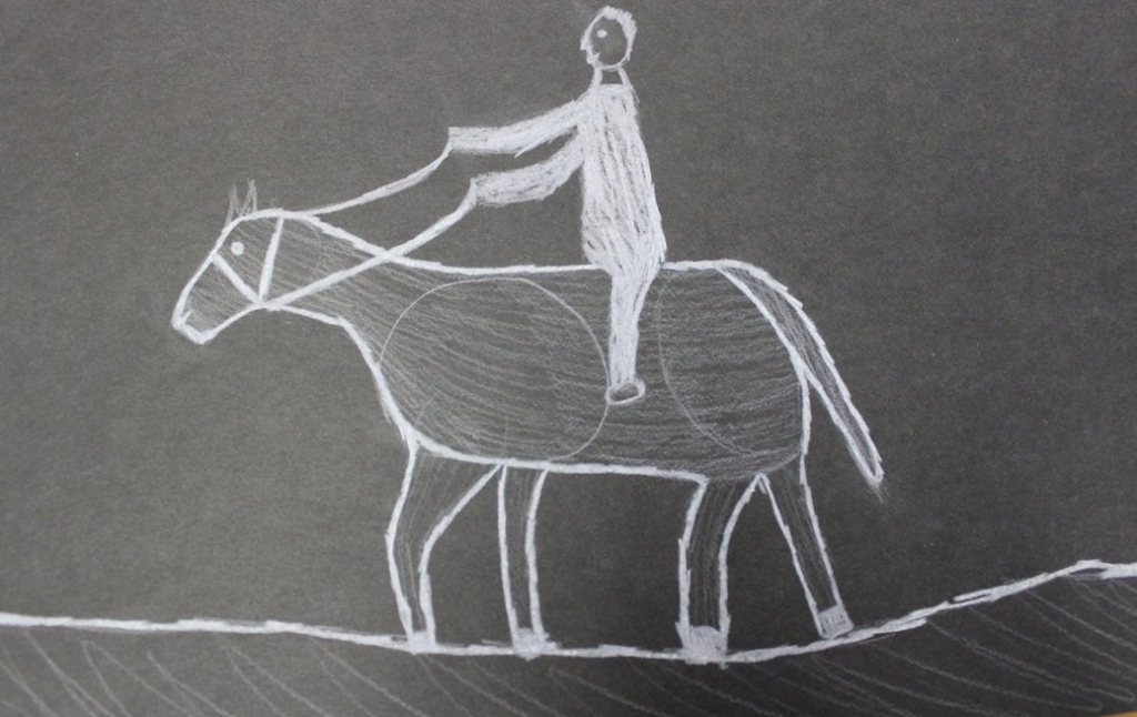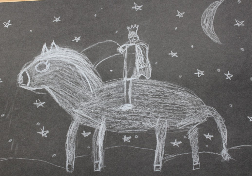 S žáky v 6. ročníku jsme tento přírodní jev znázornili kresbou bílou pastelkou na černý podklad. Bez předlohy, bez předkreslení. Nebyl to snadný úkol - ruku na srdce: kdo z nás dokáže nakreslit koně a na něm sedící postavu? Výsledkem jsou spontánní práce, kdy každá je jedinečným originálem či vtipnou ilustrací.