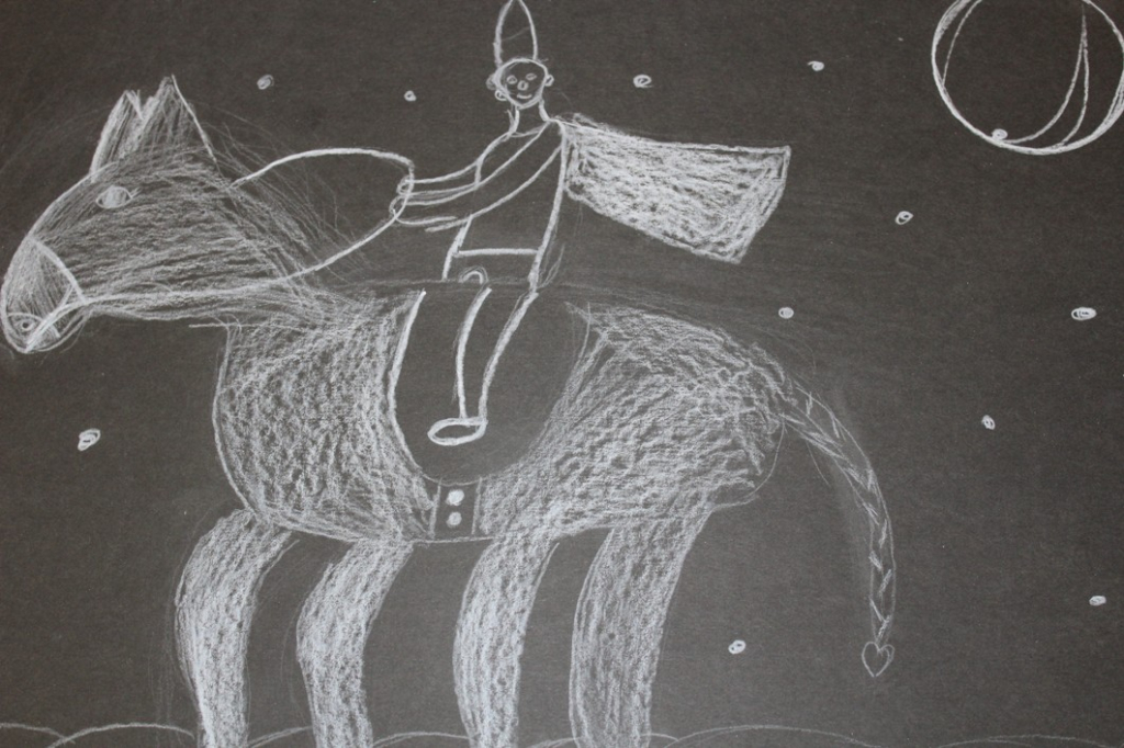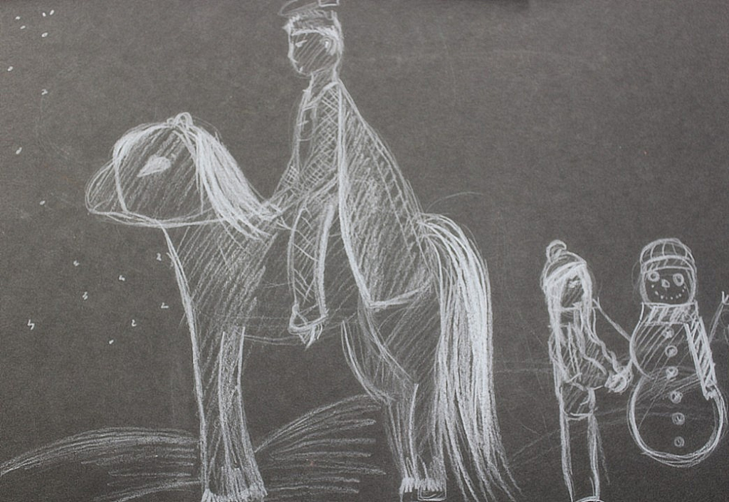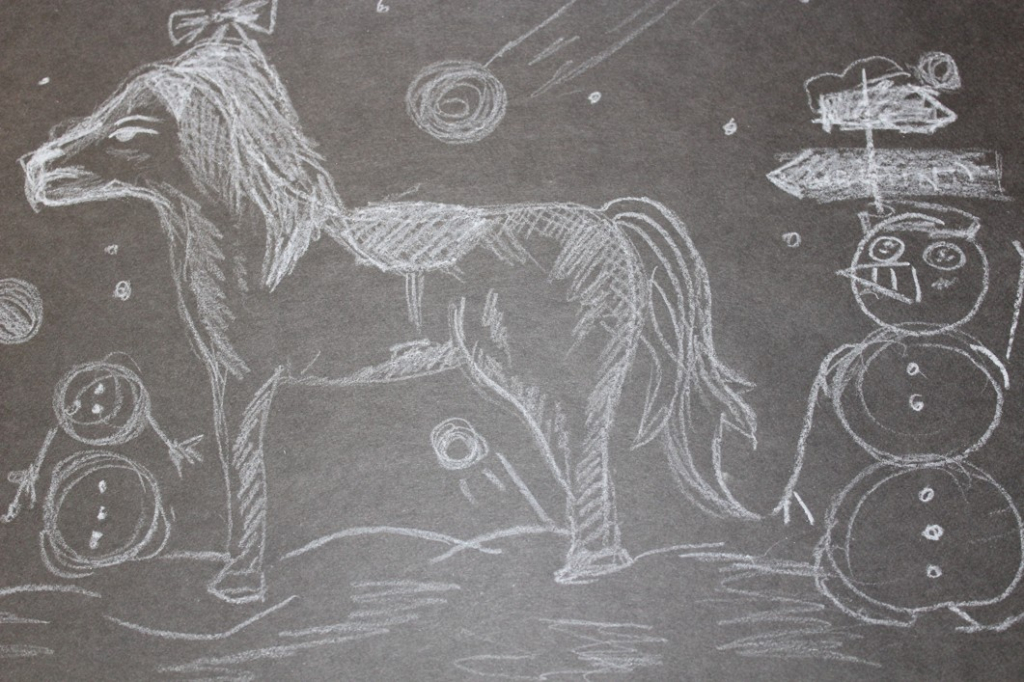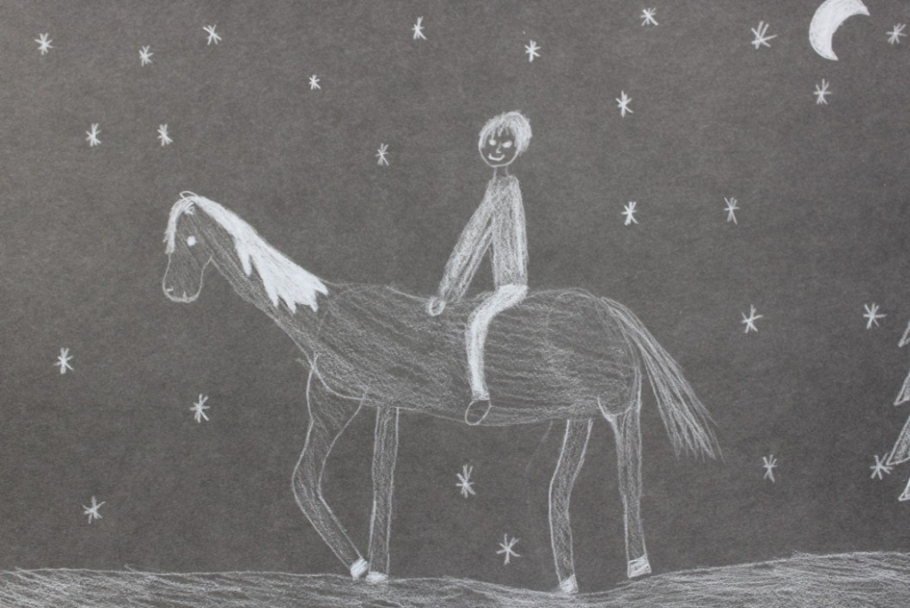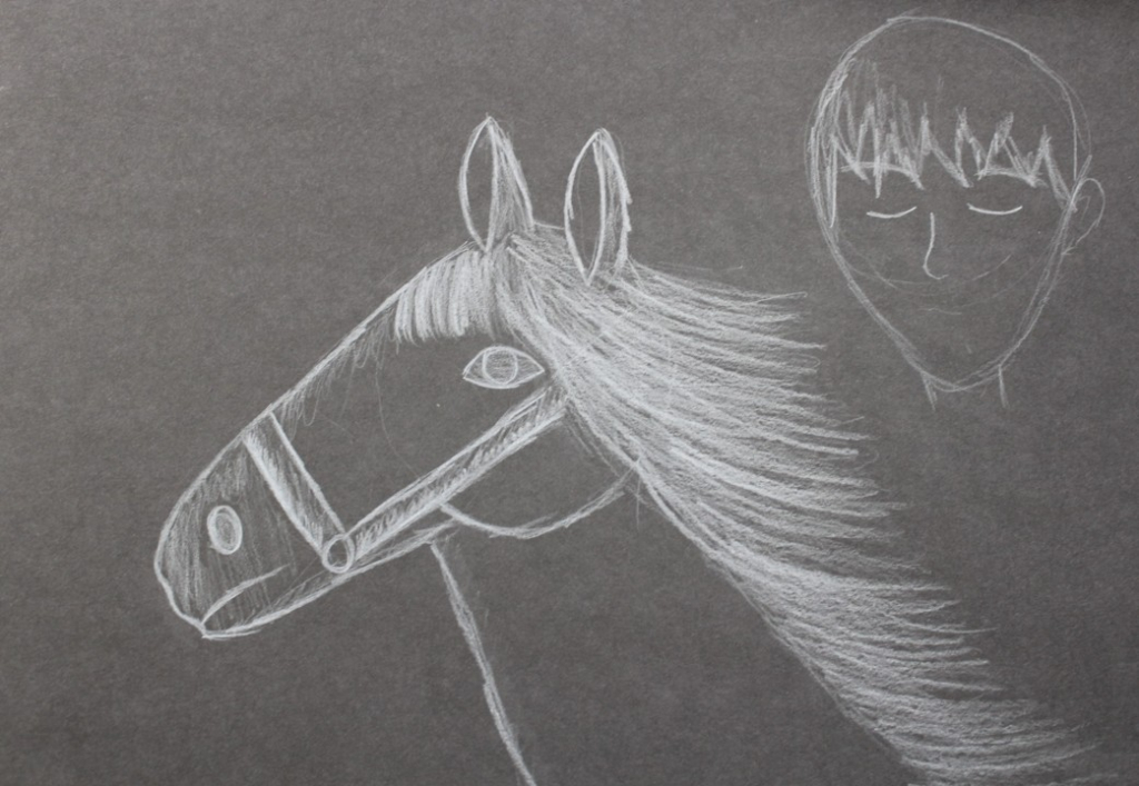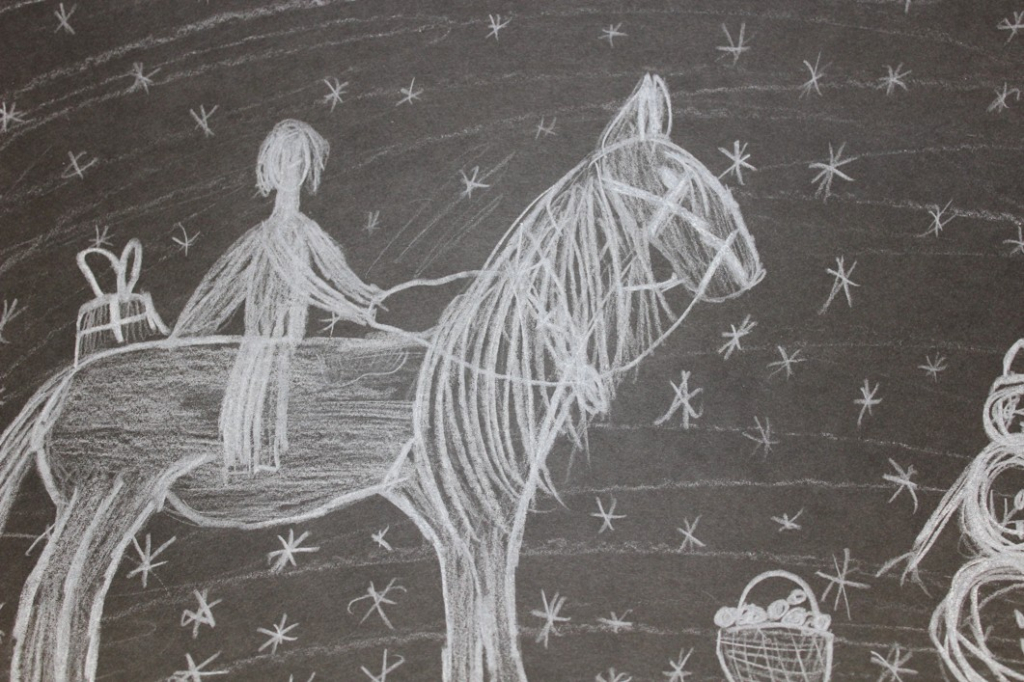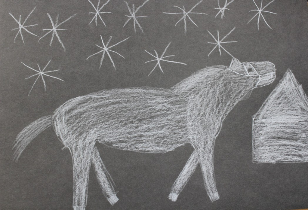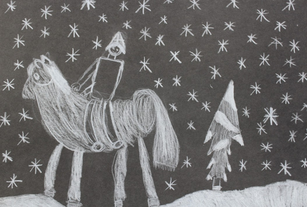 S žáky v 6. ročníku jsme tento přírodní jev znázornili kresbou bílou pastelkou na černý podklad. Bez předlohy, bez předkreslení. Nebyl to snadný úkol - ruku na srdce: kdo z nás dokáže nakreslit koně a na něm sedící postavu? Výsledkem jsou spontánní práce, kdy každá je jedinečným originálem či vtipnou ilustrací.