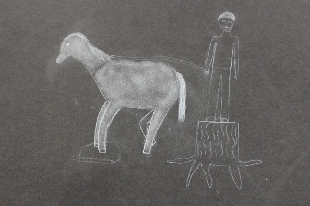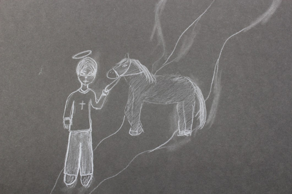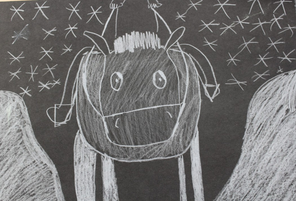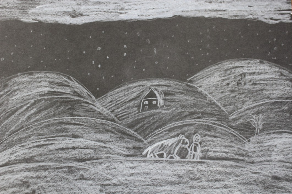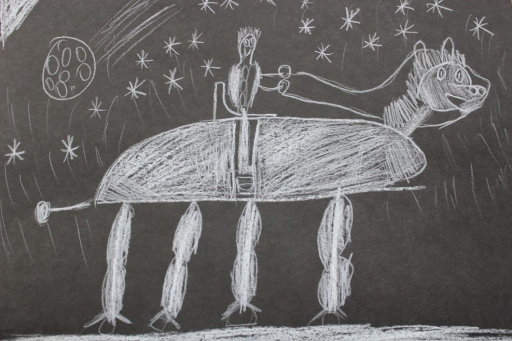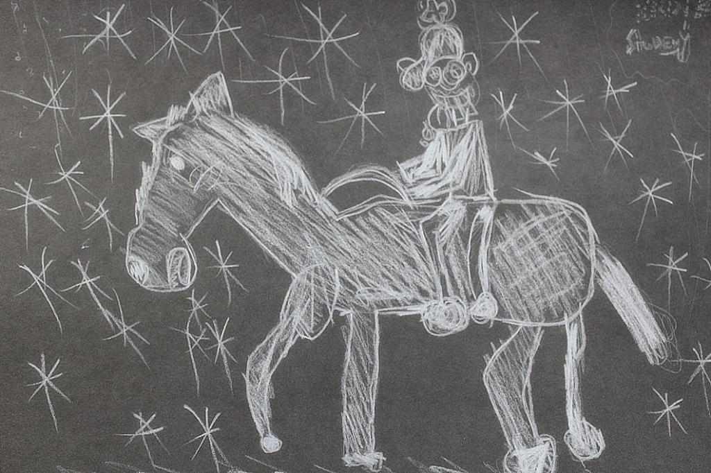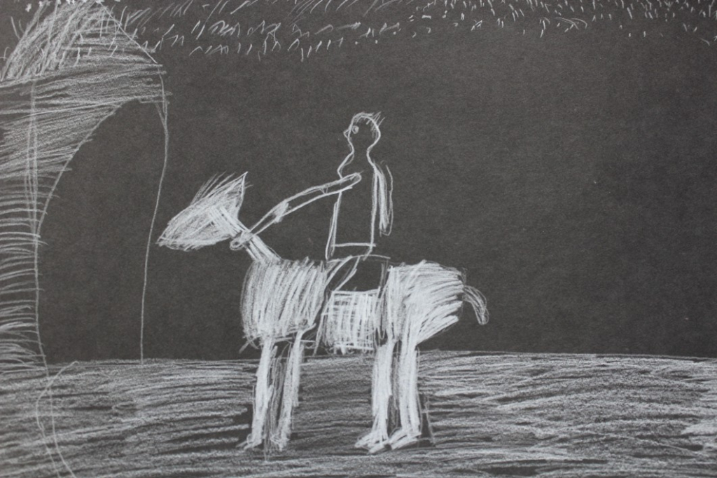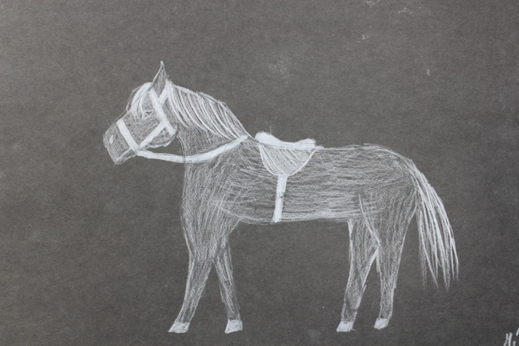 S žáky v 6. ročníku jsme tento přírodní jev znázornili kresbou bílou pastelkou na černý podklad. Bez předlohy, bez předkreslení. Nebyl to snadný úkol - ruku na srdce: kdo z nás dokáže nakreslit koně a na něm sedící postavu? Výsledkem jsou spontánní práce, kdy každá je jedinečným originálem či vtipnou ilustrací.