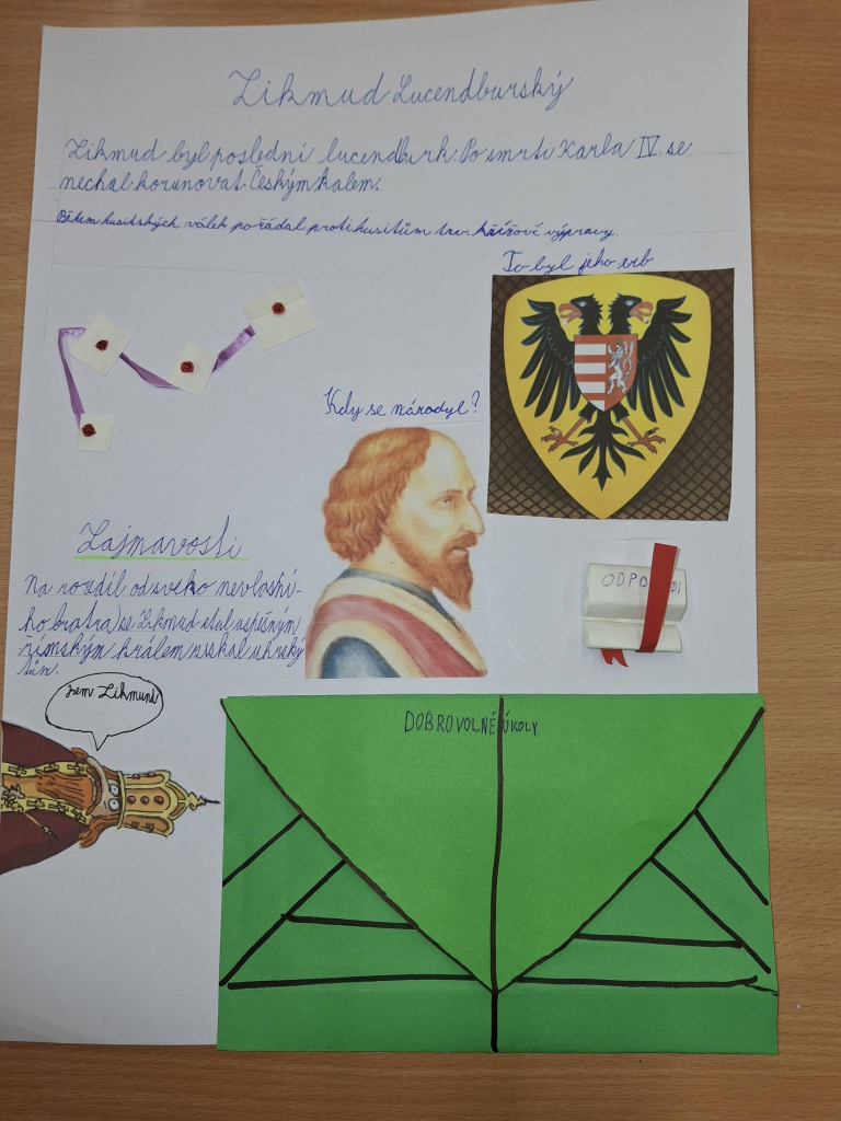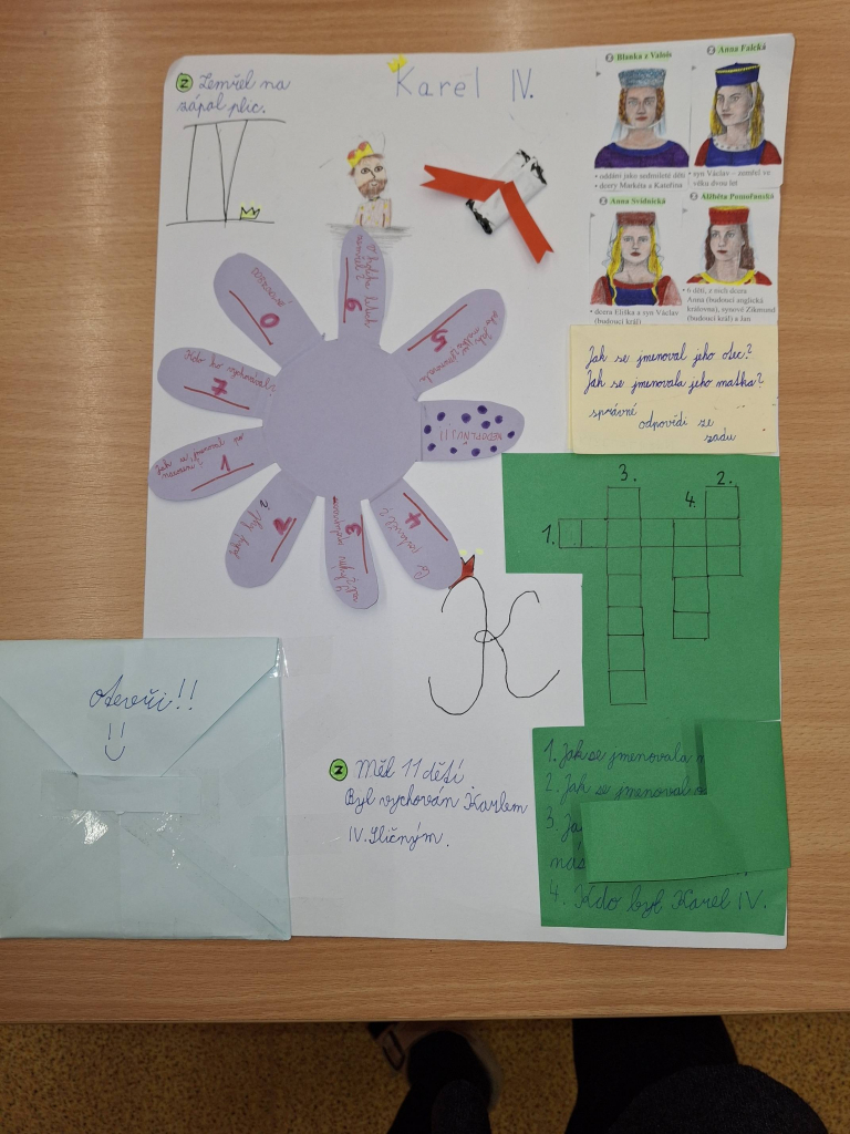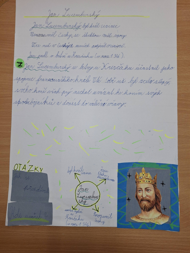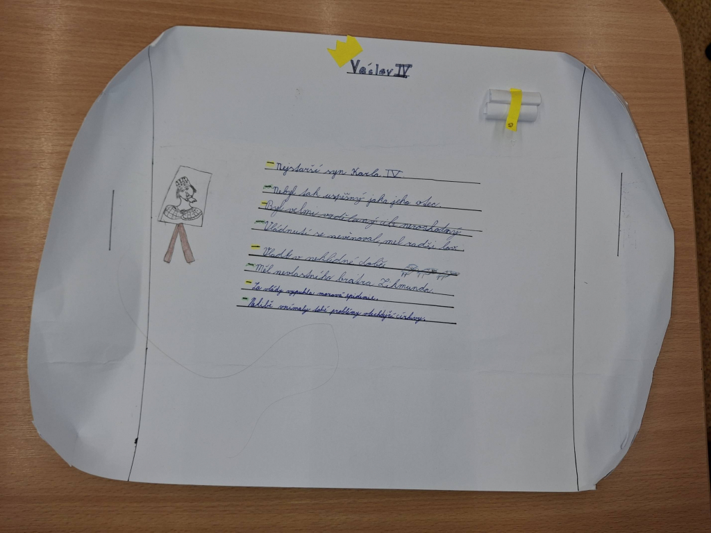 V hodinách vlastivědy se děti zapojily do skupinové aktivity zaměřené na upevnění znalostí o významných panovnících z rodů Přemyslovců a Lucemburků. Každá skupina si vylosovala konkrétního panovníka, o kterém společně vyhledávala informace, třídila je a následně zpracovávala. Důraz byl kladen na spolupráci, rozdělení rolí a vzájemnou komunikaci mezi žáky.