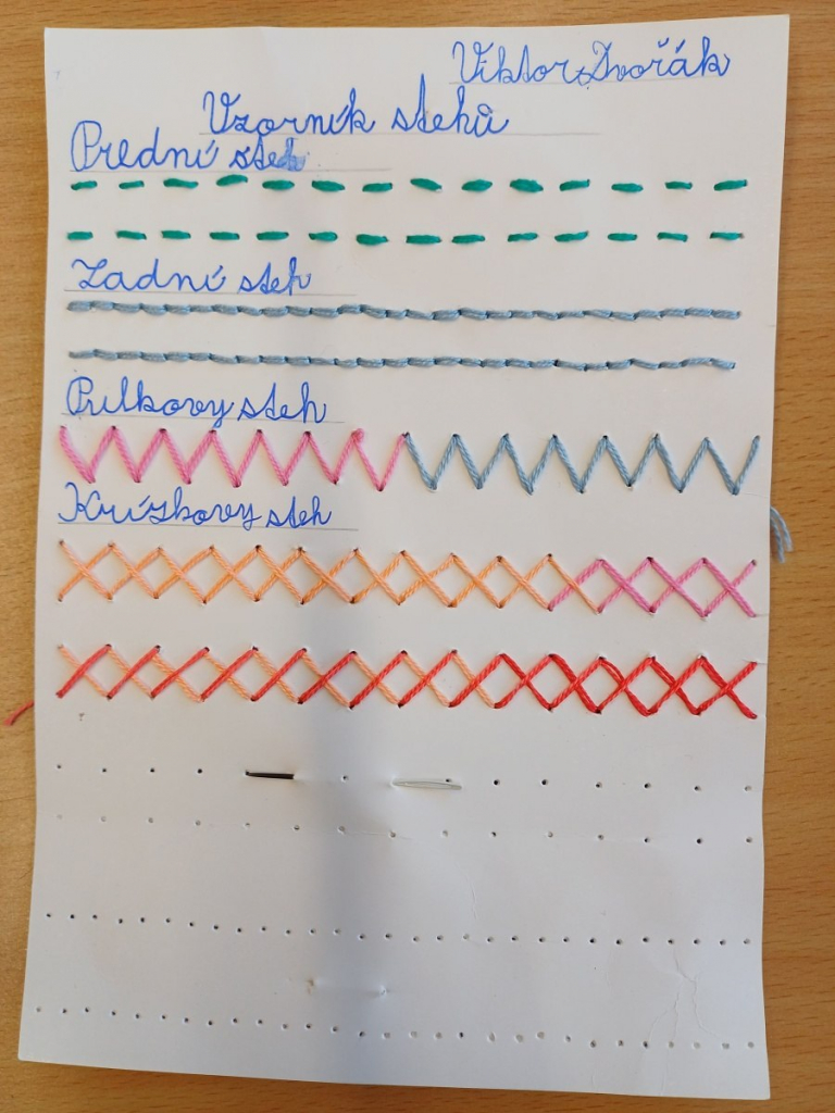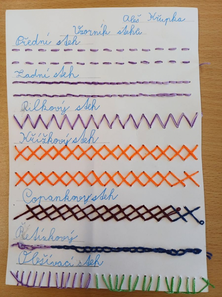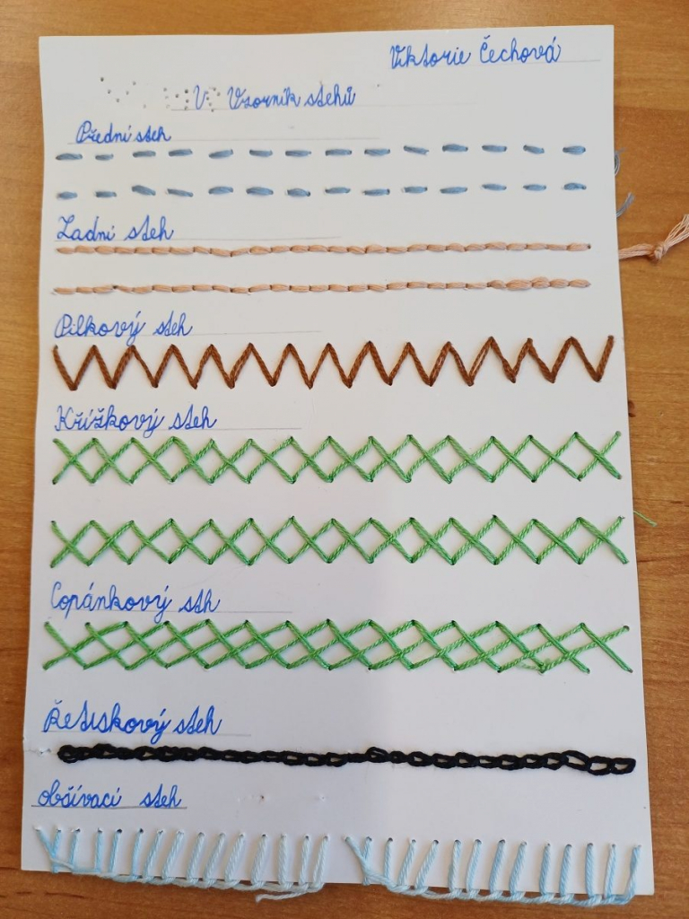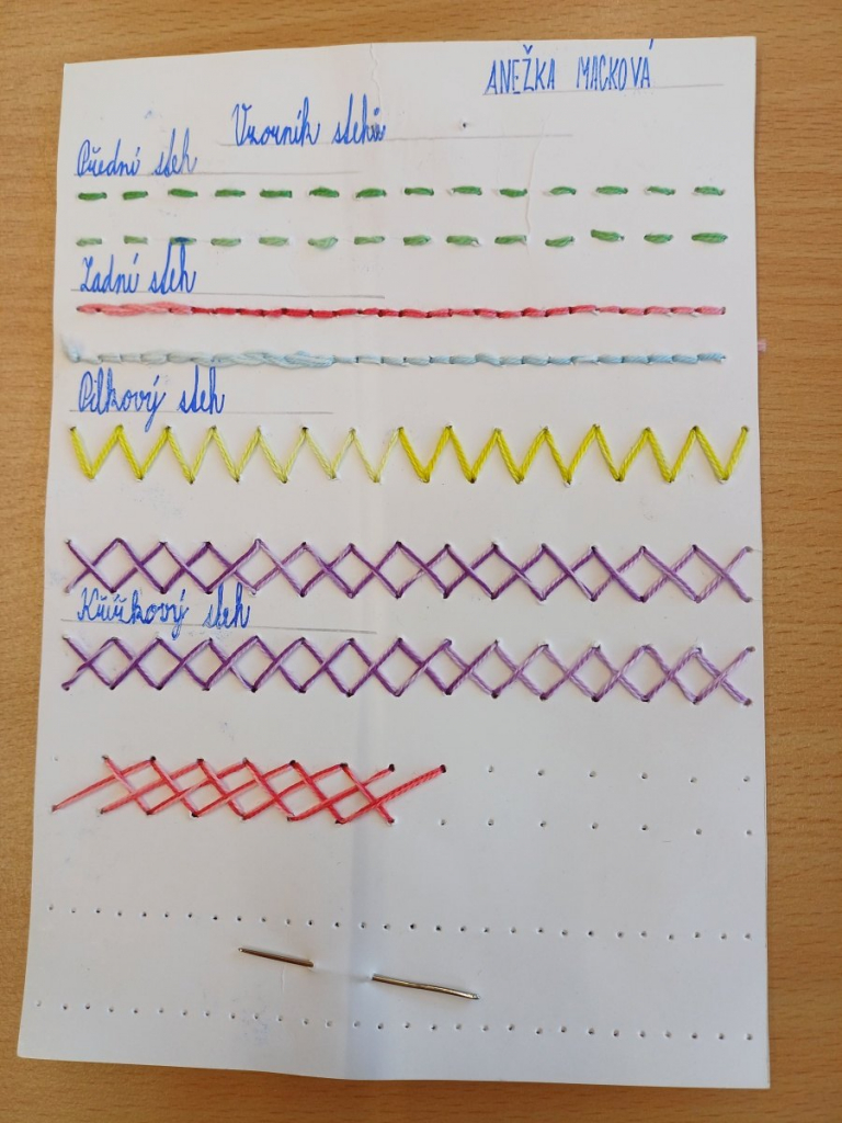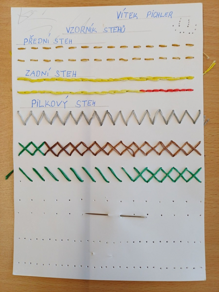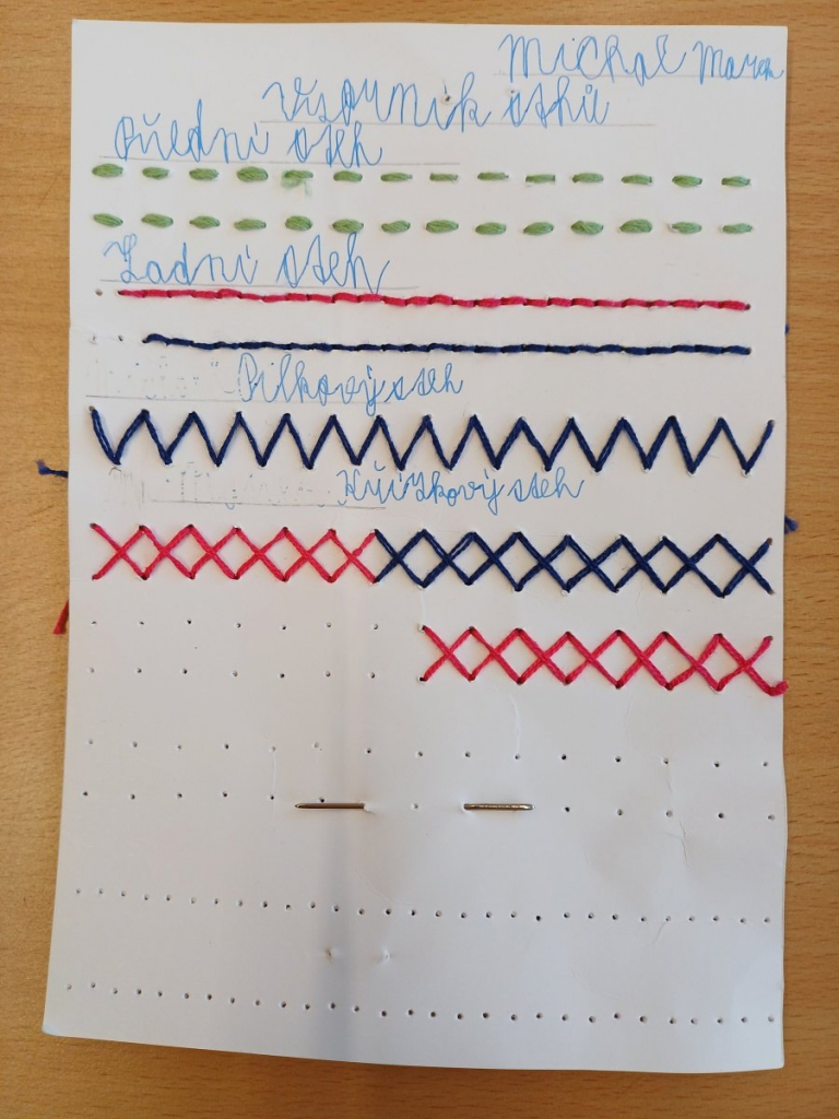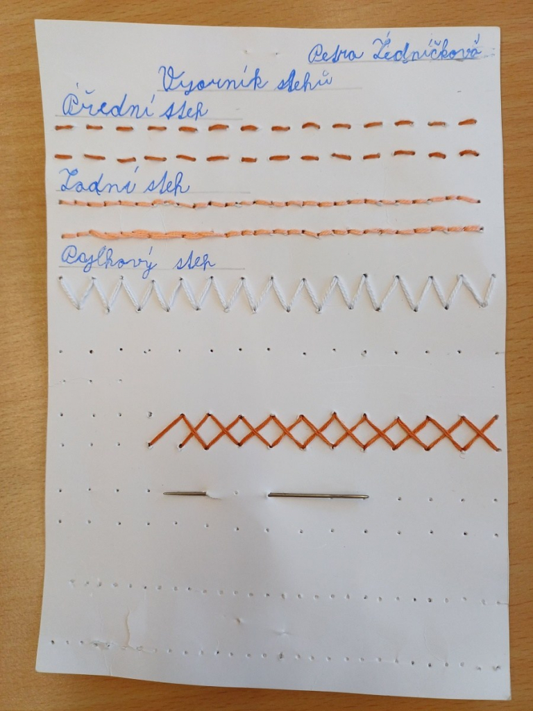 V hodinách praktických činností jsme si tedy také vyzkoušeli práci s jehlou a barevnou přízí. Každý žák si vytvořil vlastní vzorník stehů. Děti se seznámily se základními druhy: předním, zadním, pilkovým, křížkovým, obšívacím i s trochu zdobnějšími, jako je řetízkový nebo copánkový steh.