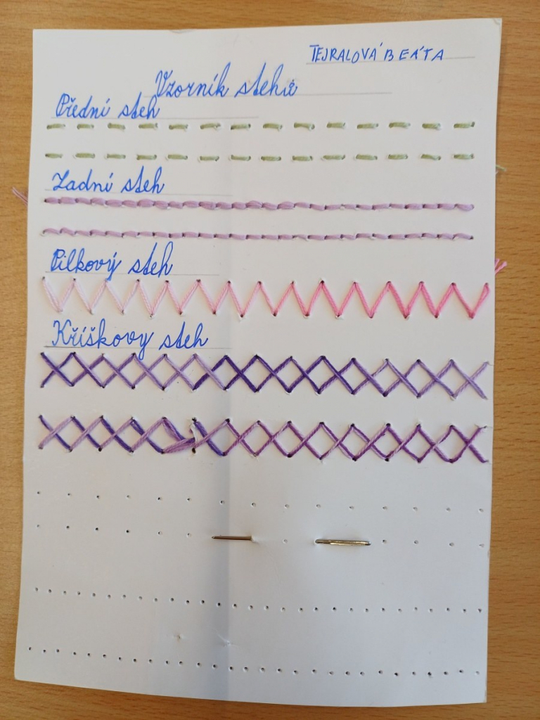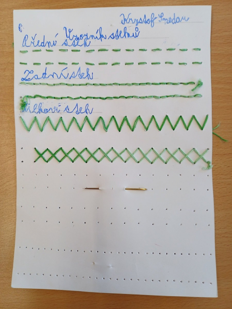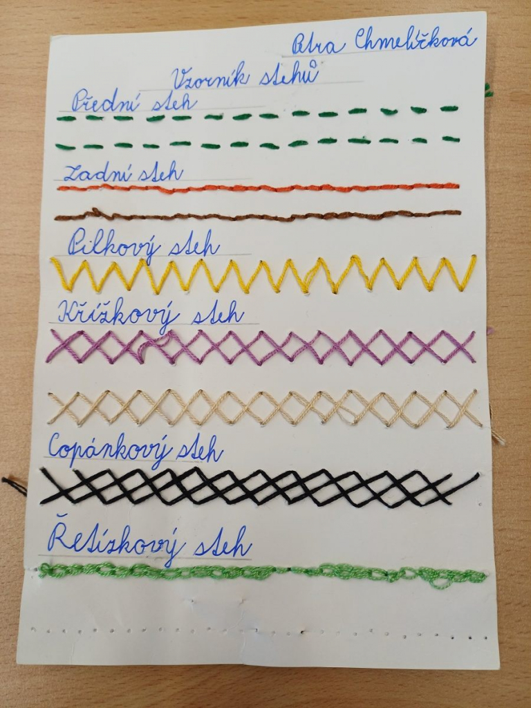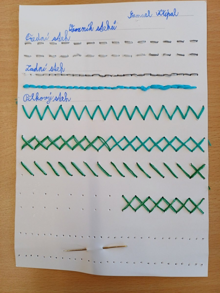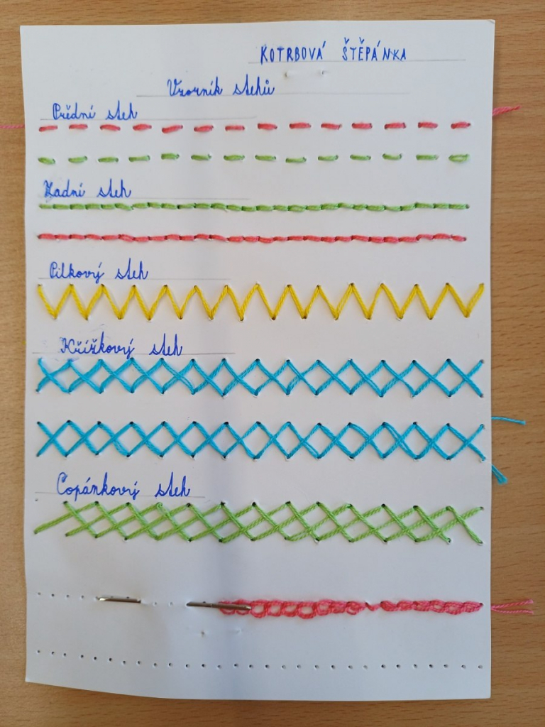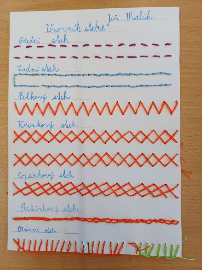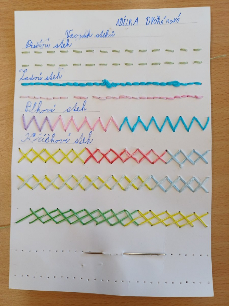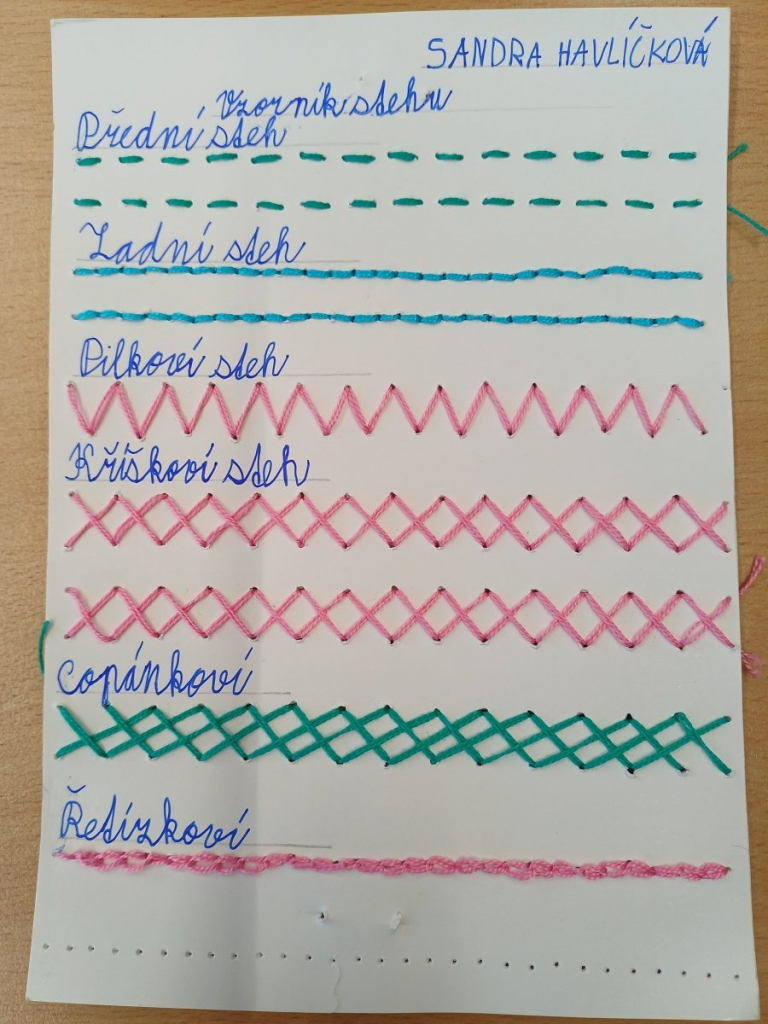 V hodinách praktických činností jsme si tedy také vyzkoušeli práci s jehlou a barevnou přízí. Každý žák si vytvořil vlastní vzorník stehů. Děti se seznámily se základními druhy: předním, zadním, pilkovým, křížkovým, obšívacím i s trochu zdobnějšími, jako je řetízkový nebo copánkový steh.