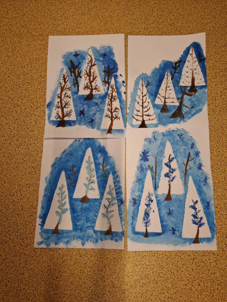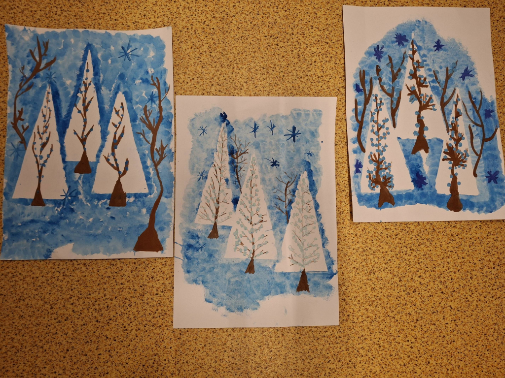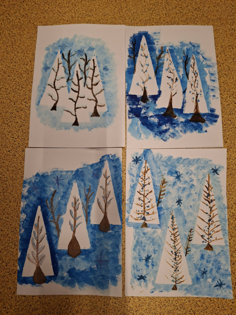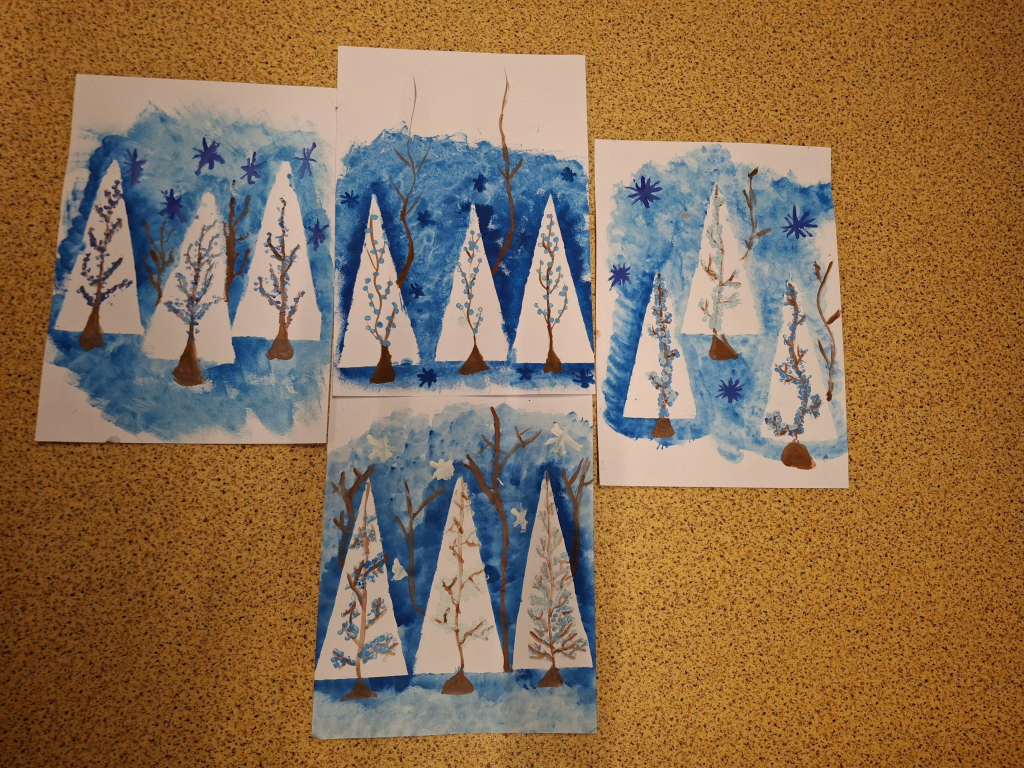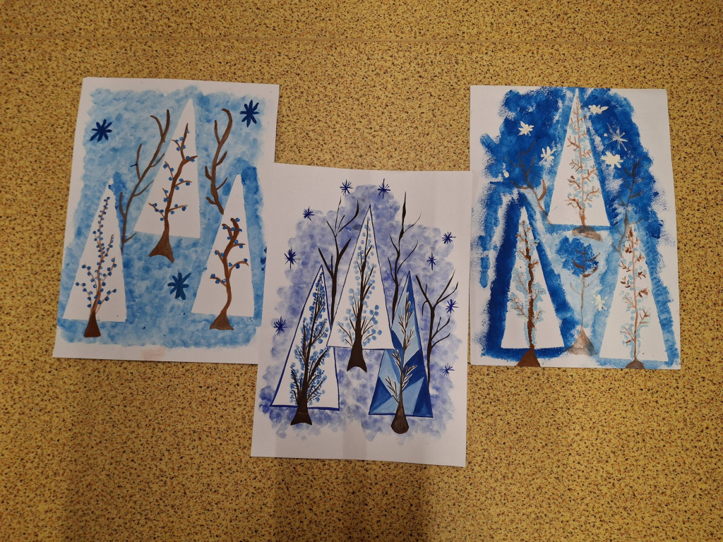 Žáci si nejprve připravili vlastní matrice z tvrdšího papíru – především ve tvaru trojúhelníků, které následně využili jako základ pro zimní stromy. Tyto geometrické tvary sloužily jako jednoduchý, ale funkční prvek, díky němuž vznikly stylizované jehličnany rozeseté po zasněžené krajině. Otisky se prováděly pomocí houbiček a temperových barev. Každý strom získal originální strukturu i odstín.