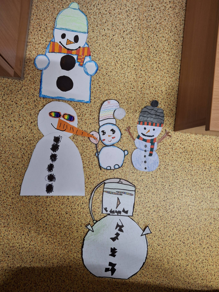 V praktických činnostech si děti nakreslily také klasické zimní motivy - sněhuláky a vločky.