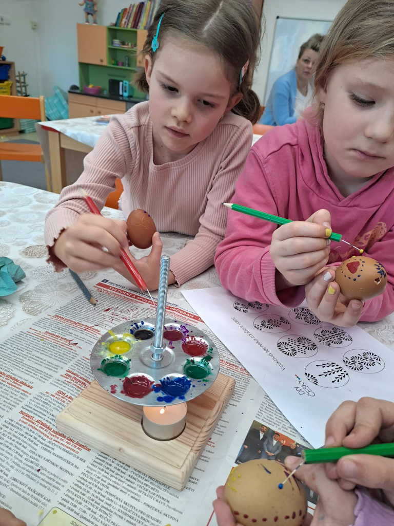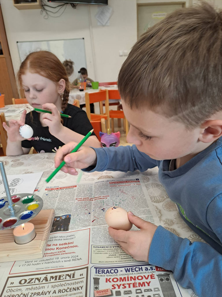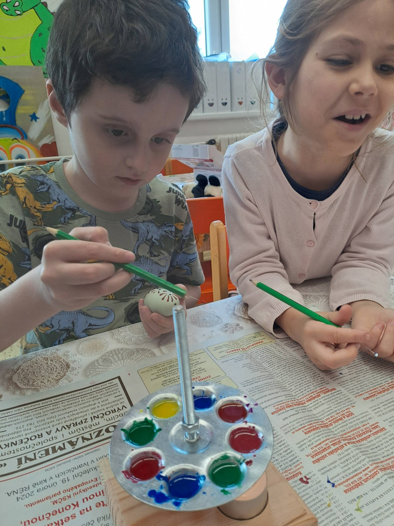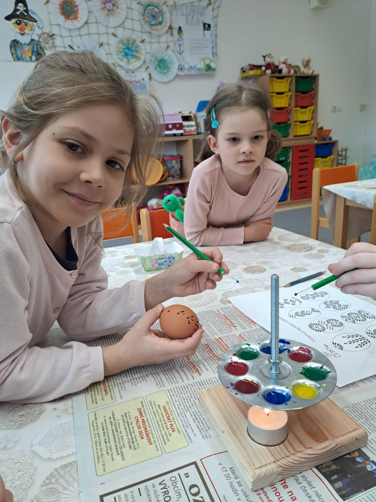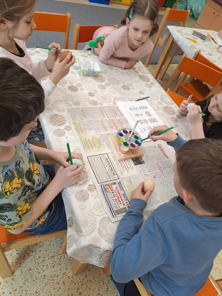 Konec března a začátek dubna jsme věnovali velikonočnímu tvoření. Děti si vyrobily originální košíčky ve tvaru zajíčků a slepiček a vyzkoušely si také tradiční malování vajíček voskem. Tato technika je velmi zaujala, práce s voskem je bavila a vznikly krásné velikonoční výrobky.
