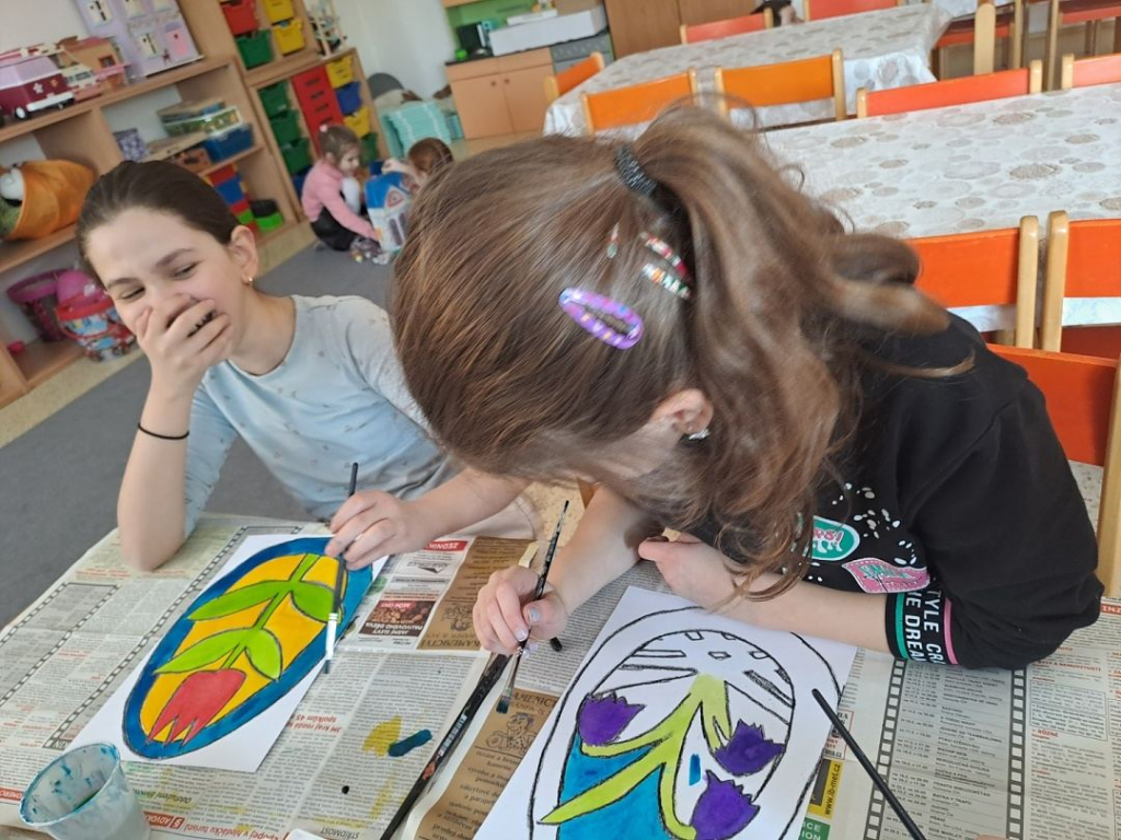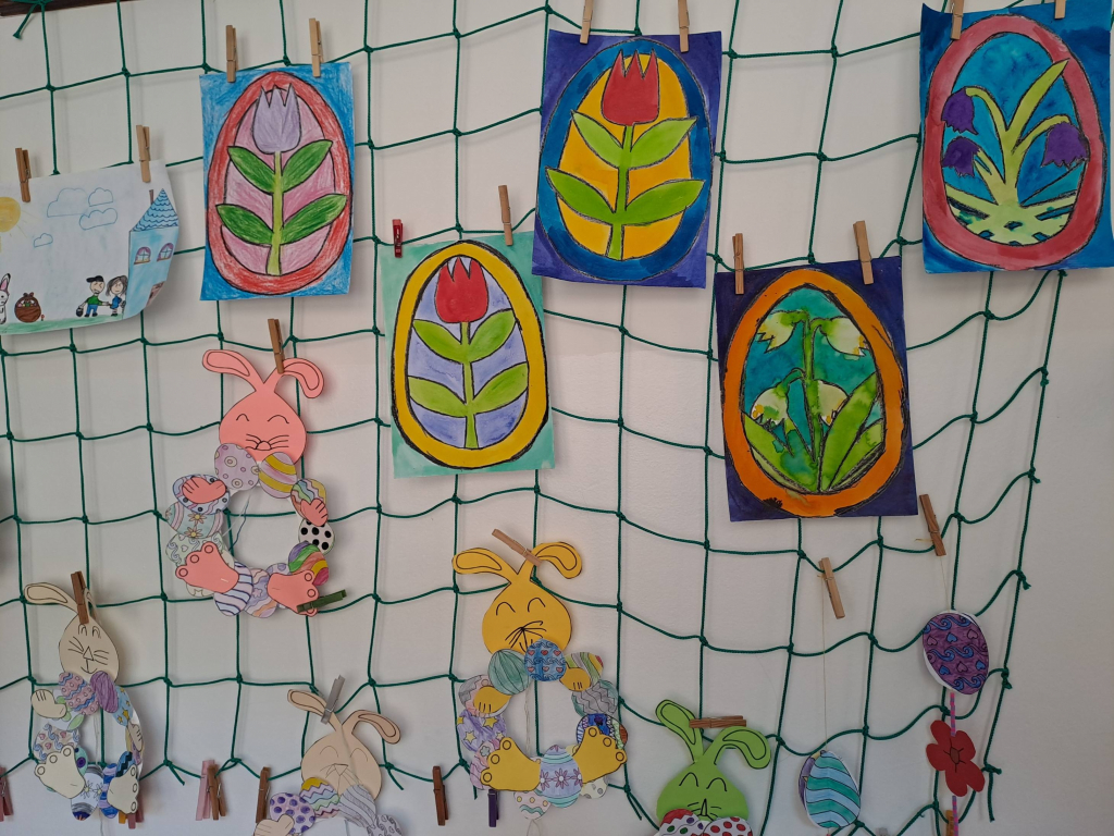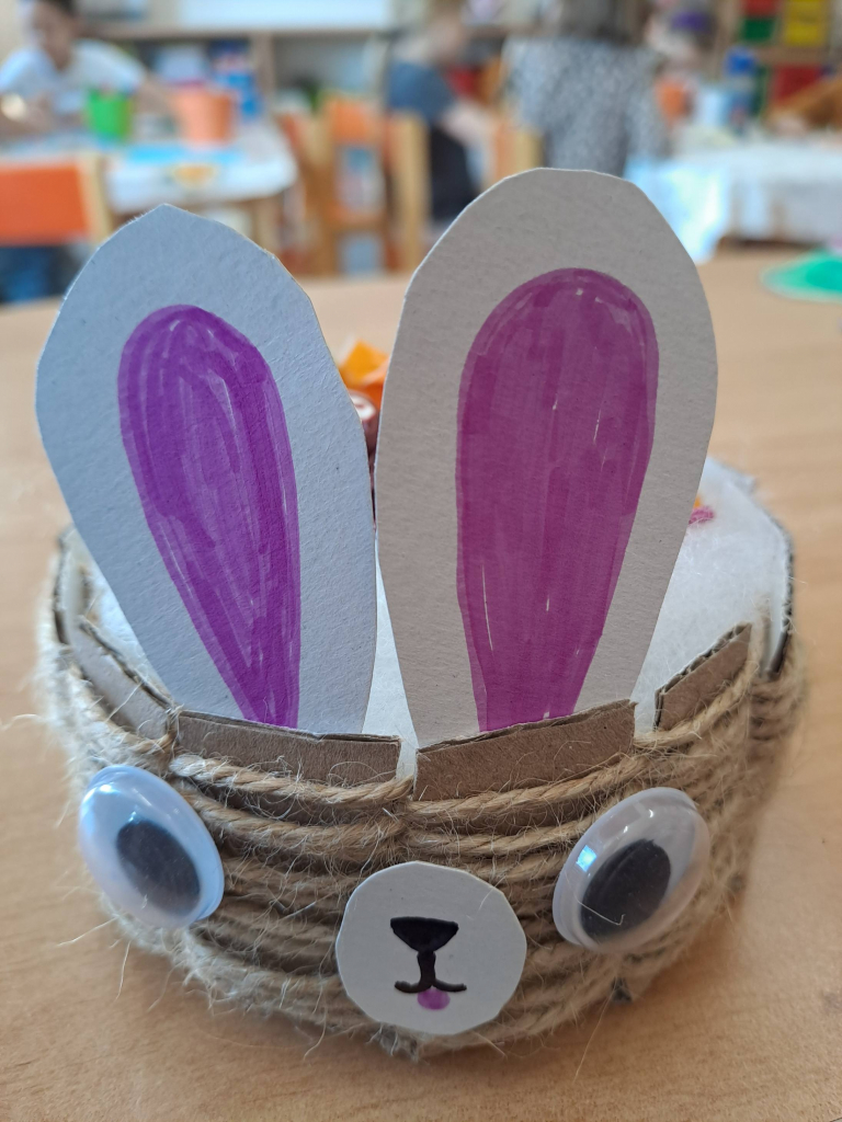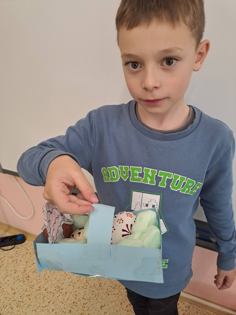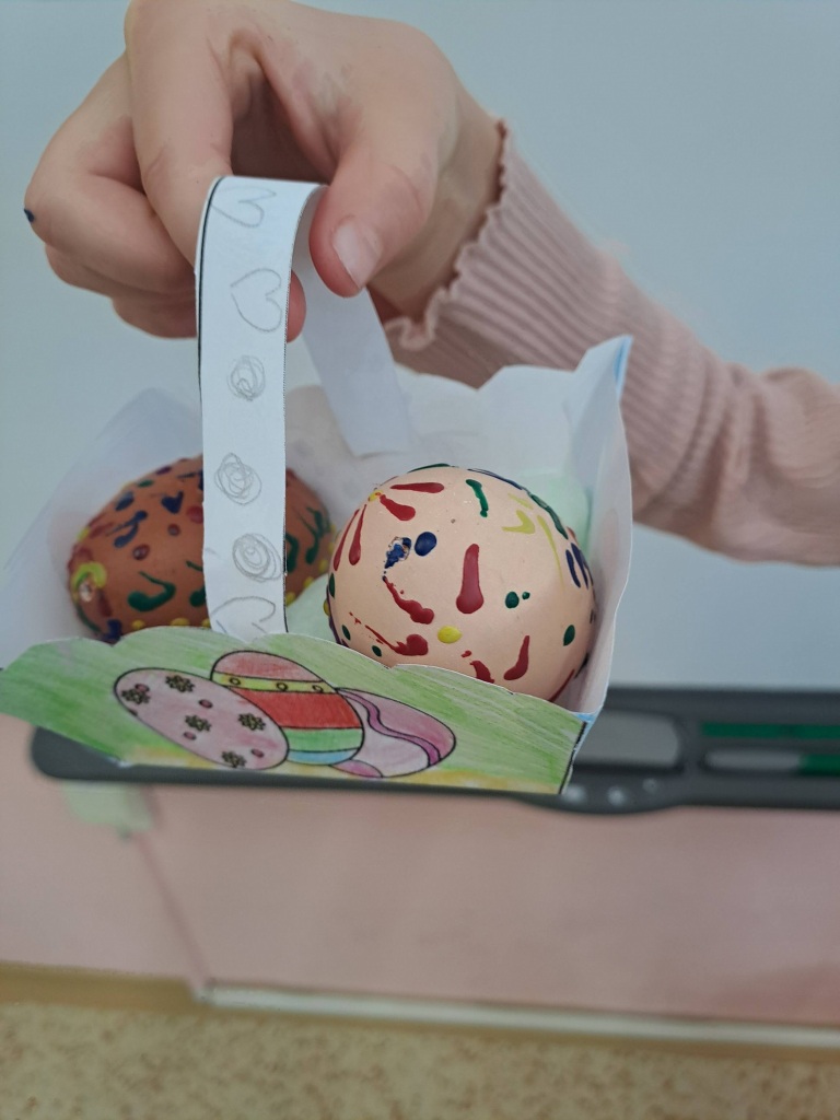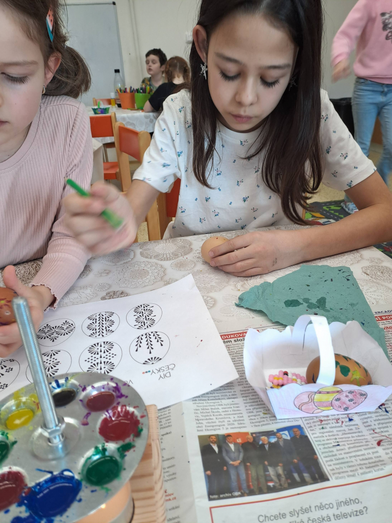 Konec března a začátek dubna jsme věnovali velikonočnímu tvoření. Děti si vyrobily originální košíčky ve tvaru zajíčků a slepiček a vyzkoušely si také tradiční malování vajíček voskem. Tato technika je velmi zaujala, práce s voskem je bavila a vznikly krásné velikonoční výrobky.