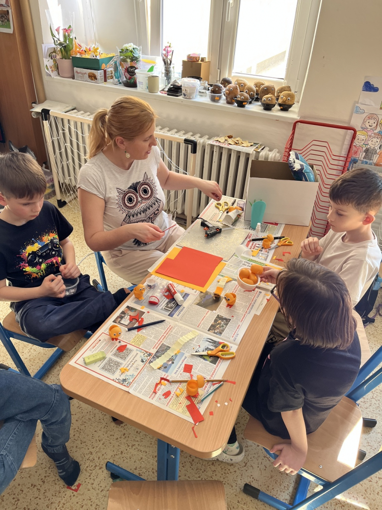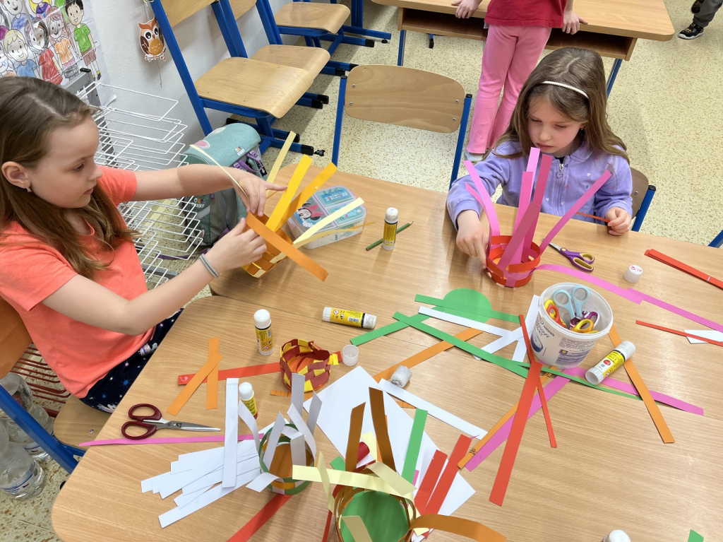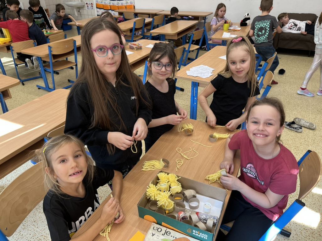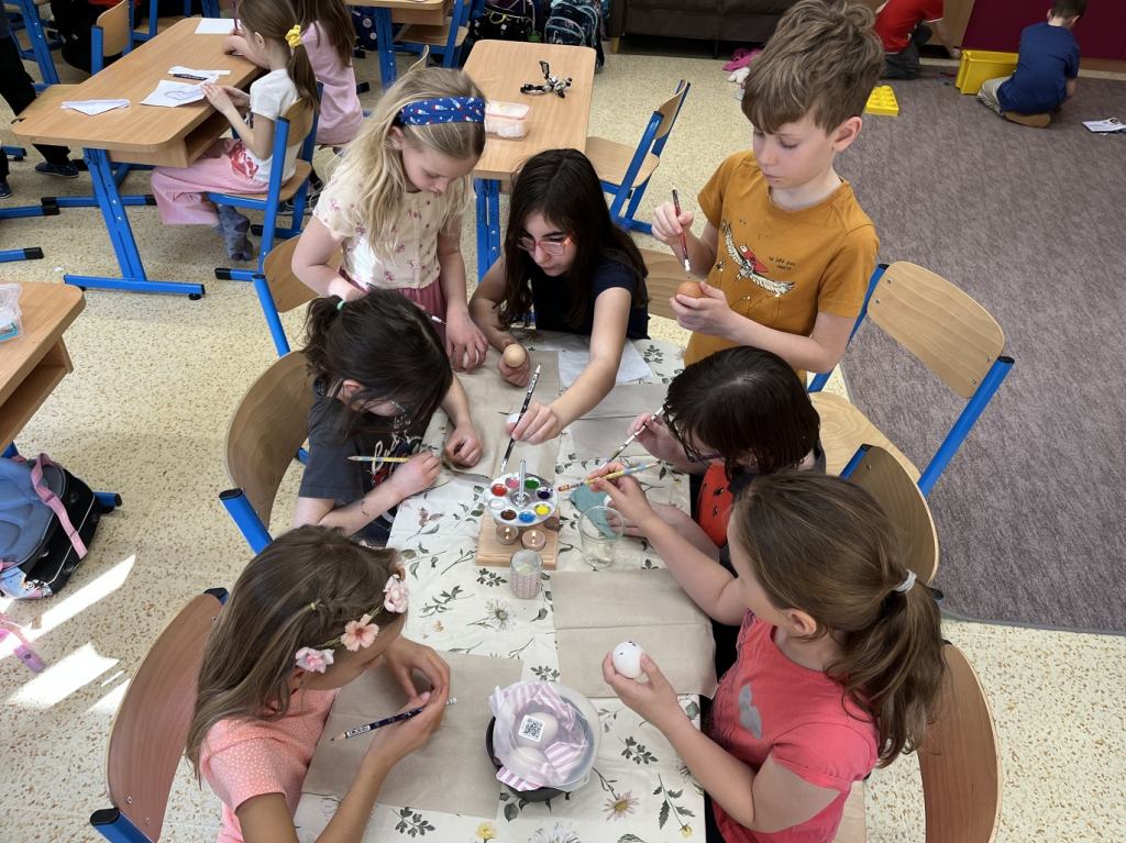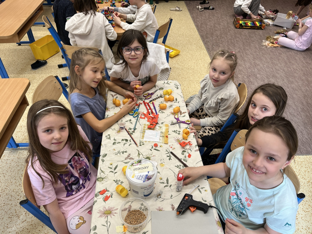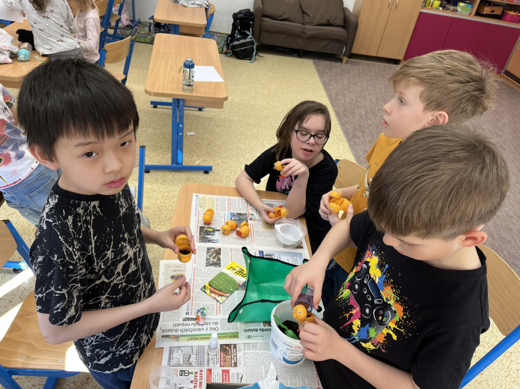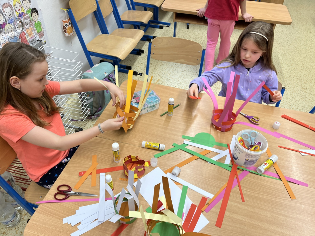 V březnu jsme v družině prožili spoustu tvořivých a veselých chvil. Děti si společně hrály a vyráběly dekorace na velikonoční jarmark i pro sebe. Vytvořily roztomilá kuřátka, panáčky s hlavami, kterým narostly vlasy z trávy, a také kuřátka z kinder vajíček. Sázeli jsme řeřichu, malovali kraslice a vyráběli košíčky na vajíčka. Nechybělo ani malování sádrových odlitků, které děti velmi bavilo. Když bylo pěkné počasí, trávili jsme čas venku na hřišti, kde si děti užily pohyb a hry na čerstvém vzduchu.