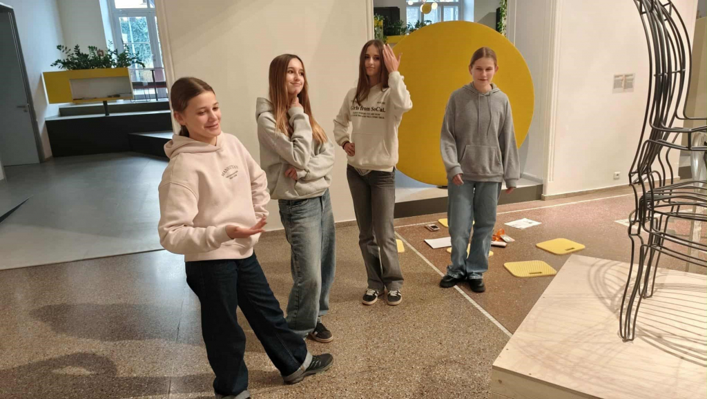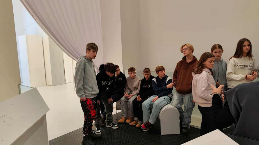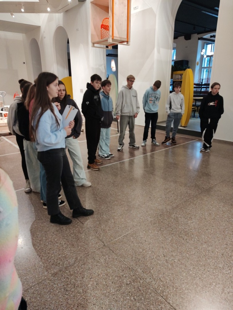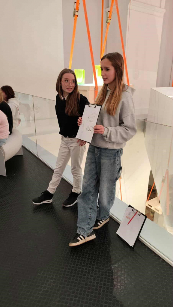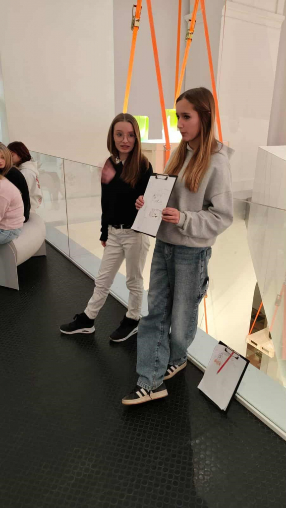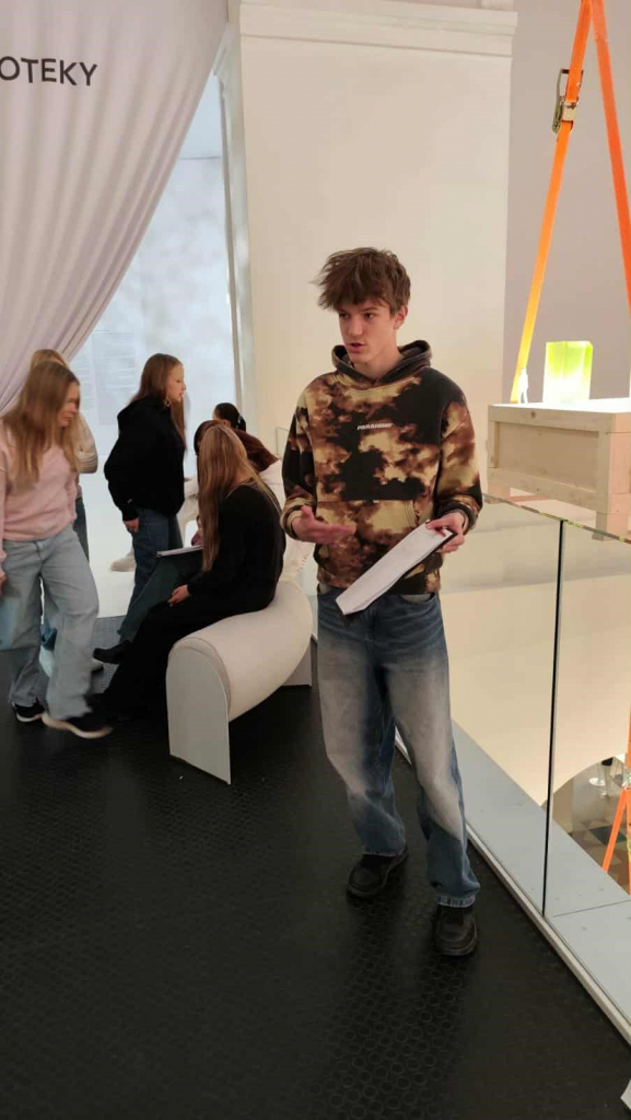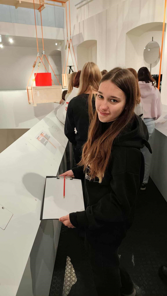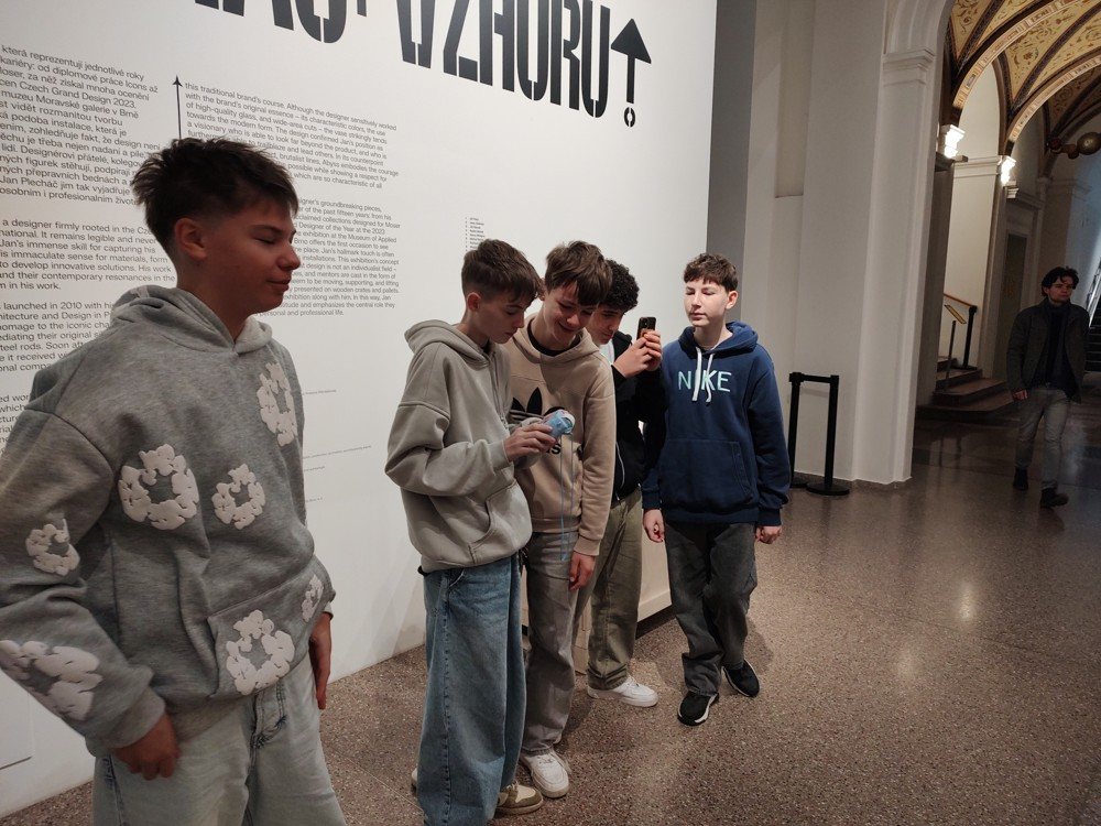 Výstavou nás provedla lektorka muzea, která zároveň v průběhu výkladu zadávala žákům rozděleným do týmů různé úkoly: zjistit, z jakého materiálu byly vystavené produkty vyrobeny, seznámit se s tvorbou dalších designérů, zaujmout pozici malé figurky z výstavy a vyfotit se termofotoaparátem a na závěr vymyslet v týmu nový designový produkt a představit ho ostatním. Celou dobu týmy vše zaznamenávaly do pracovních listů, buď formou zápisu, kresbou nebo fotografickým záznamem.