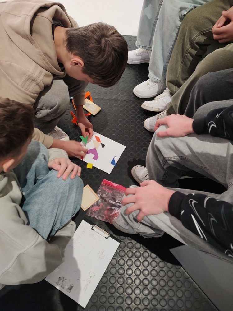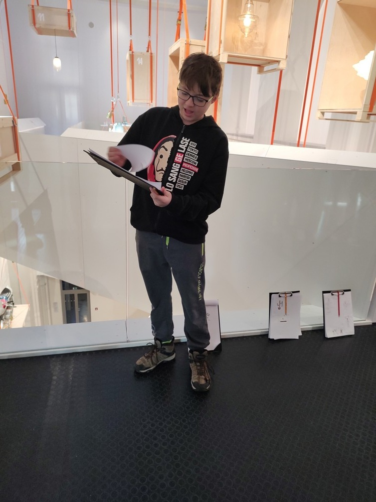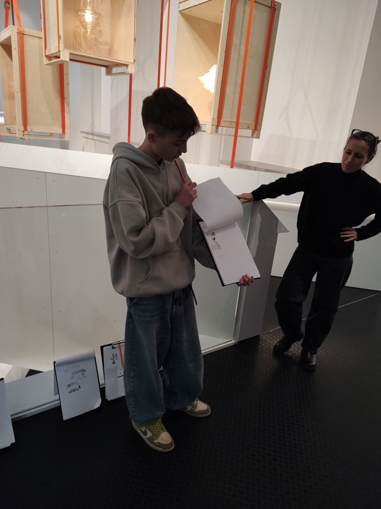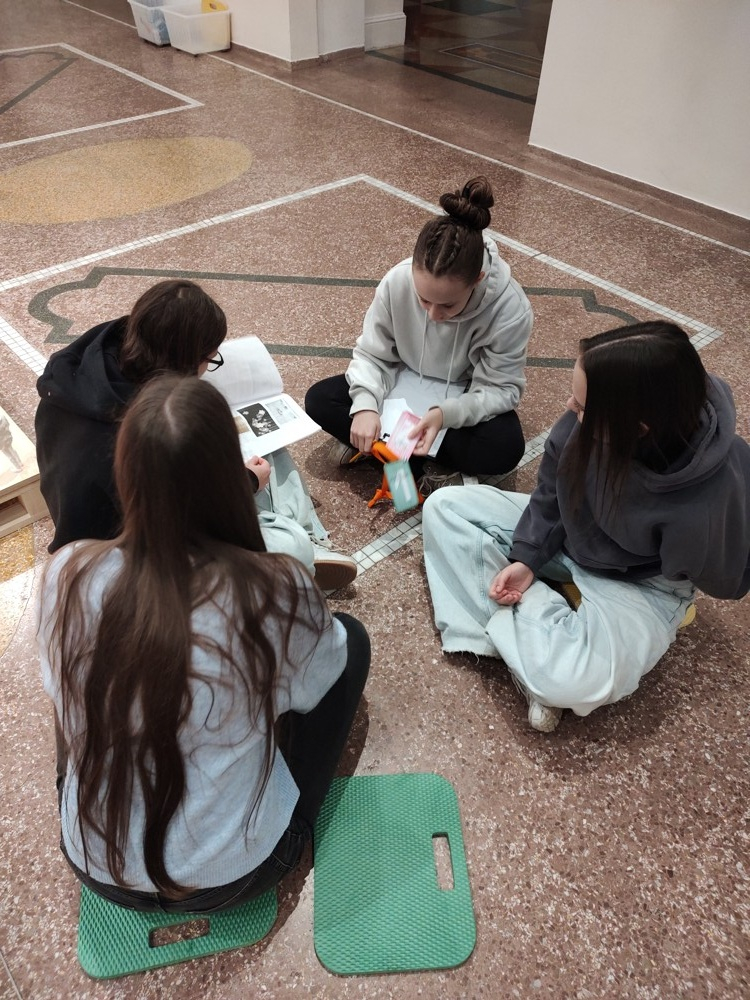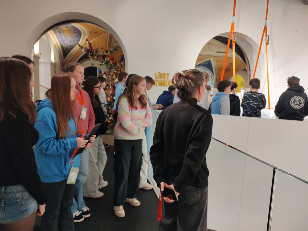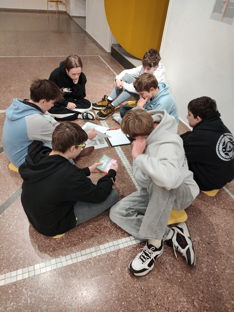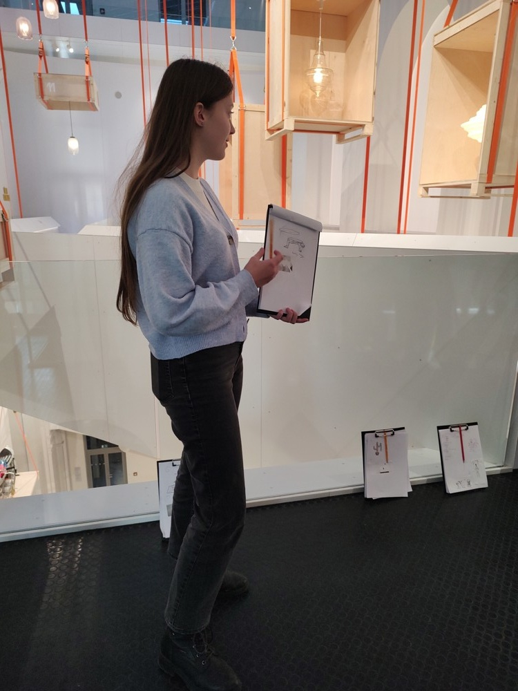 Výstavou nás provedla lektorka muzea, která zároveň v průběhu výkladu zadávala žákům rozděleným do týmů různé úkoly: zjistit, z jakého materiálu byly vystavené produkty vyrobeny, seznámit se s tvorbou dalších designérů, zaujmout pozici malé figurky z výstavy a vyfotit se termofotoaparátem a na závěr vymyslet v týmu nový designový produkt a představit ho ostatním. Celou dobu týmy vše zaznamenávaly do pracovních listů, buď formou zápisu, kresbou nebo fotografickým záznamem.