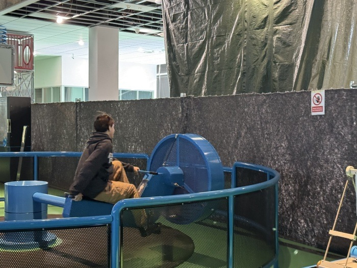 Děti si během dopoledne prohlédly výstavu v patře a sami si mohly vyzkoušet spoustu exponátů a ověřit na nich platnost fyzikálních zákonů.