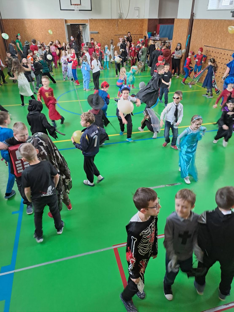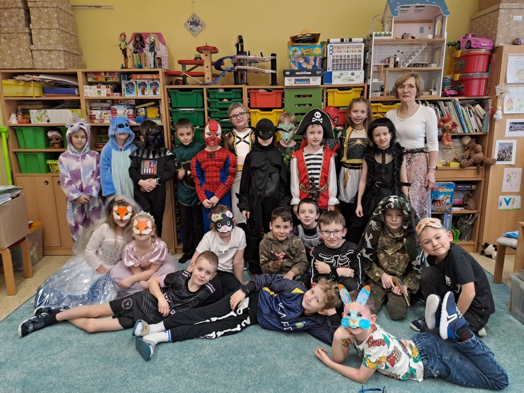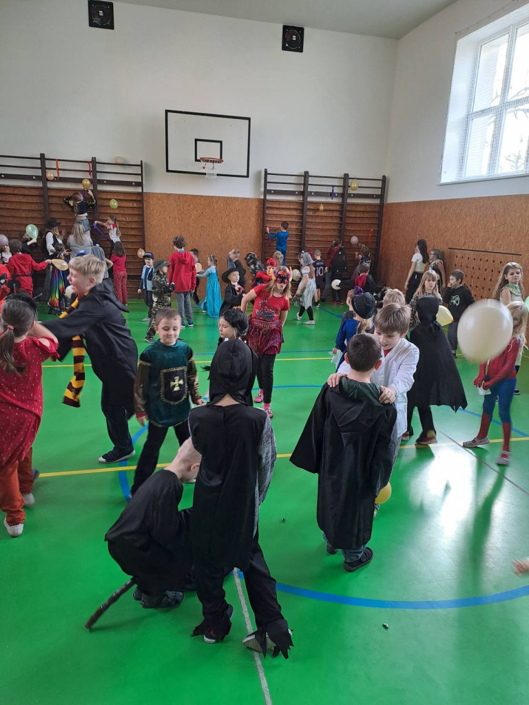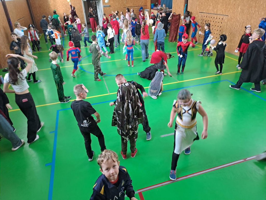 Dne 13. 2. 2026 se tělocvična naší školy proměnila v barevné království masek. Děti ze školní družiny přišly s úsměvem, plné očekávání – a hlavně v úžasných převlecích! Od princezen přes Harryho Pottera a kovboje až po jednoho opravdu přesvědčivého dinosaura.