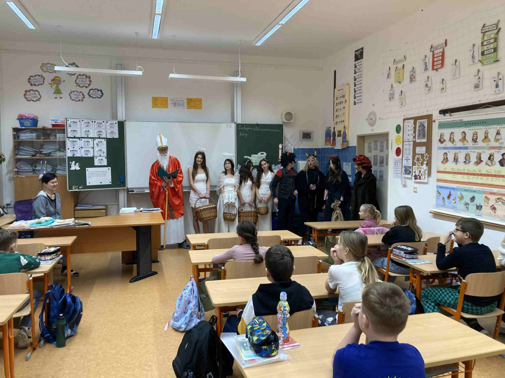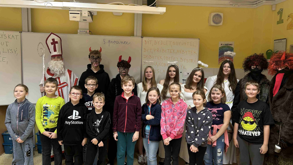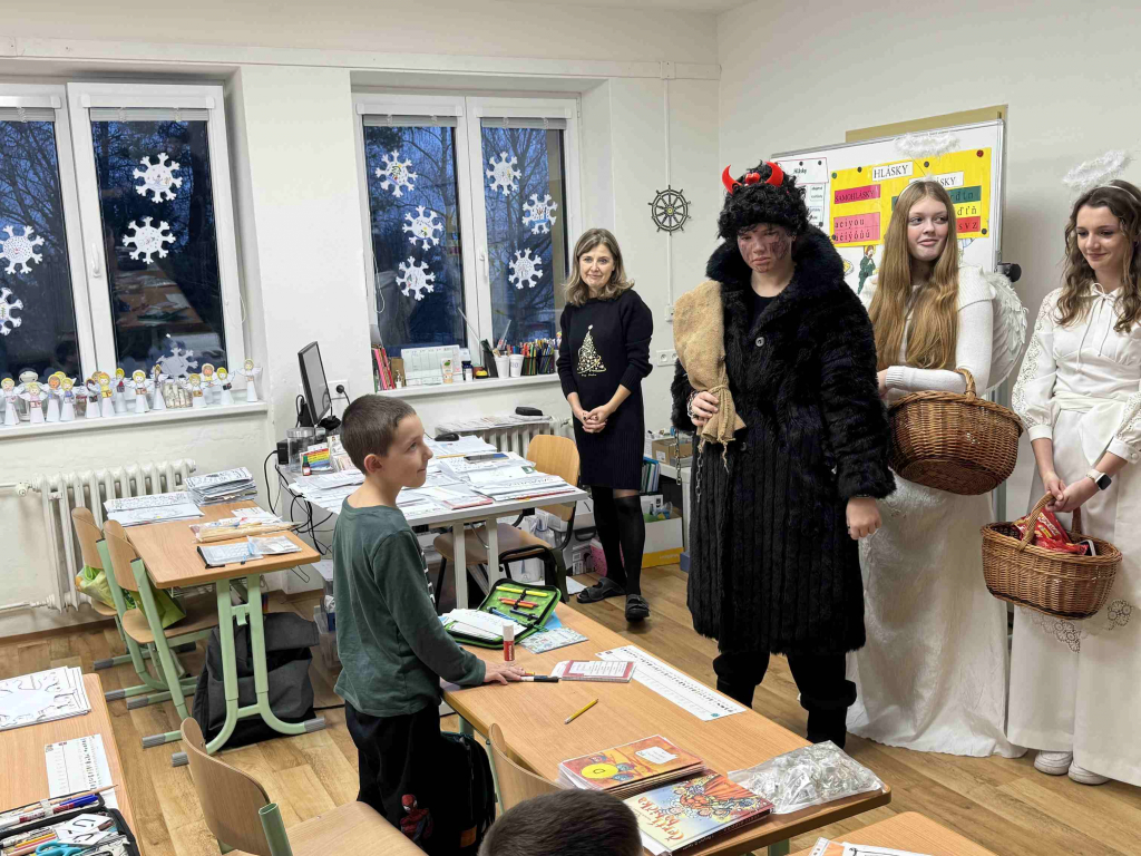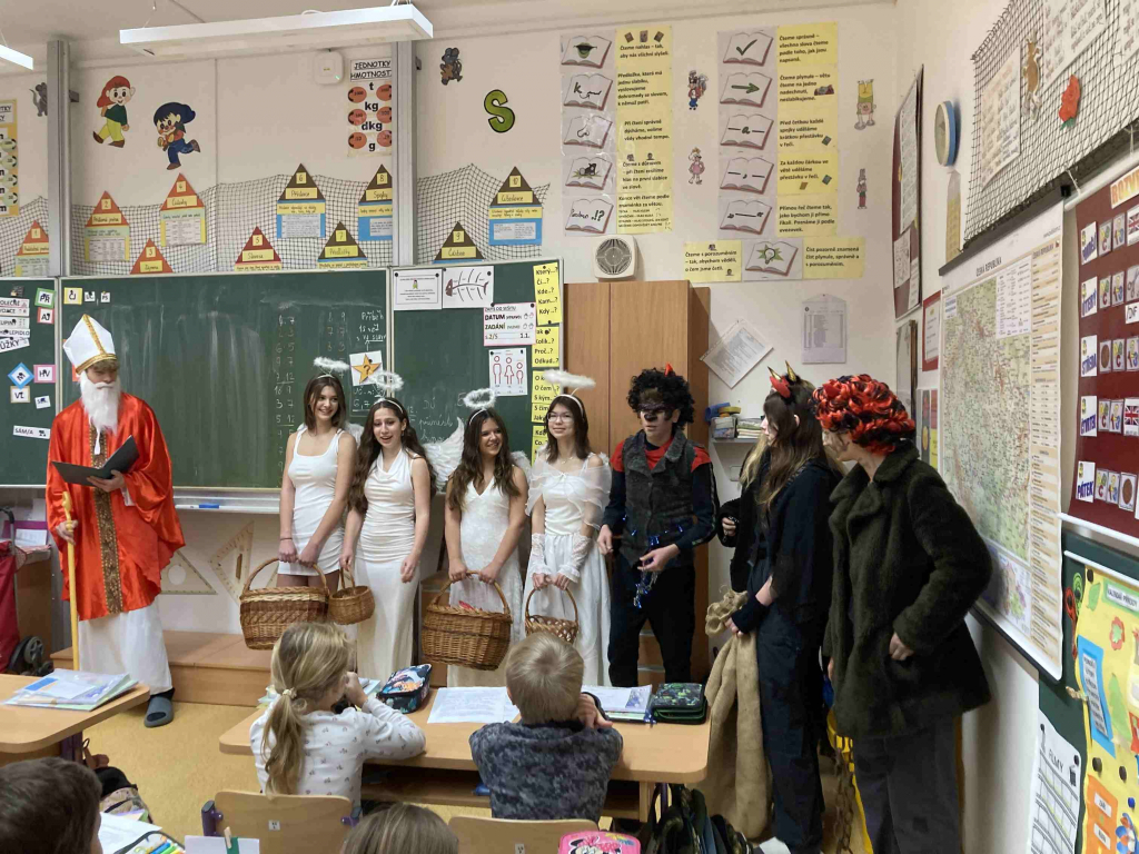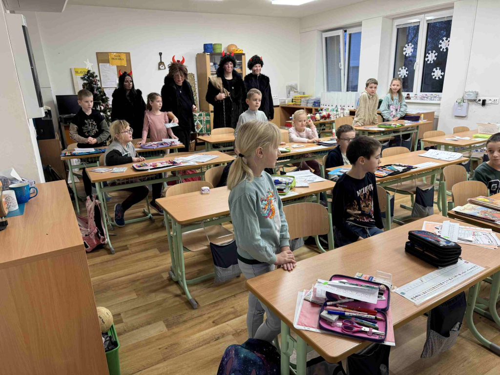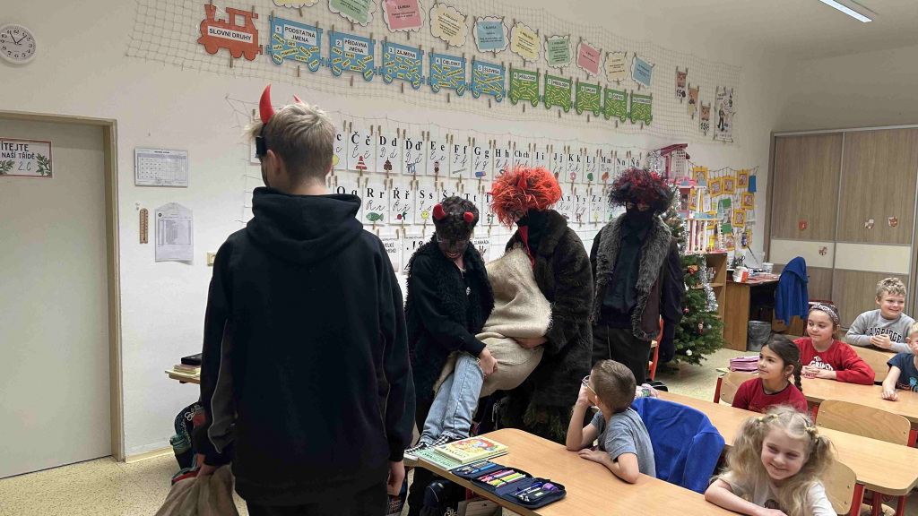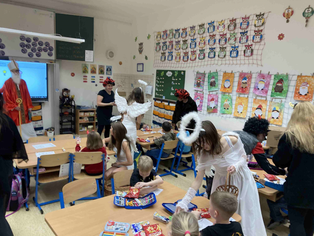 První adventní týden tradičně patří nebeským a pekelným bytostem – Mikulášovi, andělům a čertům. Na 1. stupni se hned od rána rozezněl cinkot zvonků, řinčení řetězů a ťukání mikulášské berly. Přišel čas sečíst hříchy za minulý rok. A že měly některé děti nahnáno.