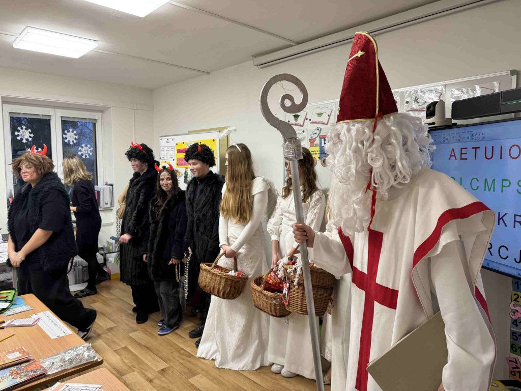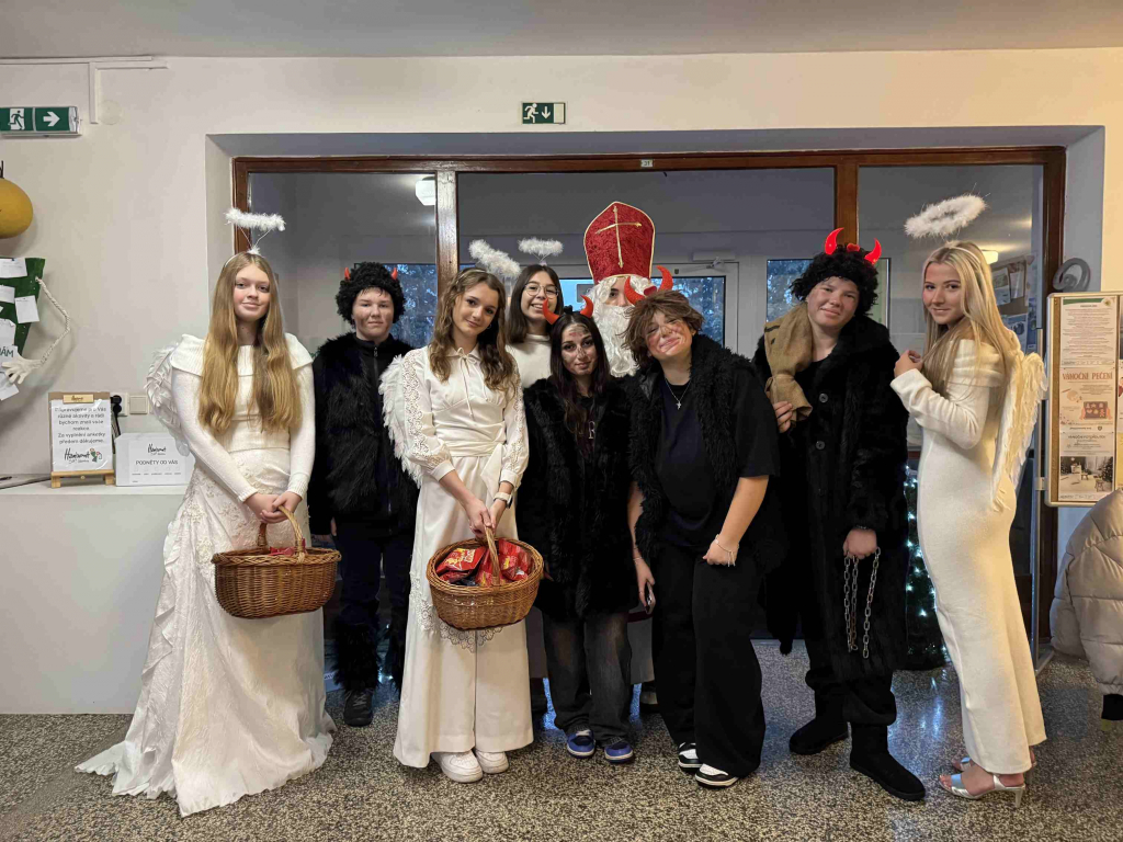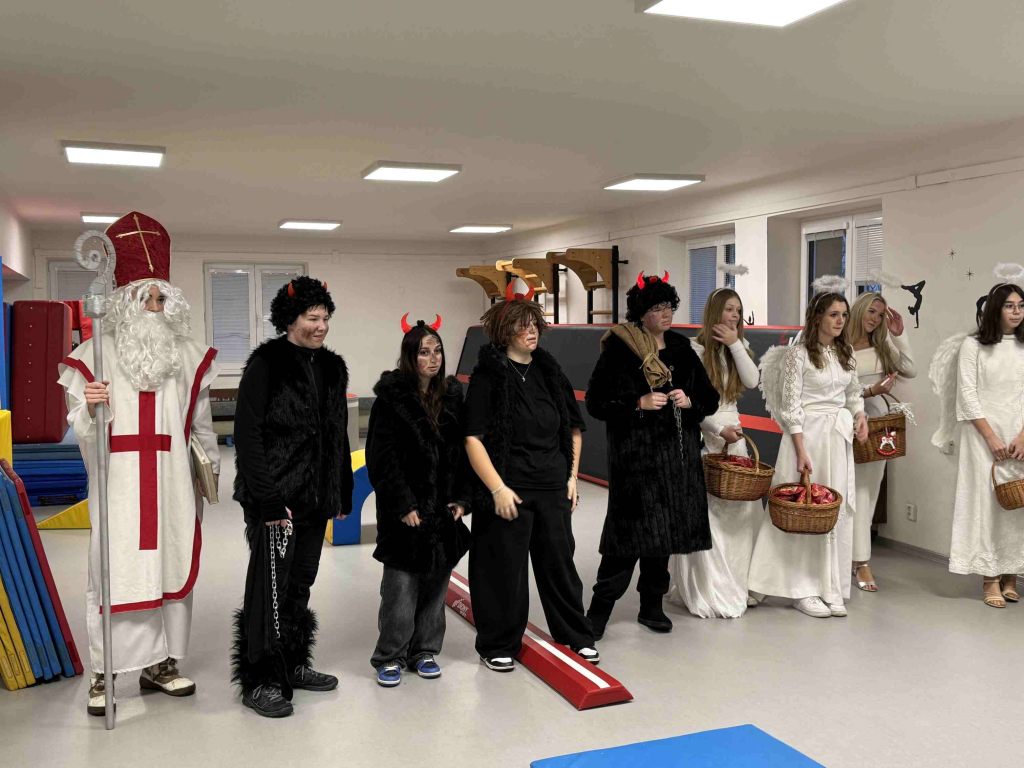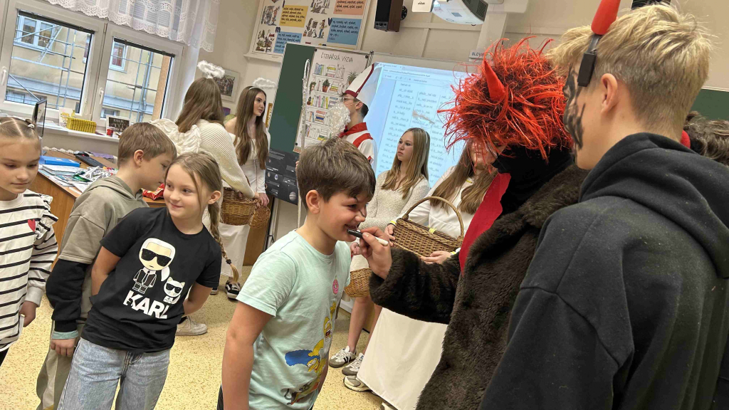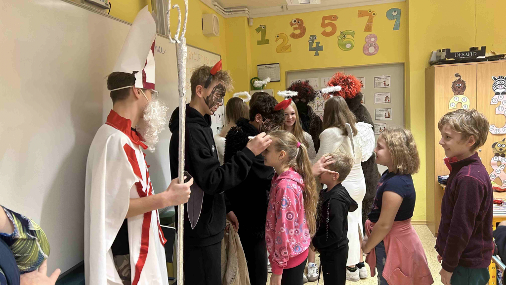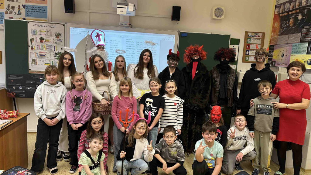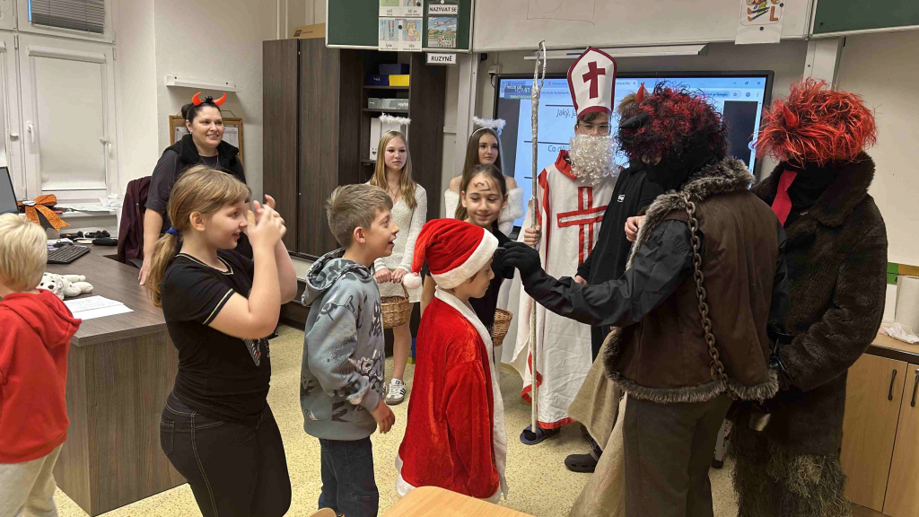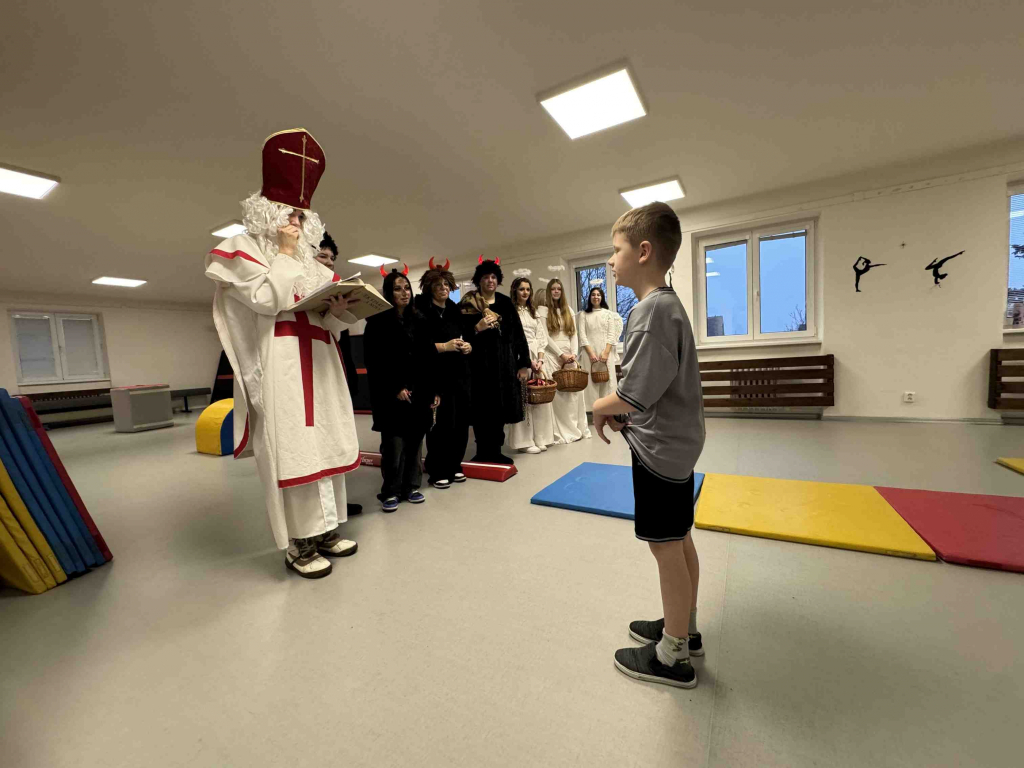 První adventní týden tradičně patří nebeským a pekelným bytostem – Mikulášovi, andělům a čertům. Na 1. stupni se hned od rána rozezněl cinkot zvonků, řinčení řetězů a ťukání mikulášské berly. Přišel čas sečíst hříchy za minulý rok. A že měly některé děti nahnáno.