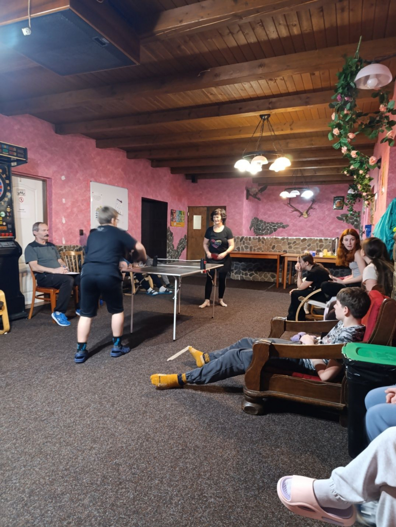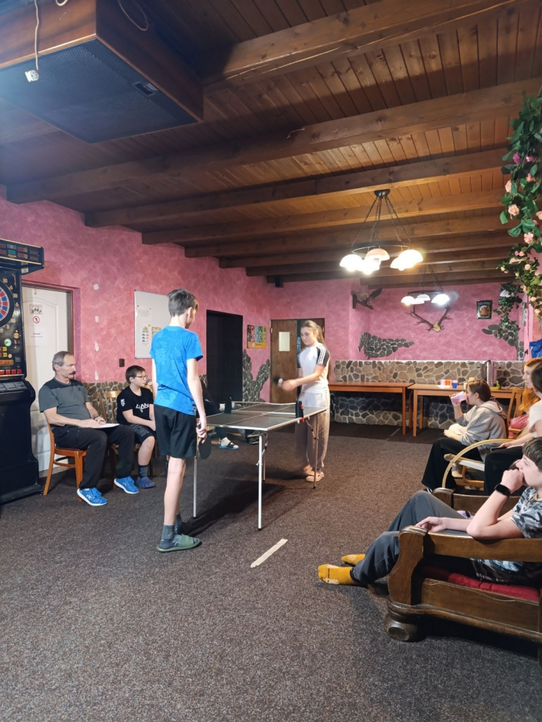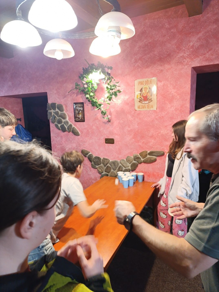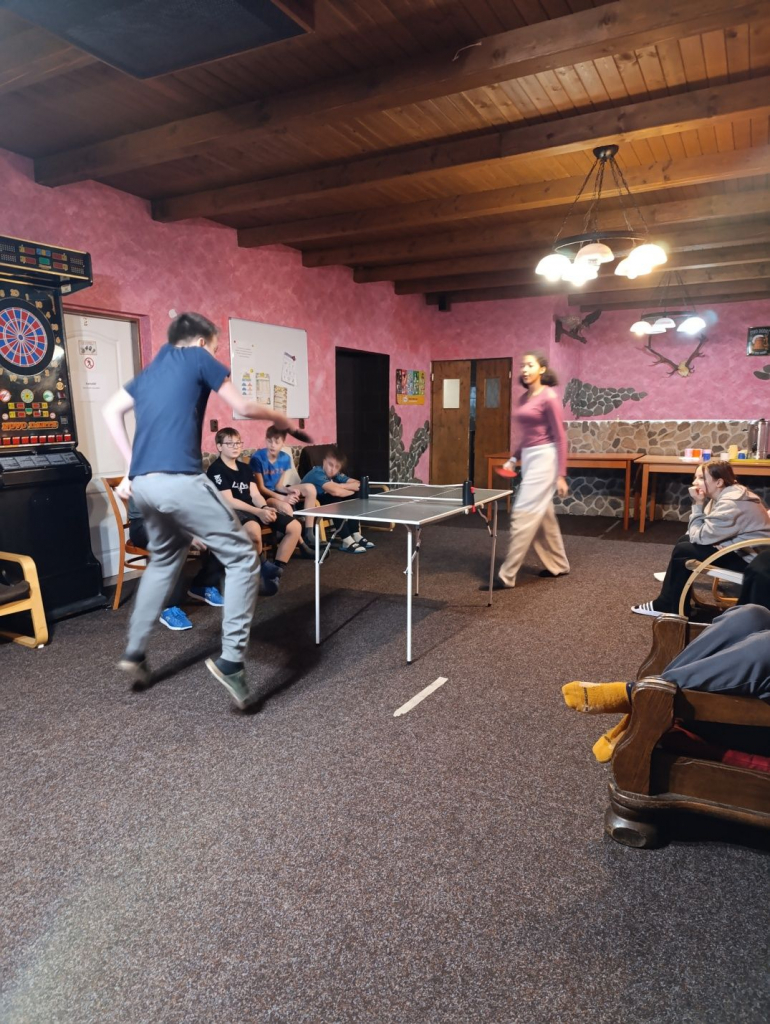 Večery na Brněnce rozhodně nebyly o spaní v devět. Rozjeli jsme maraton kvízů, her a ping-pongových bitev, kde se pálky jen míhaly. Všechno to pak bouchlo poslední večer na závěrečné diskotéce. Taneční kreace některých spolužáků (i učitelů!) by zasloužily vlastní dokument na Netflixu.