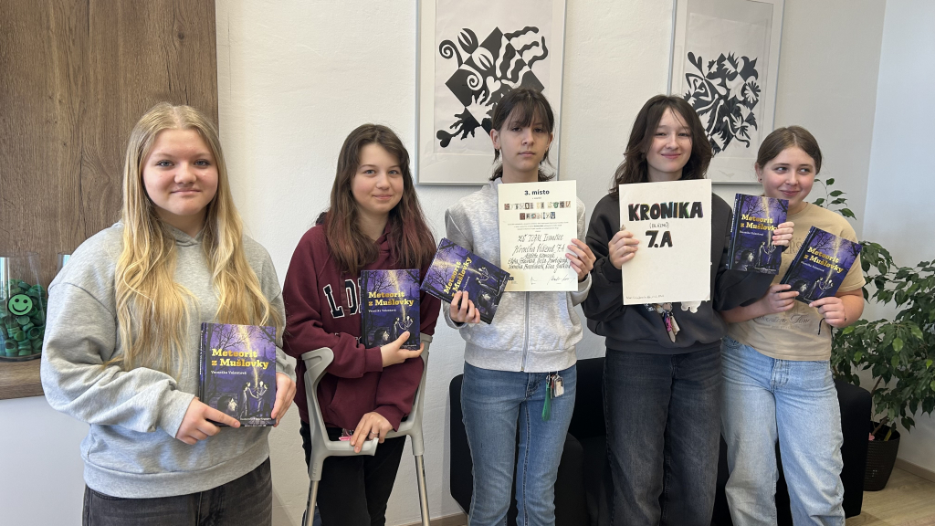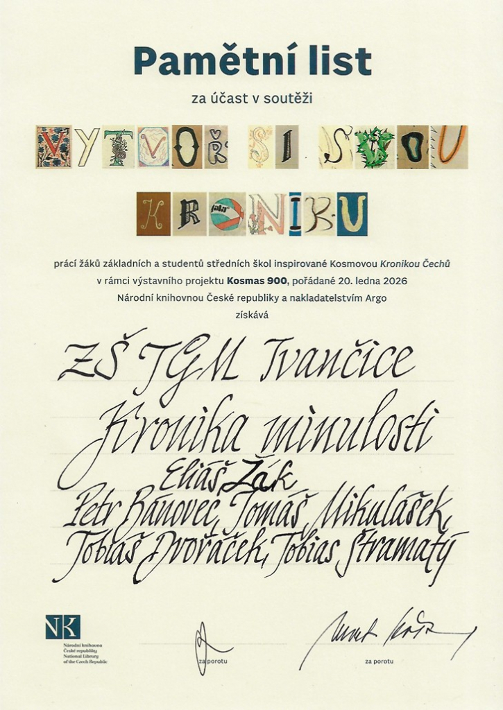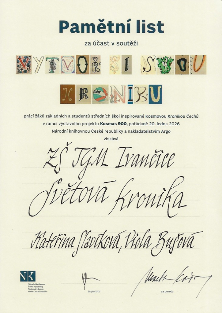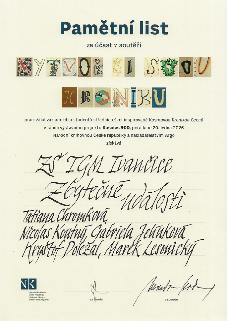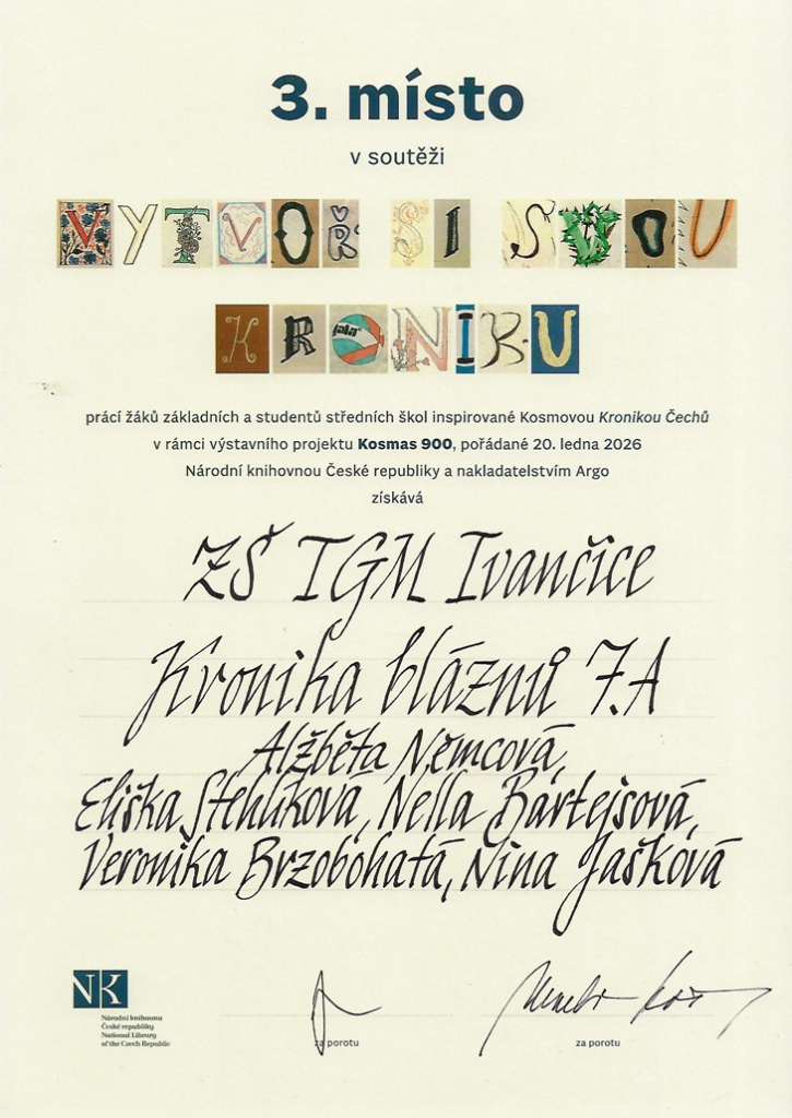 Tvůrčí skupina žákyň VII. A ve složení Veronika Brzobohatá, Nella Bartejsová, Alžbeta Němcová, Nina Jašková a Eliška Stehlíková získaly 3. místo v literárně-výtvarné soutěži Vytvoř si svou kroniku, kterou pro žáky a studenty z celé naší republiky vyhlásila Národní knihovna Praha k 900. výročí kronikáře Kosmy.